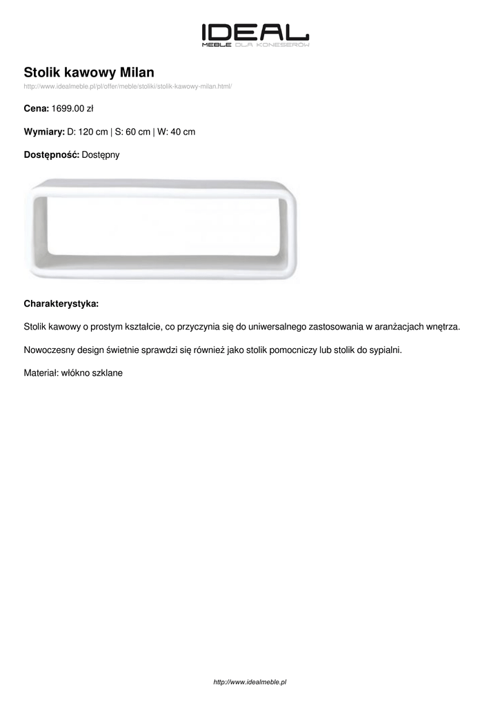 Stolik kawowy Milan http://www.idealmeble.pl/pl/offer/meble/stoliki/stolik-kawowy-milan.html/ Cena: 1699.00 zł Wymiary: D: 120 cm | S: 60 cm | W: 40 cm Dostępność: Dostępny Charakterystyka: Stolik kawowy o prostym kształcie, co przyczynia się do uniwersalnego zastosowania w aranżacjach wnętrza. Nowoczesny design świetnie sprawdzi się również jako stolik pomocniczy lub stolik do sypialni. Materiał: włókno szklane http://www.idealmeble.pl Dostępne wersje produktu: nazwa produktu warianty Stolik kawowy Milan kolor biały st cena 1699.00zł dostępne Zapytaj Stolik kawowy Milan kolor czarny 1699.00zł Dostępny Stolik kawowy Milan kolor biały 1699.00zł Zapytaj http://www.idealmeble.pl Zdjęcia produktu: http://www.idealmeble.pl Powered by TCPDF (www.tcpdf.org)