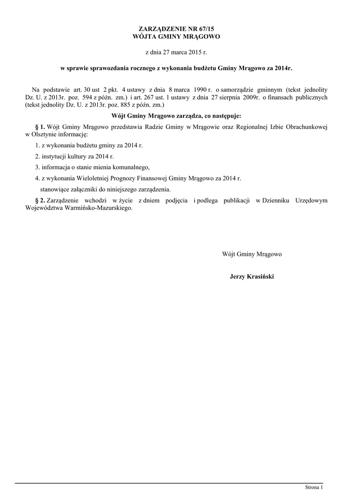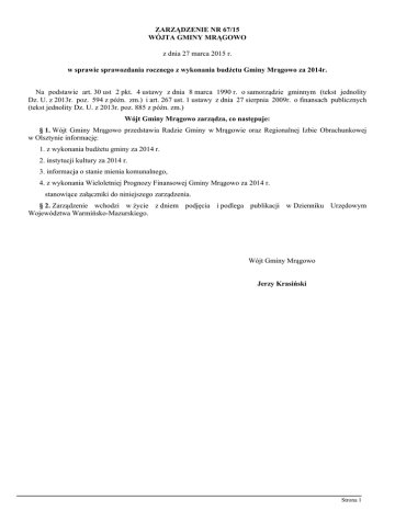 Zarządzenie nr 67/15 Wójta Gminy Mrągowo z dnia 27 marca 2015 r