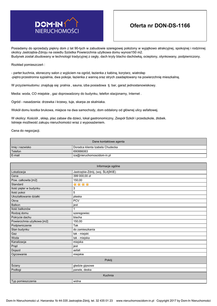 Oferta nr DON-DS-1166 Posiadamy do sprzedaży piękny dom z lat 90-tych w zabudowie szeregowej położony w wyjątkowo atrakcyjnej, spokojnej i rodzinnej okolicy Jastrzębia-Zdroju na osiedlu Szóstka Powierzchnia użytkowa domu wynosi150 m2. Budynek został zbudowany w technologii tradycyjnej z cegły, dach kryty blacho dachówką, ocieplony, otynkowany, podpiwniczony. Rozkład pomieszczeń : - parter:kuchnia, słoneczny salon z wyjściem na ogród, łazienka z kabiną, korytarz, wiatrołap -piętro:przestronna sypialnia, dwa pokoje, łazienka z wanną oraz strych zaadaptowany na powierzchnię mieszkalną. W przyziemiudomu: znajduję się: pralnia , sauna, izba posiadowa tj. bar, garaż jednostanowiskowy. Media: woda, CO miejskie , gaz doprowadzony do budynku, telefon stacjonarny, Internet . Ogród - nasadzenia: drzewka i krzewy, tuje, skarpa ze skalniaka. Wokół domu kostka brukowa, miejsce na dwa samochody, dom oddalony od głównej ulicy asfaltowej. W okolicy: Kościół , sklep, plac zabaw dla dzieci, lokal gastronomiczny, Zespół Szkół i przedszkole, żłobek. Istnieje możliwość zakupu nieruchomości wraz z wyposażeniem. Cena do negocjacji. Dane kontaktowe agenta Imię i nazwisko Telefon E-mail Doradca klienta Izabela Chudecka 690886063 [email protected] Lokalizacja Cena Pow. całkowita [m2] Standard Ilość pięter w budynku Ilość pokoi Ukształtowanie działki Okna Balkon Ilość balkonów Rodzaj domu Pokrycie dachu Powierzchnia użytkowa [m2] Podpiwniczenie Stan budynku Gaz Woda Kanalizacja Prąd Dojazd Ogrzewanie Jastrzębie-Zdrój, (woj. ŚLĄSKIE) 399 000,00 zł 150,00 Informacje ogólne 3 5 płaska PCV jest 1 szeregowiec blacha 150,00 Tak do zamieszkania tak - miejski tak - miejska miejska jest asfalt miejskie Pokój Ściany Podłogi gładzie gipsowe panele, deska Kuchnia Typ pomieszczenia widna Dom-In Nieruchomości ul. Harcerska 1b 44-335 Jastrzębie-Zdrój, tel. 32 435 01 23 www.nieruchomoscidom-in.pl Copyright 2017 by Dom-In Nieruchomości Oferta nr DON-DS-1166 Rodzaj kuchni Podłogi z zabudową kuchenną terakota Łazienka Typ pomieszczenia Ilość Glazura Ściany Podłogi razem z wc 2 starszego typu glazura terakota Dom-In Nieruchomości ul. Harcerska 1b 44-335 Jastrzębie-Zdrój, tel. 32 435 01 23 www.nieruchomoscidom-in.pl Copyright 2017 by Dom-In Nieruchomości