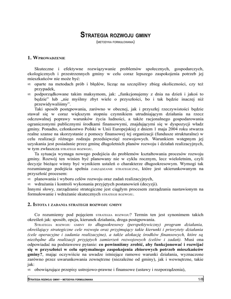 STRATEGIA ROZWOJU GMINY (METODYKA FORMUŁOWANIA) 1. WPROWADZENIE Skuteczne i efektywne rozwiązywanie problemów społecznych, gospodarczych, ekologicznych i przestrzennych gminy w celu coraz lepszego zaspokojenia potrzeb jej mieszkańców nie może być: • oparte na metodach prób i błędów, licząc na szczęśliwy zbieg okoliczności, czy też przypadek, • podporządkowane takim maksymom, jak: „funkcjonujemy z dnia na dzień i jakoś to będzie” lub „nie myślmy zbyt wiele o przyszłości, bo i tak będzie inaczej niż przewidywaliśmy”. Taki sposób postępowania, zarówno w obecnej, jak i przyszłej rzeczywistości będzie stawał się w coraz większym stopniu czynnikiem utrudniającym działania na rzecz odczuwalnej poprawy warunków życia ludności, a także racjonalnego gospodarowania ograniczonymi publicznymi środkami finansowymi, znajdującymi się w dyspozycji władz gminy. Ponadto, członkostwo Polski w Unii Europejskiej z dniem 1 maja 2004 roku stwarza realne szanse na skorzystanie z pomocy finansowej tej organizacji (fundusze strukturalne) w celu realizacji różnego rodzaju przedsięwzięć rozwojowych. Warunkiem wstępnym jej uzyskania jest posiadanie przez gminę długoletnich planów rozwoju i działań realizacyjnych, w tym zwłaszcza STRATEGII ROZWOJU. Ta sytuacja wymaga nowego podejścia do problemów kształtowania procesów rozwoju gminy. Rozwój ten winien być planowany nie w cyklu rocznym, lecz wieloletnim, czyli decyzje bieżące winny być wynikiem ustaleń o charakterze długookresowym. Wymogi tak rozumianego podejścia spełnia ZARZĄDZANIE STRATEGICZNE, które jest ukierunkowanym na przyszłość procesem: • planowania i wyboru celów rozwoju oraz zadań realizacyjnych, • wdrażania i kontroli wykonania przyjętych postanowień (decyzji). Innymi słowy, zarządzanie strategiczne jest ciągłym procesem zarządzania nastawionym na formułowanie i wdrażanie skutecznych STRATEGII ROZWOJU. 2. ISTOTA I ZADANIA STRATEGII ROZWOJU GMINY Co rozumiemy pod pojęciem STRATEGIA ROZWOJU? Termin ten jest synonimem takich określeń jak: sposób, opcja, kierunek działania, droga postępowania. STRATEGIA ROZWOJU GMINY to długookresowy (perspektywiczny) program działania, określający strategiczne cele rozwoju oraz przyjmujący takie kierunki i priorytety działania (cele operacyjne i zadania realizacyjne), a także alokację środków finansowych, które są niezbędne dla realizacji przyjętych zamierzeń rozwojowych (celów i zadań). Musi ona odpowiadać na podstawowe pytanie: co powinniśmy zrobić, aby funkcjonować i rozwijać się w przyszłości w celu optymalnego zaspokojenia zbiorowych potrzeb mieszkańców gminy?, mając oczywiście na uwadze istniejące ramowe warunki działania, wyznaczone zarówno przez uwarunkowania zewnętrzne (niezależne od gminy), jak i wewnętrzne, takie jak: • obowiązujące przepisy ustrojowo-prawne i finansowe (ustawy i rozporządzenia), STRATEGIA ROZWOJU GMINY - METODYKA FORMUŁOWANIA 1/8 • • sytuację społeczno-gospodarczą kraju, macierzystego województwa i powiatu, rozmiary środków finansowych przeznaczanych z budżetu państwa na finansowanie sfery społecznej (edukacja, ochrona zdrowia, opieka społeczna, kultura i sztuka, sport i rekreacja oraz bezpieczeństwo publiczne), gospodarczej, w tym rolnictwa, infrastruktury technicznej oraz ochrony środowiska przyrodniczego i dziedzictwa kulturowego, • aktualny poziom rozwoju społeczno-gospodarczego gminy, będący źródłem jej silnych i słabych stron, • zasobność finansową budżetu gminy, • aktywność, skuteczność i innowacyjność w działaniach władz samorządowych, pracowników urzędu gminy oraz gminnych jednostek organizacyjnych, • konieczność ochrony walorów i zasobów środowiska przyrodniczego oraz dziedzictwa kulturowego, a także przeciwdziałanie ich degradacji. • możliwości i umiejętności pozyskiwania zewnętrznych, preferencyjnych źródeł finansowania przedsięwzięć rozwojowych, w tym ze środków pomocowych Unii Europejskiej. Należy wyraźnie podkreślić, że STRATEGIA ROZWOJU GMINY nie jest „gotową receptą na sukces gminy”, czy też „gotowym spisem szczegółowego postępowania”. Jej głównym zadaniem jest natomiast określenie na podstawie diagnozy stanu istniejącego oraz zewnętrznych i wewnętrznych uwarunkowań rozwoju gminy - strategicznych kierunków (obszarów) i priorytetów działania, które z punktu widzenia zaspokajania potrzeb jej mieszkańców mają kluczowe znaczenie. Jest więc jedynie „ogólnym drogowskazem”, wskazującym na najważniejsze do rozwiązania problemy, na których powinna być skoncentrowana uwaga ośrodków decyzyjnych w gminie. Jej ustalenia (po uchwale Rady Gminy o przyjęciu strategii rozwoju) stanowić winny następnie podstawę do: • opracowywania szczegółowych planów (projektów) realizacyjnych, zawierających planowane działania, spodziewane efekty społeczne, gospodarcze, ekologiczne i infrastrukturalne, harmonogram realizacji, zespoły wykonawcze oraz koszty realizacji i źródła finansowania, • konsekwentnego wdrażania w życie szczegółowych planów (projektów) realizacyjnych, • stałego monitorowania i kontroli przebiegu realizacji szczegółowych planów (projektów) oraz dokonywania ich modyfikacji, korekt i uzupełnień (jeśli będzie to uzasadnione merytorycznie). Taki tok postępowania jest zgodny z przyjętą zarówno w samorządach zachodnioeuropejskich, jak i polskich metodyką formułowania strategii rozwoju. Proces formułowania STRATEGII ROZWOJU GMINY nie może być oderwany od konkretnej rzeczywistości. W przeciwnym wypadku występuje ryzyko zbyt rozbudowanego zestawu celów i zadań realizacyjnych, co w praktyce może doprowadzić do nie zrealizowania części z nich lub wydłużania w czasie terminów ich osiągnięcia. W obu przypadkach rodzi to sytuację, w której powstają określone straty społeczno-ekonomi