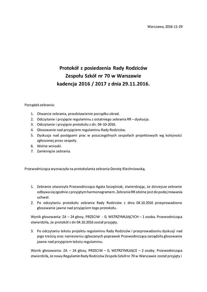 Warszawa, 2016-11-29 Protokół z posiedzenia Rady Rodziców Zespołu Szkół nr 70 w Warszawie kadencja 2016 / 2017 z dnia 29.11.2016. Porządek zebrania: 1. 2. 3. 4. 5. Otwarcie zebrania, przedstawienie porządku obrad. Odczytanie i przyjęcie regulaminu z ostatniego zebrania RR – dyskusja. Odczytanie i przyjęcie protokołu z dn. 04-10-2016. Głosowanie nad przyjęciem regulaminu Rady Rodziców. Dyskusja nad postępami prac w poszczególnych zespołach projektowych wg kolejności zgłoszonej przez zespoły. 6. Wolne wnioski. 7. Zamknięcie zebrania. Przewodnicząca wyznaczyła na protokolanta zebrania Dorotę Klechniowską. 1. Zebranie otworzyła Przewodnicząca Agata Szczęśniak, stwierdzając, że dzisiejsze zebranie odbywa się zgodnie z przyjętym harmonogramem. Zebranie RR zdolne jest do podej mowania uchwał. 2. Po odczytaniu protokołu zebrania Rady Rodziców z dnia 04.10.2016 przeprowadzono głosowanie jawne nad przyjęciem tego protokołu. Wynik głosowania: ZA – 24 głosy, PRZECIW - 0, WSTRZYMUJĄCYCH – 1 osoba. Przewodnicząca stwierdziła, że protokół z dn 04.10.2016 został przyjęty. 3. Po odczytaniu tekstu projektu regulaminu Rady Rodziców i przeprowadzeniu dyskusji nad jego treścią oraz naniesieniu zgłaszanych poprawek Przewodnicząca zarządziła głosowanie jawne nad przyjęciem tekstu regulaminu. Wynik głosowania: ZA – 24 głosy, PRZECIW – 0, WSTRZYMUJĄCE – 2 osoby. Przewodnicząca stwierdziła, że nowy Regulamin Rady Rodziców Zespołu Szkół nr 70 w Warszawie został przyjęty i będzie obowiązywał od dnia 27.11.2016 r. Nowy tekst Regulaminu Rady Rodziców będzie opublikowany na stronie internetowej Szkoły, w zakładce Rady Rodziców. 4. Rozpoczęto dyskusję nad postępami prac w poszczególnych zespołach projektowych wg kolejności zgłoszonej przez zespoły. a. Pani Małgorzata Kutyła przedstawiła sprawę projektu dostosowania stołów i krzeseł odpowiednich dla wzrostu poszczególnych uczniów. Po dyskusji postanowiono pozostawić temat do decyzji indywidualnych w klasach. b. Pani Małgorzata Kutyła przedstawiła temat szafek dla klas IV – V. Po dyskusji stwierdzono, że szafki nie spełniają swojej pierwotnej roli czyli uczniowie nie pozostawiają w nich książek gdyż muszą z nich korzystać w domu. Projekt zawieszono. c. Pani Karolina Wielgołaska przedstawiła temat tablic informacyjnych Rady Rodziców. Tablice będą wykorzystywane do celów informacji o działalności Rady Rodziców, imprezach kulturalnych oraz do przekazywania życzeń okolicznościowych. Zarządzaniem i redakcją treści, zamieszczanych na tablicach zajmie się Pani Karolina Wielgołaska. d. Pani Ewa Osińska przedstawiła temat „Świąteczna Paczka”. Nie ma specjalnych potrzeb. e. Pani Ewa Osińska przedstawiła temat zajęć pozalekcyjnych - bezpłatnych za pośrednictwem fundacji „Białobrzeska”. Sprawa w toku. Pani Agata Miluszkiewicz zgłosiła chęć pomocy w realizacji tego projektu. f. Pani Agata Szczęśniak przedstawiła projekt pozyskiwania dodatkowego finansowania dla Szkoły za pośrednictwem stowarzyszenia pożytku publicznego (1% podatku). Sprawa w toku. Szukamy pomysłów na cel zbiórki. Zgłoszono propozycje: remontu toalet dla dzieci. ułożenia sztucznej trawy lub innego odpowiedniego podłoża w celu utwardzenia powierzchni placu zabaw zadaszenia / wiaty rowerowej g. Zgłoszono potrzebę zamontowania w toaletach pojemników na papier toaletowy w każdej kabinie. Tematem zajmą się Panie: Agata Miluszkiewicz i Karolina Wielgołaska. h. Projekt zbliżeniowych kart wejściowych decyzją zebranych został zawieszony. i. Pani Ewa Osińska przedstawiła temat zbliżeniowych kart obiadowych. Pan Jacek Łuszczyński zgłosił chęć pomocy w realizacji tego projektu. Sprawa w toku. 5. Wolne wnioski. a. Pani Agata Szczęśniak zgłosiła, iż po prośbie Kierownika stołówki o konieczności uzupełnienia sztućców w stołówce szkolnej udało się znaleźć sponsora, który nieodpłatnie przekazał szkole partię sztućców. Sprawa została załatwiona przez Panią Agatę Szczęśniak, b. Dyskusja nad problemami w dostępie przez uczniów do swoich kont na Librusie. Wniosek: Przewodniczący Rady Rodziców wystosuje wniosek do Dyrekcji Szkoły z prośbą o wyjaśnienie wątpliwości w sposobie używania informacji z Librusa przez nauczycieli. c. Wigilia Szkolna – należy wystosować prośbę do Dyrekcji o przeznaczenie całej godziny lekcyjnej, a nie tylko jej części na Wigilię Klasową. d. Omówienie sprawy spotkania w dniu 02.12.2016 godz. 16, miejsce: Szkoła nr 74 w Rembertowie. Tematem spotkania jest wprowadzenie nowej reformy oświatowej. Delegacja Rodziców będzie uczestniczyć w spotkaniu. e. Omówienie możliwości dofinansowania obiadów dla niektórych uczniów naszej szkoły. Rozumiemy trudną sytuację rodziny, ale nie widzimy powodu abyśmy f. finansowali coś do czego zobowiązana jest gmina na mocy ustawy. Postanowiono wniosek przekazać Dyrekcji celem pozyskania dofinansowania z funduszy Gminy w ramach programu „Pomoc państwa w zakresie dożywiania na lata 2014-2020”. Zebrani przyjęli jednogłośnie protokół nr 2/2016/2017 z dn. 21.11.2016 w sprawie przekazania sprzętów zakupionych do świetlicy na rzecz Szkoły. Na tym zebranie zakończono. Protokół podpisano. Przewodnicząca: Protokolant: