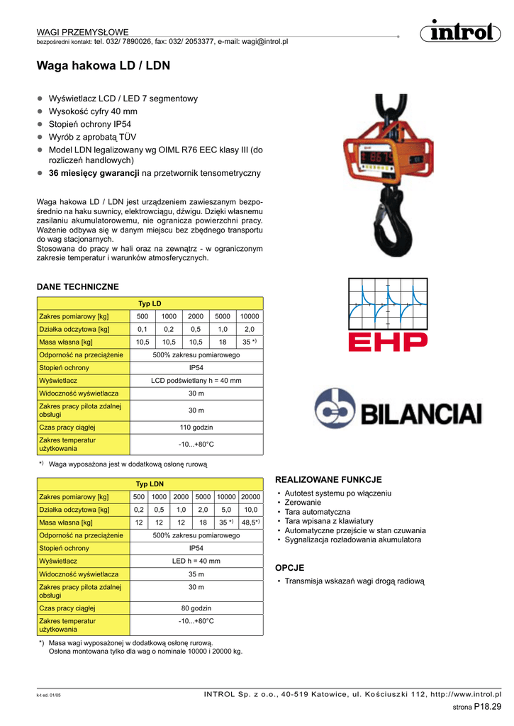 WAGI PRZEMYSŁOWE bezpośredni kontakt: tel. 032/ 7890026, fax: 032/ 2053377, e-mail: [email protected] Waga hakowa LD / LDN ● ● ● ● ● ● Wyświetlacz LCD / LED 7 segmentowy Wysokość cyfry 40 mm Stopień ochrony IP54 Wyrób z aprobatą TÜV Model LDN legalizowany wg OIML R76 EEC klasy III (do rozliczeń handlowych) 36 miesięcy gwarancji na przetwornik tensometryczny Waga hakowa LD / LDN jest urządzeniem zawieszanym bezpośrednio na haku suwnicy, elektrowciągu, dźwigu. Dzięki własnemu zasilaniu akumulatorowemu, nie ogranicza powierzchni pracy. Ważenie odbywa się w danym miejscu bez zbędnego transportu do wag stacjonarnych. Stosowana do pracy w hali oraz na zewnątrz - w ograniczonym zakresie temperatur i warunków atmosferycznych. DANE TECHNICZNE Typ LD Zakres pomiarowy [kg] 500 1000 2000 5000 10000 Działka odczytowa [kg] 0,1 0,2 0,5 1,0 2,0 Masa własna [kg] 10,5 10,5 10,5 18 35 *) Odporność na przeciążenie 500% zakresu pomiarowego Stopień ochrony IP54 Wyświetlacz LCD podświetlany h = 40 mm Widoczność wyświetlacza 30 m Zakres pracy pilota zdalnej obsługi 30 m Czas pracy ciągłej 110 godzin Zakres temperatur użytkowania -10...+80°C *) Waga wyposażona jest w dodatkową osłonę rurową REALIZOWANE FUNKCJE Typ LDN Zakres pomiarowy [kg] 500 1000 2000 5000 10000 20000 Działka odczytowa [kg] 0,2 Masa własna [kg] Odporność na przeciążenie Stopień ochrony Wyświetlacz 12 0,5 12 1,0 12 2,0 18 5,0 35 *) 10,0 48,5*) 500% zakresu pomiarowego IP54 LED h = 40 mm Widoczność wyświetlacza 35 m Zakres pracy pilota zdalnej obsługi 30 m Czas pracy ciągłej 80 godzin Zakres temperatur użytkowania -10...+80°C • • • • • • Autotest systemu po włączeniu Zerowanie Tara automatyczna Tara wpisana z klawiatury Automatyczne przejście w stan czuwania Sygnalizacja rozładowania akumulatora OPCJE • Transmisja wskazań wagi drogą radiową *) Masa wagi wyposażonej w dodatkową osłonę rurową. Osłona montowana tylko dla wag o nominale 10000 i 20000 kg. k-t ed. 01/05 INTROL Sp. z o.o., 40-519 Katowice, ul. Ko ściusz ki 112, http://www.in trol.pl strona P18.29 bezpośredni kontakt: WAGI PRZEMYSŁOWE tel. 032/ 7890026, fax: 032/ 2053377, e-mail: [email protected] Wyświetlacz wielogabarytowy Large display (*) Terminal wagowy Teledata (*) Moduł transmisji radiowejTelebox Plus (*) Moduł transmisji radiowej Greybox INTROL Sp. z o.o., 40-519 Katowice, ul. Ko ściusz ki 112, http://www.in trol.pl strona P18.30 k-t ed. 01/05 WAGI PRZEMYSŁOWE bezpośredni kontakt: k-t ed. 01/05 tel. 032/ 7890026, fax: 032/ 2053377, e-mail: [email protected] INTROL Sp. z o.o., 40-519 Katowice, ul. Ko ściusz ki 112, http://www.in trol.pl strona P18.31