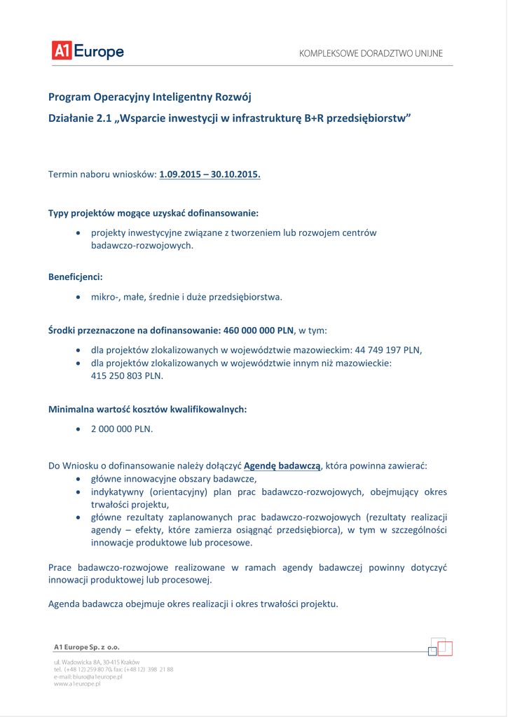 Program Operacyjny Inteligentny Rozwój Działanie 2.1 „Wsparcie inwestycji w infrastrukturę B+R przedsiębiorstw” Termin naboru wniosków: 1.09.2015 – 30.10.2015. Typy projektów mogące uzyskać dofinansowanie: projekty inwestycyjne związane z tworzeniem lub rozwojem centrów badawczo-rozwojowych. Beneficjenci: mikro-, małe, średnie i duże przedsiębiorstwa. Środki przeznaczone na dofinansowanie: 460 000 000 PLN, w tym: dla projektów zlokalizowanych w województwie mazowieckim: 44 749 197 PLN, dla projektów zlokalizowanych w województwie innym niż mazowieckie: 415 250 803 PLN. Minimalna wartość kosztów kwalifikowalnych: 2 000 000 PLN. Do Wniosku o dofinansowanie należy dołączyć Agendę badawczą, która powinna zawierać: główne innowacyjne obszary badawcze, indykatywny (orientacyjny) plan prac badawczo-rozwojowych, obejmujący okres trwałości projektu, główne rezultaty zaplanowanych prac badawczo-rozwojowych (rezultaty realizacji agendy – efekty, które zamierza osiągnąć przedsiębiorca), w tym w szczególności innowacje produktowe lub procesowe. Prace badawczo-rozwojowe realizowane w ramach agendy badawczej powinny dotyczyć innowacji produktowej lub procesowej. Agenda badawcza obejmuje okres realizacji i okres trwałości projektu. , Regionalna pomoc inwestycyjna Maksymalna intensywność pomocy: Województwo/ Lokalizacja projektu lubelskie, podkarpackie, podlaskie, warmińsko-mazurskie kujawsko-pomorskie, lubuskie, łódzkie, małopolskie, opolskie, pomorskie, świętokrzyskie, zachodniopomorskie oraz obszary należące do podregionów: ciechanowsko-płockiego, ostrołęcko-siedleckiego, radomskiego i warszawskiego wschodniego dolnośląskiego, wielkopolskiego, śląskiego podregion warszawski zachodni miasto stołeczne Warszawy w okresie od dnia 1 lipca 2014 r. do dnia 31 grudnia 2017 r. miasto stołeczne Warszawy w okresie od dnia 1 stycznia 2018 r. do dnia 31 grudnia 2020 r. Mikro i małe Średnie przedsiębiorstwa przedsiębiorstwa Przedsiębiorstwa inne niż MSP oraz nowe inwestycje o kosztach kwalifikowanych przekraczających 50 mln euro 70% 60% 50% 55% 45% 35% 45% 35% 25% 40% 30% 20% 35% 25% 15% 30% 20% 10% Katalog kosztów kwalifikowanych w ramach RPI: 1) koszty nabycia nieruchomości zabudowanych i niezabudowanych (w tym prawa użytkowania wieczystego), 2) koszty nabycia albo wytworzenia środków trwałych innych niż określone w pkt 1) wraz z kosztem instalacji i uruchomienia, 3) koszty nabycia robót i materiałów budowlanych, , 4) koszty nabycia wartości niematerialnych i prawnych w formie patentów, licencji, knowhow oraz innych praw własności intelektualnej, 5) koszty spłaty rat leasingu nieruchomości zabudowanych i niezabudowanych poniesione przez korzystającego do dnia zakończenia realizacji projektu, do wysokości ich wartości początkowej z dnia zawarcia umowy leasingu, pod warunkiem, że umowa leasingu będzie obejmowała okres co najmniej 5 lat od przewidywanego terminu zakończenia realizacji projektu, a w przypadku mikro przedsiębiorcy, małego lub średniego przedsiębiorcy – okres co najmniej 3 lat, 6) koszty spłaty rat wartości początkowej środków trwałych innych niż określone w pkt 4) poniesione przez korzystającego z tytułu umowy leasingu prowadzącej do przeniesienia własności tych środków na korzystającego, z wyłączeniem leasingu zwrotnego. Łączna wartość kosztów kwalifikowanych wymienionych w pkt 1) i 5) nie może przekraczać 10% kosztów kwalifikowanych projektu. Prace rozwojowe (B+R) Maksymalna intensywność pomocy: Mikro i małe przedsiębiorstwa 45% Średnie przedsiębiorstwa 35% Przedsiębiorstwa inne niż MSP 25% Katalog kosztów kwalifikowanych w ramach Prac rozwojowych: 1) koszty odpowiedniej wiedzy technicznej, 2) koszty doradztwa i równorzędnych usług wykorzystywanych na potrzeby projektu. Pomoc de minimis Maksymalna intensywność pomocy: Mikro i małe przedsiębiorstwa 45% Średnie przedsiębiorstwa 35% Przedsiębiorstwa inne niż MSP 25% Katalog kosztów kwalifikowanych w ramach Pomocy de minimis: 1) koszty zakupu materiałów i produktów związanych bezpośrednio z realizacją projektu. Maksymalna dotacja w ramach pomocy de minimis nie może przekroczyć 200 000 euro, a w przypadku przedsiębiorcy z sektora transportu drogowego – 100 000 euro. ,