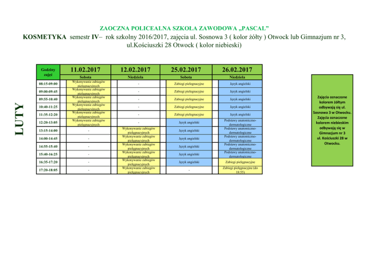 ZAOCZNA POLICEALNA SZKOŁA ZAWODOWA „PASCAL” KOSMETYKA semestr IV– rok szkolny 2016/2017, zajęcia ul. Sosnowa 3 ( kolor żółty ) Otwock lub Gimnazjum nr 3, ul.Kościuszki 28 Otwock ( kolor niebieski) Godziny zajęć 08:15-09:00 09:00-09:45 LUTY 09:55-10:40 10:40-11:25 11:35-12:20 12:20-13:05 11.02.2017 12.02.2017 25.02.2017 26.02.2017 Sobota Niedziela Sobota Niedziela Wykonywanie zabiegów pielęgnacyjnych Wykonywanie zabiegów pielęgnacyjnych Wykonywanie zabiegów pielęgnacyjnych Wykonywanie zabiegów pielęgnacyjnych Wykonywanie zabiegów pielęgnacyjnych Wykonywanie zabiegów pielęgnacyjnych 13:15-14:00 - 14:00-14:45 - 14:55-15:40 - 15:40-16:25 - 16:35-17:20 - 17:20-18:05 - - Zabiegi pielegnacyjne Język angielski - Zabiegi pielegnacyjne Język angielski - Zabiegi pielegnacyjne Język angielski - Zabiegi pielegnacyjne Język angielski - Zabiegi pielegnacyjne Język angielski - Język angielski Podstawy anatomicznodermatologiczne Podstawy anatomicznodermatologiczne Podstawy anatomicznodermatologiczne Podstawy anatomicznodermatologiczne Podstawy anatomicznodermatologiczne Wykonywanie zabiegów pielęgnacyjnych Wykonywanie zabiegów pielęgnacyjnych Wykonywanie zabiegów pielęgnacyjnych Wykonywanie zabiegów pielęgnacyjnych Wykonywanie zabiegów pielęgnacyjnych Wykonywanie zabiegów pielęgnacyjnych Język angielski Język angielski Język angielski Język angielski Język angielski Zabiegi pielęgnacyjne - Zabiegi pielęgnacyjne (do 18:55) Zajęcia oznaczone kolorem żółtym odbywają się ul. Sosnowa 3 w Otwocku. Zajęcia oznaczone kolorem niebieskim odbywają się w Gimnazjum nr 3 ul. Kościuszki 28 w Otwocku.