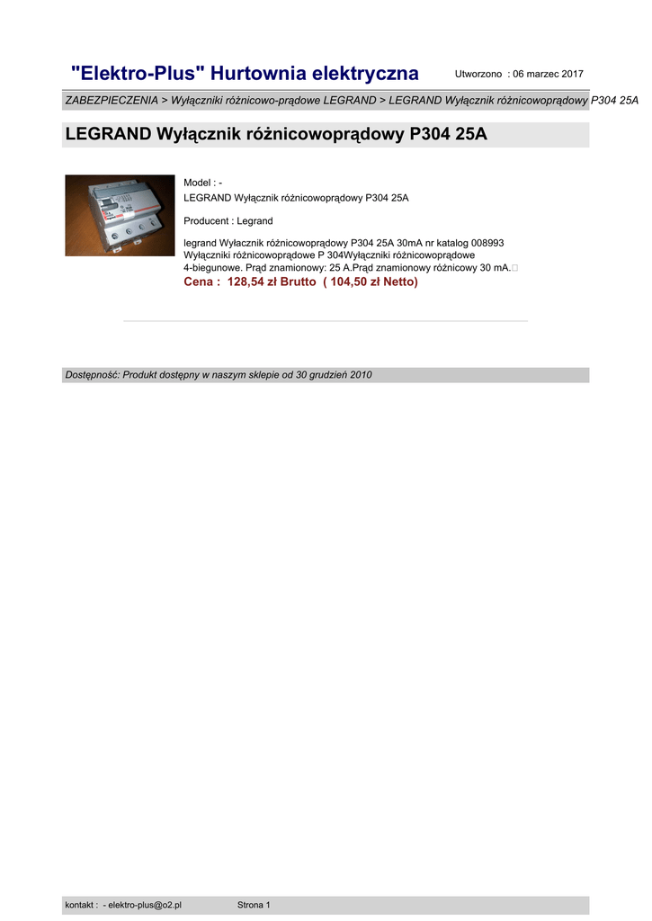 "Elektro-Plus" Hurtownia elektryczna Utworzono : 06 marzec 2017 ZABEZPIECZENIA > Wyłączniki różnicowo-prądowe LEGRAND > LEGRAND Wyłącznik różnicowoprądowy P304 25A LEGRAND Wyłącznik różnicowoprądowy P304 25A Model : LEGRAND Wyłącznik różnicowoprądowy P304 25A Producent : Legrand legrand Wyłacznik różnicowoprądowy P304 25A 30mA nr katalog 008993 Wyłączniki różnicowoprądowe P 304Wyłączniki różnicowoprądowe 4-biegunowe. Prąd znamionowy: 25 A.Prąd znamionowy różnicowy 30 mA.� Cena : 128,54 zł Brutto ( 104,50 zł Netto) Dostępność: Produkt dostępny w naszym sklepie od 30 grudzień 2010 kontakt : - [email protected] Strona 1