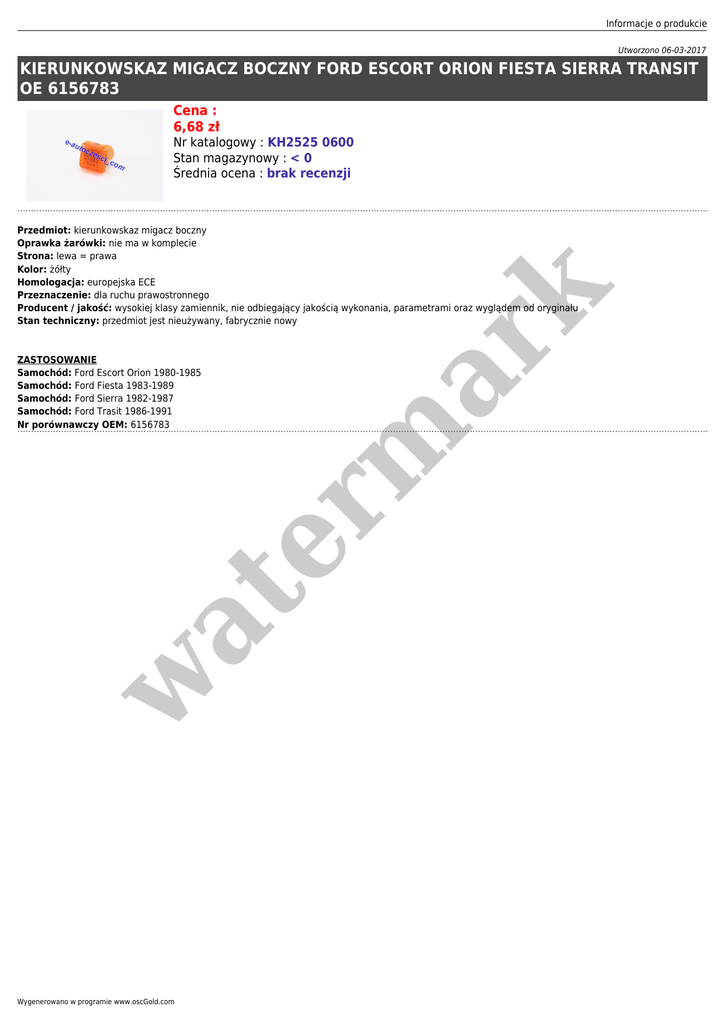 Informacje o produkcie Utworzono 06-03-2017 KIERUNKOWSKAZ MIGACZ BOCZNY FORD ESCORT ORION FIESTA SIERRA TRANSIT OE 6156783 Cena : 6,68 zł Nr katalogowy : KH2525 0600 Stan magazynowy : < 0 Średnia ocena : brak recenzji er m ar k Przedmiot: kierunkowskaz migacz boczny Oprawka żarówki: nie ma w komplecie Strona: lewa = prawa Kolor: żółty Homologacja: europejska ECE Przeznaczenie: dla ruchu prawostronnego Producent / jakość: wysokiej klasy zamiennik, nie odbiegający jakością wykonania, parametrami oraz wyglądem od oryginału Stan techniczny: przedmiot jest nieużywany, fabrycznie nowy w at ZASTOSOWANIE Samochód: Ford Escort Orion 1980-1985 Samochód: Ford Fiesta 1983-1989 Samochód: Ford Sierra 1982-1987 Samochód: Ford Trasit 1986-1991 Nr porównawczy OEM: 6156783 Wygenerowano w programie www.oscGold.com