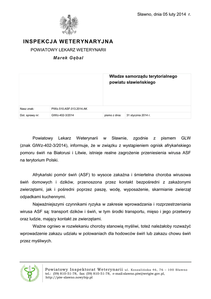 Sławno, dnia 05 luty 2014 r. INSPEKCJ A WETERYN ARYJN A POWIATOWY LEKARZ WETERYNARII Marek Gębal Władze samorządu terytorialnego powiatu sławieńskiego Nasz znak: PIWz.510.ASF.013.2014.AK Dot. sprawy nr: GIWz-402-3/2014 Powiatowy Lekarz pismo z dnia: Weterynarii w 31 stycznia 2014 r. Sławnie, zgodnie z pismem GLW (znak GIWz-402-3/2014), informuje, że w związku z wystąpieniem ognisk afrykańskiego pomoru świń na Białorusi i Litwie, istnieje realne zagrożenie przeniesienia wirusa ASF na terytorium Polski. Afrykański pomór świń (ASF) to wysoce zakaźna i śmiertelna choroba wirusowa świń domowych i dzików, przenoszona przez kontakt bezpośredni z zakażonymi zwierzętami, jak i pośredni poprzez paszę, wodę, wyposażenie, skarmianie zwierząt odpadkami kuchennymi. Najważniejszymi czynnikami ryzyka w zakresie wprowadzania i rozprzestrzeniania wirusa ASF są: transport dzików i świń, w tym środki transportu, mięso i jego przetwory oraz ludzie, mający kontakt ze zwierzętami. Ważne ogniwo w rozwlekaniu choroby stanowią myśliwi, toteż należałoby rozważyć wprowadzenie zakazu udziału w polowaniach dla hodowców świń lub zakazu chowu świń przez myśliwych. Powiatowy Inspektorat Weterynarii ul. Koszalińska 46, 76 – 100 Sławno tel.: (59) 810-51-78, fax: (59) 810-51-78, e-mail:[email protected], http://piw-slawno.nowybip.pl ASF nie jest zoonozą, nie stanowi zagrożenia dla zdrowia i życia ludzi. Jednakże, należy podkreślić, że powoduje ogromne straty ekonomiczne związane z upadkami świń, kosztami likwidacji ognisk choroby, wstrzymaniem obrotu i eksportu świń, mięsa wieprzowego i produktów od nich pozyskiwanych. Wobec tego, istnieje konieczność prowadzenia szerokiej kampanii informacyjnej, aby w skuteczny sposób zapobiegać wystąpieniu ASF na terytorium Polski. W związku z powyższym, Powiatowy Lekarz Weterynarii w Sławnie zwraca się z prośbą do właściwych władz samorządowych o upowszechnienie, na terenie gmin powiatu sławieńskiego, informacji o istniejącym zagrożeniu i metodach prewencji. Wszelkiego rodzaju kampanie informacyjne powinny uświadamiać posiadaczom trzody chlewnej i osobom mającym kontakt ze zwierzętami z gatunków wrażliwych, że zgodnie z ustawą o ochronie zdrowia zwierząt i zwalczaniu chorób zakaźnych zwierząt z dnia 11 marca 2004 roku (Dz. U. Nr 69, poz. 625 z poźn. zm.), istnieje obowiązek natychmiastowego zgłaszania każdego przypadku podejrzenia choroby. Takie zgłoszenie należy bezzwłocznie przekazać do lekarza weterynarii opiekującego się gospodarstwem, powiatowego lekarza weterynarii lub właściwego miejscowo organu samorządu terytorialnego (wójta, burmistrza). Z poważaniem PLW Marek Gębal Powiatowy Inspektorat Weterynarii ul. Koszalińska 46, 76 – 100 Sławno tel.: (59) 810-51-78, fax: (59) 810-51-78, e-mail:[email protected], http://piw-slawno.nowybip.pl -2-