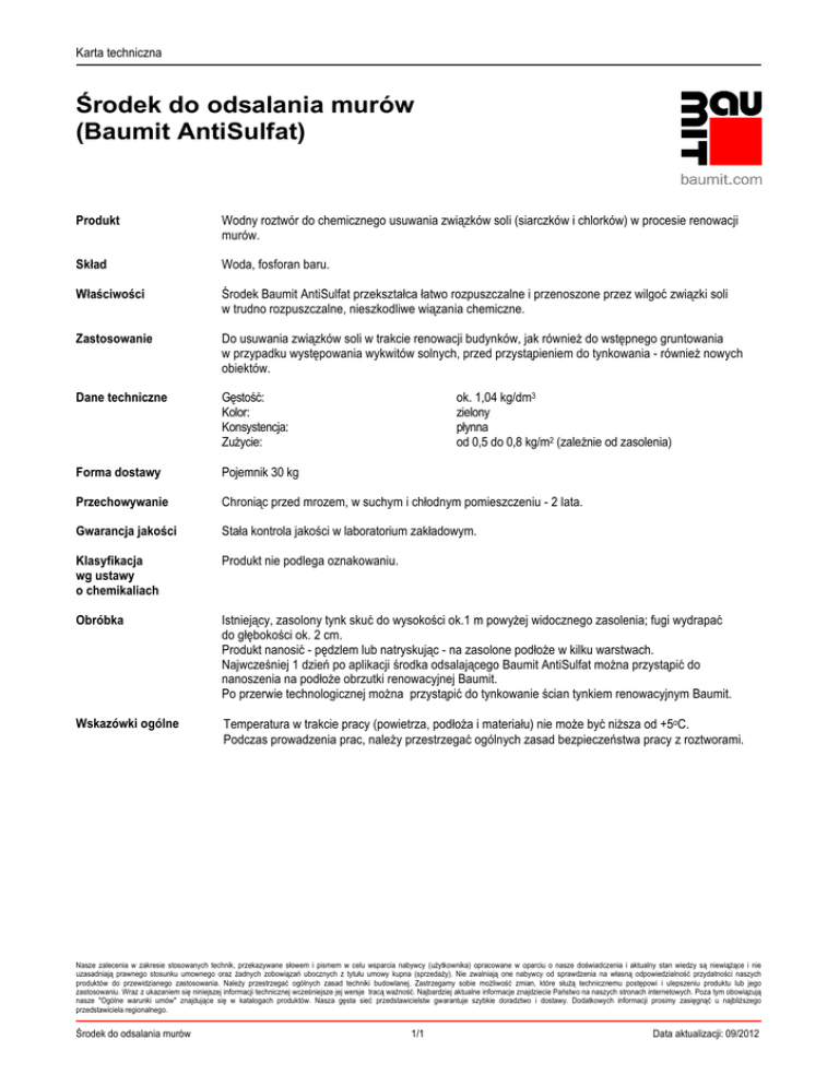 Karta techniczna Środek do odsalania murów (Baumit AntiSulfat) Produkt Wodny roztwór do chemicznego usuwania związków soli (siarczków i chlorków) w procesie renowacji murów. Skład Woda, fosforan baru. Właściwości Środek Baumit AntiSulfat przekształca łatwo rozpuszczalne i przenoszone przez wilgoć związki soli w trudno rozpuszczalne, nieszkodliwe wiązania chemiczne. Zastosowanie Do usuwania związków soli w trakcie renowacji budynków, jak również do wstępnego gruntowania w przypadku występowania wykwitów solnych, przed przystąpieniem do tynkowania - również nowych obiektów. Dane techniczne Gęstość: Kolor: Konsystencja: Zużycie: Forma dostawy Pojemnik 30 kg Przechowywanie Chroniąc przed mrozem, w suchym i chłodnym pomieszczeniu - 2 lata. Gwarancja jakości Stała kontrola jakości w laboratorium zakładowym. Klasyfikacja wg ustawy o chemikaliach Produkt nie podlega oznakowaniu. Obróbka Istniejący, zasolony tynk skuć do wysokości ok.1 m powyżej widocznego zasolenia; fugi wydrapać do głębokości ok. 2 cm. Produkt nanosić - pędzlem lub natryskując - na zasolone podłoże w kilku warstwach. Najwcześniej 1 dzień po aplikacji środka odsalającego Baumit AntiSulfat można przystąpić do nanoszenia na podłoże obrzutki renowacyjnej Baumit. Po przerwie technologicznej można przystąpić do tynkowanie ścian tynkiem renowacyjnym Baumit. Wskazówki ogólne Temperatura w trakcie pracy (powietrza, podłoża i materiału) nie może być niższa od +5oC. Podczas prowadzenia prac, należy przestrzegać ogólnych zasad bezpieczeństwa pracy z roztworami. ok. 1,04 kg/dm3 zielony płynna od 0,5 do 0,8 kg/m2 (zależnie od zasolenia) Nasze zalecenia w zakresie stosowanych technik, przekazywane słowem i pismem w celu wsparcia nabywcy (użytkownika) opracowane w oparciu o nasze doświadczenia i aktualny stan wiedzy są niewiążące i nie uzasadniają prawnego stosunku umownego oraz żadnych zobowiązań ubocznych z tytułu umowy kupna (sprzedaży). Nie zwalniają one nabywcy od sprawdzenia na własną odpowiedzialność przydatności naszych produktów do przewidzianego zastosowania. Należy przestrzegać ogólnych zasad techniki budowlanej. Zastrzegamy sobie możliwość zmian, które służą technicznemu postępowi i ulepszeniu produktu lub jego zastosowaniu. Wraz z ukazaniem się niniejszej informacji technicznej wcześniejsze jej wersje tracą ważność. Najbardziej aktualne informacje znajdziecie Państwo na naszych stronach internetowych. Poza tym obowiązują nasze "Ogólne warunki umów" znajdujące się w katalogach produktów. Nasza gęsta sieć przedstawicielstw gwarantuje szybkie doradztwo i dostawy. Dodatkowych informacji prosimy zasięgnąć u najbliższego przedstawiciela regionalnego. Środek do odsalania murów 1/1 Data aktualizacji: 09/2012
