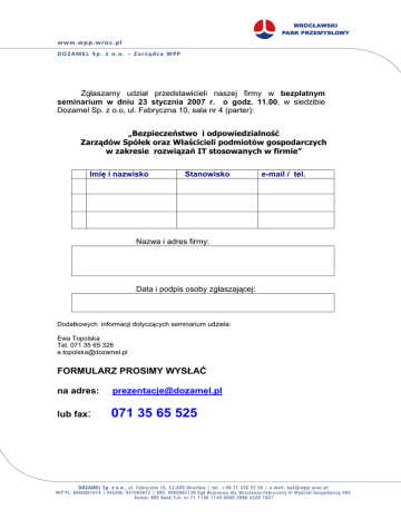 Zgłaszamy udział przedstawicieli naszej firmy w bezpłatnym seminarium w dniu 23 stycznia 2007 r. o godz. 11.00, w siedzibie Dozamel Sp. z o.o, ul. Fabryczna 10, sala nr 4 (parter): „Bezpieczeństwo i odpowiedzialność Zarządów Spółek oraz Właścicieli podmiotów gospodarczych w zakresie rozwiązań IT stosowanych w firmie” Imię i nazwisko Stanowisko Nazwa i adres firmy: Data i podpis osoby zgłaszającej: Dodatkowych informacji dotyczących seminarium udziela: Ewa Topolska Tel. 071 35 65 326 [email protected] FORMULARZ PROSIMY WYSŁAĆ na adres: [email protected] lub fax: 071 35 65 525 e-mail / tel.