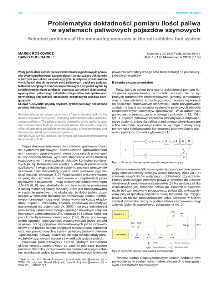 paliwowych jest bardzo szeroki. Są to zarówno czujniki oparte na mechanicznych ukła wykorzystujące położenia pływaka, jak i konstrukcje pracujące w oparciu o zjaw elektryczne, magnetyczne lub elektryczno-magnetyczne. Dostępne są rozwiązania, w któ zmiana pojemności elementu pomiarowego lub zmiana rezystancji elektrycznej czu 812 MECHANIK NR 7/2016 w funkcji poziomu cieczy jest sygnałem pomiarowym [10].Aktualnie opracowy rozwiązania służące mierzeniu ilości paliwa w zbiorniku oparte są na wykorzystaniu zjaw ultradźwięków lub zjawiska wibracji (kamertonowe czujniki poziomu cieczy)[10 Odrębną grupę stanowią sondy paliwa oparte na pomiarze ciśnienia hydrostatycz w których wykorzystywane są czujniki ciśnienia względnego, gdzie wartość ciśnienia (w tym accuracy również paliwa) wpływa bezpośrednio odkształcenia memb Selected problems of thecieczy measuring in the rail vehicles fuelna system pomiarowej. Dzięki zastosowaniu techniki tensometrii oporowej wielkość wychy membrany przetwarzana jest na sygnał elektryczny [14]. Pomiary poziomu paliwa są często obarczone błędami, wynikającymi ze środow MAREK ROŚKOWICZ Materiały z XX SKWPWiE, Jurata 2016 r. eksploatacji czujnika m.in. zmian temperatury i ciśnienia odniesienia. Przykładem moż DAWID CHOJNACKI * DOI: 10.17814/mechanik.2016.7.186 wpływ temperatury na gęstość, która przekłada się nie tylko na zmianę objętość c znajdującej się w zbiorniku, ale także na wartość ciśnienia hydrostatycznego słupa ci Również zmiana ciśnienia atmosferycznego wpływa na dokładność pomiaru czujn Wiarygodne dane o ilości paliwa w zbiornikach są podstawą do pomiapowietrza atmosferycznego temperatury) jakość uzyciśnienia względnego, których punktem oraz referencji jestnawłaśnie wartość ciśn rów systemu paliwowego, zapewniających wystarczającą dokładność(otoczenia). skiwanych wyników. zewnętrznego Problematyka dokładności pomiaru ilości paliwa w systemach paliwowych pojazdów szynowych w każdych warunkach eksploatacyjnych. W artykule przedstawiono wyniki badań dwóch typowych sond paliwowych, uzyskane podczas Badania eksperymentalne Badania eksperymentalne testów na specjalnych stanowisku pomiarowym. Otrzymane wyniki są świadectwem istnienia zależności pomiędzy warunkami eksploatacyjTesty, których celem była ocena dokładności pomiaru ilonymi systemu paliwowego a dokładnością pomiaru Testy, ilości paliwa oraz celem ści paliwa w zbiorniku w zależności od wy- zgromadzo których byłazgromadzonego ocena dokładności pomiaru ilości paliwa potwierdzają konieczność stosowania dodatkowych układów korybranych parametrów środowiskowych (zmiany temperatury w zbiorniku w zależności od wybranych parametrów środowiskowych (zmiana temper gujących. oraz zmian ciśnienia atmosferycznego), zostały wykonane oraz dokładność zmian ciśnienia atmosferycznego), wykonane na specjalnie w tym SŁOWA KLUCZONE: pojazdy szynowe, system paliwowy, na specjalnie zbudowanymzostały stanowisku, które przygotowane zbudowanym stanowisku, które przygotowane zostało w oparciu o schematy syste pomiaru ilości paliwa zostało na bazie schematów systemów paliwowych obecnie eksploatowanych lokomotyw spalinowych. W układach tych tych paliw paliwowych obecnie eksploatowanych lokomotyw spalinowych. W układach Reliable information about the amount of fuel in theprzemieszczane fuel tanks is the wpaliwo jest przemieszczane w obiegu [12, 13] – obiegu zamkniętym [12,13] – zamkniętym rys. 1. System paliwowy zape basis of accurate fuel system, providing sufficient accuracy in all operys. 1. System paliwowy zapewnia utrzymywanie odpowiedutrzymywanie odpowiedniego poziomu ciśnienia paliwa przed pompowtryskiwaczami w rating conditions. The article presents the results of two typical probes niego poziomu ciśnienia paliwa przed pompo-wtryskiwaczami wymaga to stałej wymaga pracy pompy, co z kolei powo fuel obtained from tests on special test bench. Thezasobniku results show wysokiego the w tzw.ciśnienia, zasobniku wysokiego ciśnienia; to stałej pracy konieczność odprowadzania nadmiaru paliwa do zbiornika głównego (1). effect of operating conditions on the accuracy of measurements and pompy, co z kolei powoduje konieczność odprowadzania nadthe need for additional corrective systems. miaru paliwa do zbiornika głównego (1). KEYWORDS: fuel rail vehicles, fuel system, the accuracy of measuring the amount of fuel Ciągłe doskonalenie konstrukcji silników spalinowych oraz ich systemów paliwowych, spowodowane wprowadzaniem m.in. nowych rygorystycznych norm dotyczących emisji spalin czy poziomu hałasu, wymusza stosowanie coraz bardziej rozbudowanych i precyzyjnych układów kontrolno-pomiaroRys. 1. Schemat ideowy systemu paliwowego lokomotywy wych [4, 5]. Kompleksowa wiedza o istotnych parametrach Rys. 1. Schemat ideowy systemu paliwowego lokomotywy. użytkowych i eksploatacyjnych systemu pozwala precyzyjnie Zamontowane dodatkowo w systemie zawory zwrotne zapewszacować czas eksploatacji pojazdu oraz planować jego obniają jednokierunkowy przepływzwrotne cieczy roboczej. Bloki (3) i (4) Zamontowane w systemie dodatkowo zawory zapewniają jednokierunkowy przep sługi bieżące i okresowe [6, 7]. Współcześnie wykorzystywane stanowią zespół filtrów wstępnego i dokładnego czyszczenia. cieczy roboczej. Bloki (3) i (4) stanowią zespół 136 filtrów wstępnego i dokładnego czyszcz czujniki, dopuszczone do zastosowań w urządzeniach przePompy wymuszające przepływ paliwa w systemie do układów mysłowych i pojazdach – mają dokładność pomiarową Pompy rzędu wymuszające przepływ paliwa w systemie do układów wtryskowych wtryskowych zamontowane są na silniku (5). Na wyjściu z silnika zamontowan 1,5÷2% [8, 9]. Jeśli dokładność pomiaru zostanie napowiązana silniku (5).Na wyjściu z silnika zainstalowana jest chłodnica paliwa zainstalowana jest c