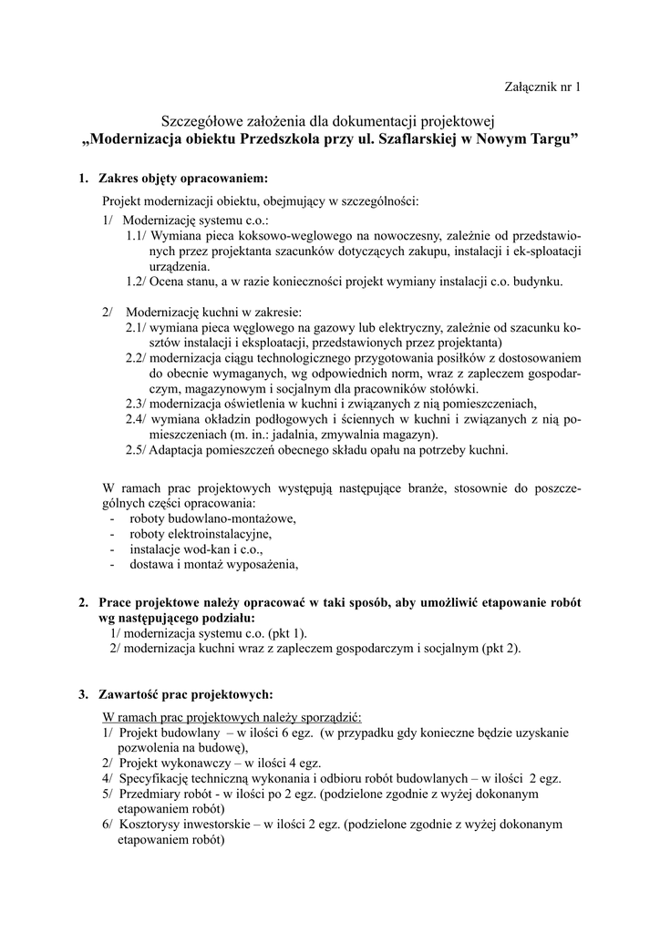 Załącznik nr 1 Szczegółowe założenia dla dokumentacji projektowej „Modernizacja obiektu Przedszkola przy ul. Szaflarskiej w Nowym Targu” 1. Zakres objęty opracowaniem: Projekt modernizacji obiektu, obejmujący w szczególności: 1/ Modernizację systemu c.o.: 1.1/ Wymiana pieca koksowo-weglowego na nowoczesny, zależnie od przedstawionych przez projektanta szacunków dotyczących zakupu, instalacji i ek-sploatacji urządzenia. 1.2/ Ocena stanu, a w razie konieczności projekt wymiany instalacji c.o. budynku. 2/ Modernizację kuchni w zakresie: 2.1/ wymiana pieca węglowego na gazowy lub elektryczny, zależnie od szacunku kosztów instalacji i eksploatacji, przedstawionych przez projektanta) 2.2/ modernizacja ciągu technologicznego przygotowania posiłków z dostosowaniem do obecnie wymaganych, wg odpowiednich norm, wraz z zapleczem gospodarczym, magazynowym i socjalnym dla pracowników stołówki. 2.3/ modernizacja oświetlenia w kuchni i związanych z nią pomieszczeniach, 2.4/ wymiana okładzin podłogowych i ściennych w kuchni i związanych z nią pomieszczeniach (m. in.: jadalnia, zmywalnia magazyn). 2.5/ Adaptacja pomieszczeń obecnego składu opału na potrzeby kuchni. W ramach prac projektowych występują następujące branże, stosownie do poszczególnych części opracowania: - roboty budowlano-montażowe, - roboty elektroinstalacyjne, - instalacje wod-kan i c.o., - dostawa i montaż wyposażenia, 2. Prace projektowe należy opracować w taki sposób, aby umożliwić etapowanie robót wg następującego podziału: 1/ modernizacja systemu c.o. (pkt 1). 2/ modernizacja kuchni wraz z zapleczem gospodarczym i socjalnym (pkt 2). 3. Zawartość prac projektowych: W ramach prac projektowych należy sporządzić: 1/ Projekt budowlany – w ilości 6 egz. (w przypadku gdy konieczne będzie uzyskanie pozwolenia na budowę), 2/ Projekt wykonawczy – w ilości 4 egz. 4/ Specyfikację techniczną wykonania i odbioru robót budowlanych – w ilości 2 egz. 5/ Przedmiary robót - w ilości po 2 egz. (podzielone zgodnie z wyżej dokonanym etapowaniem robót) 6/ Kosztorysy inwestorskie – w ilości 2 egz. (podzielone zgodnie z wyżej dokonanym etapowaniem robót) 7/ Uzyskanie pozwolenia na budowę (lub potwierdzenia przyjęcia bez sprzeciwu zgłoszenia robót nie wymagających pozwolenia na budowę). Powyższe opracowania należy sporządzić zgodnie z obowiązującymi przepisami, a w szczególności: ustawą z dnia 7 lipca 1994 r. - Prawo budowlane (jednolity tekst: Dz. U. z 2003 r. Nr 207, poz. 2016, z późn. zmianami) – celem uzyskania pozwolenia na budowę, ustawą z dnia 29 stycznia 2004 r Prawo zamówień publicznych. (Dz. U. Nr 19, poz. 177 z późn. zmianami), - celem opisu przedmiotu zamówienia na wykonanie robót budowlano-montażowych, 4. Założenia szczegółowe: 1/ Projektant uzyska wszelkie warunki do projektowania (w tym m. in. podkład geodezyjny). 2/ Wszelkie rozwiązania techniczne i ekonomiczne należy konsultować z zamawiającym. 3/ Projektant ma prawo powierzyć częściowe wykonanie prac projektowych innej osobie. W takim przypadku odpowiada on wobec zamawiającego za jej działanie i zaniechania jak za własne. 4/ Projektant, działając w imieniu zamawiającego, uzyska pozwolenie na budowę lub dokona zgłoszenia robót nie wymagających pozwolenia na budowę. W zakres prac będzie wchodzić przygotowanie wniosku o wydanie decyzji pozwolenia na budowę (lub zgłoszenia), przedłożenie go do sprawdzenia zamawiającemu oraz ostatecznie złożenie w Starostwie Powiatowym. Oświadczenie o posiadanym prawie dysponowania nieruchomością na cele budowlane podpisuje zamawiający. 5/ Rozliczenie prac projektowych (ryczałtowe), proponuje się w następujący sposób: - 50 % umownej wartości prac projektowych po ich wykonaniu i przedstawieniu zamawiającemu kopii złożonego do Starostwa Powiatowego wniosku o wydanie decyzji pozwolenia na budowę (lub zgłoszenia robót nie wymagających tego pozwolenia), - pozostałe 50 % po dostarczeniu zamawiającemu zatwierdzonych projektów budowlanych (lub potwierdzenia przyjęcia bez sprzeciwu zgłoszenia robót nie wymagających pozwolenia). 6/ Zamawiający może ograniczyć zakres zlecenia, bez konsekwencji finansowych. /PG/