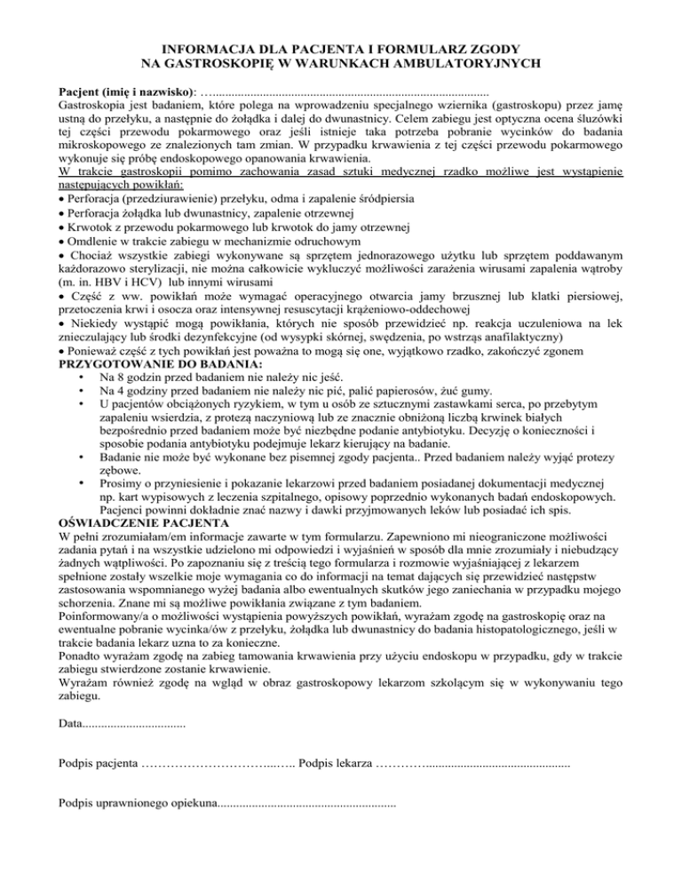 INFORMACJA DLA PACJENTA I FORMULARZ ZGODY NA GASTROSKOPIĘ W WARUNKACH AMBULATORYJNYCH Pacjent (imię i nazwisko): …........................................................................................ Gastroskopia jest badaniem, które polega na wprowadzeniu specjalnego wziernika (gastroskopu) przez jamę ustną do przełyku, a następnie do żołądka i dalej do dwunastnicy. Celem zabiegu jest optyczna ocena śluzówki tej części przewodu pokarmowego oraz jeśli istnieje taka potrzeba pobranie wycinków do badania mikroskopowego ze znalezionych tam zmian. W przypadku krwawienia z tej części przewodu pokarmowego wykonuje się próbę endoskopowego opanowania krwawienia. W trakcie gastroskopii pomimo zachowania zasad sztuki medycznej rzadko możliwe jest wystąpienie następujących powikłań: · Perforacja (przedziurawienie) przełyku, odma i zapalenie śródpiersia · Perforacja żołądka lub dwunastnicy, zapalenie otrzewnej · Krwotok z przewodu pokarmowego lub krwotok do jamy otrzewnej · Omdlenie w trakcie zabiegu w mechanizmie odruchowym · Chociaż wszystkie zabiegi wykonywane są sprzętem jednorazowego użytku lub sprzętem poddawanym każdorazowo sterylizacji, nie można całkowicie wykluczyć możliwości zarażenia wirusami zapalenia wątroby (m. in. HBV i HCV) lub innymi wirusami · Część z ww. powikłań może wymagać operacyjnego otwarcia jamy brzusznej lub klatki piersiowej, przetoczenia krwi i osocza oraz intensywnej resuscytacji krążeniowo-oddechowej · Niekiedy wystąpić mogą powikłania, których nie sposób przewidzieć np. reakcja uczuleniowa na lek znieczulający lub środki dezynfekcyjne (od wysypki skórnej, swędzenia, po wstrząs anafilaktyczny) · Ponieważ część z tych powikłań jest poważna to mogą się one, wyjątkowo rzadko, zakończyć zgonem PRZYGOTOWANIE DO BADANIA: • Na 8 godzin przed badaniem nie należy nic jeść. • Na 4 godziny przed badaniem nie należy nic pić, palić papierosów, żuć gumy. • U pacjentów obciążonych ryzykiem, w tym u osób ze sztucznymi zastawkami serca, po przebytym zapaleniu wsierdzia, z protezą naczyniową lub ze znacznie obniżoną liczbą krwinek białych bezpośrednio przed badaniem może być niezbędne podanie antybiotyku. Decyzję o konieczności i sposobie podania antybiotyku podejmuje lekarz kierujący na badanie. • Badanie nie może być wykonane bez pisemnej zgody pacjenta.. Przed badaniem należy wyjąć protezy zębowe. • Prosimy o przyniesienie i pokazanie lekarzowi przed badaniem posiadanej dokumentacji medycznej np. kart wypisowych z leczenia szpitalnego, opisowy poprzednio wykonanych badań endoskopowych. Pacjenci powinni dokładnie znać nazwy i dawki przyjmowanych leków lub posiadać ich spis. OŚWIADCZENIE PACJENTA W pełni zrozumiałam/em informacje zawarte w tym formularzu. Zapewniono mi nieograniczone możliwości zadania pytań i na wszystkie udzielono mi odpowiedzi i wyjaśnień w sposób dla mnie zrozumiały i niebudzący żadnych wątpliwości. Po zapoznaniu się z treścią tego formularza i rozmowie wyjaśniającej z lekarzem spełnione zostały wszelkie moje wymagania co do informacji na temat dających się przewidzieć następstw zastosowania wspomnianego wyżej badania albo ewentualnych skutków jego zaniechania w przypadku mojego schorzenia. Znane mi są możliwe powikłania związane z tym badaniem. Poinformowany/a o możliwości wystąpienia powyższych powikłań, wyrażam zgodę na gastroskopię oraz na ewentualne pobranie wycinka/ów z przełyku, żołądka lub dwunastnicy do badania histopatologicznego, jeśli w trakcie badania lekarz uzna to za konieczne. Ponadto wyrażam zgodę na zabieg tamowania krwawienia przy użyciu endoskopu w przypadku, gdy w trakcie zabiegu stwierdzone zostanie krwawienie. Wyrażam również zgodę na wgląd w obraz gastroskopowy lekarzom szkolącym się w wykonywaniu tego zabiegu. Data................................. Podpis pacjenta …………………………...….. Podpis lekarza ………….............................................. Podpis uprawnionego opiekuna.........................................................