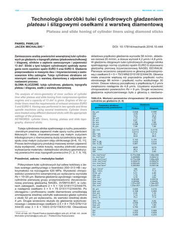 1528 MECHANIK NR 10/2016 Technologia obróbki tulei cylindrowych gładzeniem plateau i ślizgowymi osełkami z warstwą diamentową Plateau and slide honing of cylinder liners using diamond sticks PAWEŁ PAWLUS JACEK MICHALSKI * Zamieszczono analizę powierzchni wewnętrznej tulei cylindrowych po gładzeniu o topografii plateau (płaskowierzchołkowej) i ślizgowej, silników o zapłonie samoczynnym i pojemności 13 dm3. Silniki z tymi tulejami cylindrowymi spełniały wymagania norm czystości spalin EURO 5 oraz EURO 6. Gładzenie przeprowadzono w maszynie dwu- i trzywrzecionowej z zastosowaniem kilku zabiegów. Tuleje cylindrowe obrabiano odmiennymi osełkami z warstwą diamentową z odpowiednimi nastawami procesu. SŁOWA KLUCZOWE: tuleje cylindrowe, gładzenie, topografia plateau i ślizgowa, osełki z warstwą diamentową The analysis of micro-geometry of inner surface of cylinder liner after plateau and slide honing from compression-ignition engines and a capacity of 13 dm3 is given. Engines of the cylinder liners meet the requirements of exhaust emission EURO 5 and EURO 6. Honing was performed in two spindle and three spindle machines using several treatments. Cylinder liners were treated using different diamond sticks with the appropriate settings of the process. KEYWORDS: cylinder liners, honing, plateau and slide topography, diamond sticks Tuleja cylindrowa silnika spalinowego o ruchu posuwisto-zwrotnym powinna zapewnić małe opory ruchu pierścieni tłokowych i tłoka, charakteryzować się małym zużyciem tribologicznym z równoczesną dużą szczelnością tego zespołu oraz małym zużyciem oleju silnikowego [4÷6, 10, 11]. Proces technologiczny produkcji masowej winien zapewnić dużą wydajność, niskie koszty, wysoką zdolność procesu wytwarzania materiału i dokładności struktury geometrycznej powierzchni oraz topografii powierzchni [1, 2, 7, 9, 10]. Przedmiot, zakres i metodyka badań Półwyrobem tulei cylindrowych był odlew kokilowy z żeliwa szarego perlitycznego o twardości 255÷313 HB i wytrzymałości na rozciąganie 420 MPa. Wysokość chropowatości powierzchni wewnętrznej po wytaczaniu wynosiła Rz = 15÷20 μm. Badania gładzenia zgrubnego i wstępnego cylindrów pierwszej grupy przeprowadzono dwuwrzecionową pionową gładzarką NAGEL 3VSM10-80T, w czterech zabiegach, osełkami 2 × 5 × 120 D181/112/X44/75, a następnie osełkami 3 × 5 × 75 D151/112/X44/50. Po obciąganiu i profilowaniu osełki diamentowe umożliwiają zmniejszenie średniej odchyłki walcowości gładzi cylindra z około 52 μm po wytaczaniu, do wartości średniej około 4 μm. Drugie wrzeciono służyło do gładzenia wykończeniowego i ostatecznego osełkami 2,5 × 8 × 75/5 D76/112/ X44/35 oraz 3 × 6 × 150/3 D15/118/X31/50. Obwodowa * Prof. dr hab. inż. Paweł Pawlus ([email protected]), dr hab. inż. Jacek Michalski ([email protected]) – Politechnika Rzeszowska DOI: 10.17814/mechanik.2016.10.444 składowa prędkości gładzenia wynosiła 58 m/min, składowa osiowa 20 m/min, a dosuw wynosił 4,2 μm/s i 4,8 μm/s. W gładzeniu ślizgowym tulei cylindrowych drugiego silnika spełniającego normę czystości spalin EURO 6 stosowano gładzarkę pionową trzywrzecionową NAGEL EEV64LM. Pierwsze wrzeciono zaopatrzono w głowicę jednostopniową z osełkami 5 × 5 × 75/3 MN2 D151/812/X44/35. Głowica miała znacznie większą niż poprzednio prędkość ruchu obrotowego 86 m/min i prędkość ruchu wzdłużnego 30 m/min. Dosuw roboczy początkowy z prędkością 4,2 μm/s zwiększono następnie do 4,8 μm/s. Uzyskano wysokość chropowatości powierzchni Rz = 9 μm. Drugie wrzeciono gładzenia wykończeniowego było z głowicą o nierównoTablica. Wartości parametrów chropowatości 3D powierzchni cylindrów po gładzeniu [3, 8] Parametry struktury geometrycznej powierzchni Gładzenie Plateau Ślizgowe Sq, μm Ssk Sku Sp, μm Sv, μm Sz, μm Sa, μm St, μm 0,938 -2,93 13,6 1,15 6,81 7,96 0,598 7,96 0,590 -3,73 25,8 1,50 6,37 7,88 0,355 7,88 Sal, mm Str Std, º [8] Std, º [3] 0,0173 0,0113 35,2 54,8 0,0179 0,0172 31,5 58,5 Sdq, – Sdr, % [8] Sdr, % [3] 0,142 0,932 0,981 0,104 0,514 0,528 Sds, 1/mm2 Ssc, 1/mm Sfd 4828 28,3 2,74 5279 27,0 2,65 Vm, mm3/mm2 Vv, mm3/mm2 Vmp, mm3/mm2 Vmc, mm3/mm2 Vvc, mm3/mm2 Vvv, mm3/mm2 8,77e-006 0,000608 8,77e-006 0,000415 0,000345 0,000263 1,65e-005 0,000412 1,65e-005 0,000274 0,000274 0,000138 Spd, 1/mm2 Spc, 1/mm S10z, μm S5p, μm S5v, μm Sda, mm2 Sha, mm2 Sdv, mm3 Shv, mm3 189 70,7 5,51 1,75 3,76 0,00305 0,00506 1,57e-007 1,55e-007- 211 71,0 4,86 1,24 3,62 0,00319 0,00452 1,34e-007 1,22e-007- Sk, μm Spk, μm Svk, μm Smr1, % Smr2, % 0,680 0,168 2,55 7,15 75,2 0,516 0,280 1,34 9,10 77,9 Smr, % Smc, μm Sxp, μm Sdc, μm 68,0 0,599 3,19 0,760 4,92 0,395 1,69 0,561 Sbi Sci Svi 1,920 0,432 0,280 0,589 0,629 0,233 MECHANIK NR 10/2016 1529 miernym położeniu osełek 5 × 5 × 75/3 MN2 D76/112/ X44/25, wzdłuż jej obwodu. Zapewniły one wysokość chropowatości powierzchni Rz = 5 μm. Prędkość ruchu obrotowego wynosiła 40 m/min, prędkość ruchu wzdłużnego 21 m/min, natomiast dosuw miał prędkość dwustopniową, o wartościach 4,0 μm/s i 4,8 μm/s. Głowica trzeciego wrzeciona miała osełki o charakterystyce 3 × 5 × 100/3 D15/118/ X44/75, prędkość obrotową 29 m/min, prędkość wzdłużną 15 m/min i nacisk od układu hydraulicznego. Stosowano trzy stopnie nacisku o wartościach 1,1 MPa, 0,4 MPa i 0,3 MPa, dla których wykonano 16, 7 i 3 podwójnych skoków głowicy. Płynem obróbkowym we wszystkich trzech zabiegach był olej rafinowany ECOCUT HON 15. Dla obydwu tulei cylindrowych naddatek obróbkowy wynosił odpowiednio w gładzeniu wstępnym 0,045÷0,07 mm, gładzeniu wykończeniowym 0,04÷0,05 mm i gładzeniu ostatecznym 0,005 mm. Mikronierówności powierzchni wewnętrznej cylindra mierzono na wyciętych próbkach wzdłuż ich tworzącej profilometrem optycznym Talysurf CCI firmy Taylor Hobson (tablica). Kwadratowy o