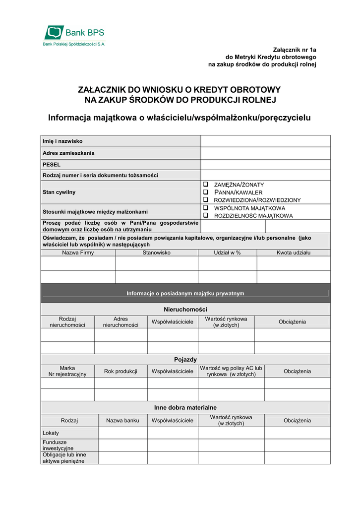 Załącznik nr 1a do Metryki Kredytu obrotowego na zakup środków do produkcji rolnej ZAŁACZNIK DO WNIOSKU O KREDYT OBROTOWY NA ZAKUP ŚRODKÓW DO PRODUKCJI ROLNEJ Informacja majątkowa o właścicielu/współmałżonku/poręczycielu Imię i nazwisko Adres zamieszkania PESEL Rodzaj numer i seria dokumentu tożsamości Stan cywilny ZAMĘŻNA/ŻONATY PANNA/KAWALER ROZWIEDZIONA/ROZWIEDZIONY Stosunki majątkowe między małżonkami WSPÓLNOTA MAJĄTKOWA ROZDZIELNOŚĆ MAJĄTKOWA Proszę podać liczbę osób w Pani/Pana gospodarstwie domowym oraz liczbę osób na utrzymaniu Oświadczam, że posiadam / nie posiadam powiązania kapitałowe, organizacyjne i/lub personalne (jako właściciel lub wspólnik) w następujących Nazwa Firmy Stanowisko Udział w % Kwota udziału Informacje o posiadanym majątku prywatnym Nieruchomości Rodzaj nieruchomości Adres nieruchomości Współwłaściciele Wartość rynkowa (w złotych) Obciążenia Pojazdy Marka Nr rejestracyjny Rok produkcji Współwłaściciele Wartość wg polisy AC lub rynkowa (w złotych) Obciążenia Inne dobra materialne Rodzaj Lokaty Fundusze inwestycyjne Obligacje lub inne aktywa pieniężne Nazwa banku Współwłaściciele Wartość rynkowa (w złotych) Obciążenia Inne Informacje o zaciągniętych kredytach, pożyczkach, otrzymanych gwarancjach, zobowiązaniach leasingowych (w tym również konsumpcyjnych) Nazwa Banku lub towarzystwa leasingowego Wysokość zobowiązania (w złotych) Kredyt/Poręczenie Ostateczny termin spłaty Zabezpieczenie Informacje o majątku i zobowiązaniach Wartość (w złotych) Pozycja Łączna wartość prywatnego majątku Prywatne kredyty/pożyczki w Banku BPS Prywatne kredyty/pożyczki/ zobowiązania w innych bankach/ innych instytucjach finansowych Inne prywatne zobowiązania Inne dochody prywatne (nie związane z prowadzoną działalnością rolniczą) Oświadczenia Wyrażam zgodę na przetwarzanie danych osobowych, zawartych w niniejszym kwestionariuszu w celu zawarcia i realizacji przedmiotowej transakcji oraz działań marketingowych prowadzonych przez Bank BPS SA. Dane osobowe, zawarte w niniejszym kwestionariuszu, Bank będzie przetwarzać wyłącznie w celu zawarcia i realizacji przedmiotowej transakcji, oraz działań marketingowych, i nie będzie udostępniać innym podmiotom, z wyjątkiem podmiotów i okoliczności ich ujawnienia przewidzianych w ustawie z dnia 29 sierpnia 1997 r. Prawo bankowe (tekst jednolity Dz. U. z 2002 r. Nr 72, poz. 665 z późn. zm.), oraz innych przepisach powszechnie obowiązujących. Bank informuje niniejszym o prawie osoby udostępniającej swoje dane do wglądu do danych oraz ich poprawiania zgodnie z art. 32-35 ustawy z dnia 29 sierpnia 1997r. o ochronie danych osobowych (tekst jednolity Dz. U. z 2002r. Nr 101 poz. 926 z późn. zm.). Dane zostały podane dobrowolnie. Oświadczam pod rygorem odpowiedzialności karnej przewidzianej w art. 297 § 1 Kodeksu karnego, że informacje podane w tym kwestionariuszu są zgodne ze stanem faktycznym. ...................................................... ........................................................... miejscowość, data /podpis osoby składającej kwestionariusz/ 2