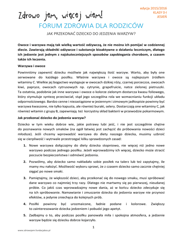 edycja 2015/2016 KLASY 0-I JESIEŃ FORUM ZDROWIA DLA RODZICÓW JAK PRZEKONAĆ DZIECKO DO JEDZENIA WARZYW? Owoce i warzywa mają tak wielką wartość odżywczą, że nie można ich pomijać w codziennej diecie. Zawierają składniki odżywcze i substancje bioaktywne o działaniu leczniczym, dlatego ich jedzenie jest jednym z najskuteczniejszych sposobów zapobiegania chorobom, a czasem także ich leczenia. Warzywa i owoce Powinniśmy zapewnić dziecku możliwie jak największą ilość warzyw. Warto, aby były one serwowane do każdego posiłku. Właśnie warzywa i owoce są najlepszym źródłem witaminy C. Wielkie jej bogactwo występuje w owocach dzikiej róży, czarnej porzeczce, owocach kiwi, papryce, owocach cytrusowych np. cytrynie, grapefruicie, natce zielonej pietruszki. Ta ostatnia, podobnie jak inne warzywa i owoce o kolorze zielonym dostarcza kwasu foliowego, który stymuluje syntezę przeciwciał, stąd jego szczególna rola we wzmacnianiu funkcji układu odpornościowego. Bardzo cenne i niezastąpione w jesiennym i zimowym jadłospisie powinny być warzywa kwaszone, nie tylko kapusta, ale również buraki, selery. Dostarczają one witaminy C, jak również witamin z grupy B, zapewniają też korzystny skład bakterii w przewodzie pokarmowym. Jak przekonać dziecko do jedzenia warzyw? Dziecko w tym wieku dobrze wie, jakie potrawy lubi jeść, i nie jest szczególnie chętne do poznawania nowych smaków (na ogół łatwiej jest zachęcić do próbowania nowości dzieci młodsze). Jeśli chcemy wprowadzić warzywa do diety naszego dziecka, musimy uzbroić się w cierpliwość i wytrwale przestrzegać kilku sprawdzonych zasad: 1. Nowe warzywa dołączajmy do diety dziecka stopniowo, nie więcej niż jedno nowe warzywo podczas jednego posiłku. Jeżeli wprowadzimy ich więcej, dziecko może stracić poczucie bezpieczeństwa i odmówić jedzenia. 2. Pozwólmy, aby dziecko samo nakładało sobie posiłek na talerz lub też zapytajmy, ile mamy mu nałożyć. Możliwość wyboru sprawi, że z czasem dziecko samo zacznie chętniej sięgać po nowe smaki. 3. Pamiętajmy, że większość dzieci, aby przekonać się do nowego smaku, musi spróbować dane warzywo co najmniej trzy razy. Dlatego nie martwmy się po pierwszej, nieudanej próbie. Co jakiś czas wprowadzajmy nowe dania, aż w końcu dziecko zdecyduje się na ich spróbowanie. Namawianie i zmuszanie dziecka do jedzenia warzyw nie przynosi efektów, a jedynie zniechęca do kolejnych prób. 4. Posiłki powinny być urozmaicone, ładnie podane to zainteresowanie dziecka jedzeniem i pobudzi jego apetyt. i kolorowe. Zwiększy 5. Zadbajmy o to, aby podczas posiłku panowała miła i spokojna atmosfera, a jedzenie warzyw będzie się dziecku dobrze kojarzyło. www.zdrowojem.fundacjabos.pl 1 edycja 2015/2016 KLASY 0-I JESIEŃ 6. Dziecko bardzo chce być traktowane jak dorosły – pozwólmy mu więc, aby sam wybrał warzywa, które chciałby zjeść. Świetnym pomysłem na zachęcenie dziecka do jedzenia warzyw jest wspólna wyprawa do sklepu po warzywa, a następnie w domu wspólne z dzieckiem przyrządzanie z nich posiłku dla całej rodziny. 7. Pamiętajmy, że dzieci najlepiej uczą się przez obserwację. Jeżeli chcemy, aby nasze dziecko jadło warzywa, sami powinniśmy je jeść i dawać dobry przykład, odżywiając się zdrowo. Gdy jemy ten sam posiłek, dziecko czuje się bezpiecznie i ma większą odwagę do próbowania nowych smaków. Gdy cierpliwie wprowadzimy powyższe zasady w życie, to okaże się, że nie musimy już namawiać naszej pociechy do zdrowego jedzenia, a warzywa jako pierwsze zaczną znikać z dziecięcego talerza. więcej na www.aktywniepozdrowie.pl www.zdrowojem.fundacjabos.pl 2