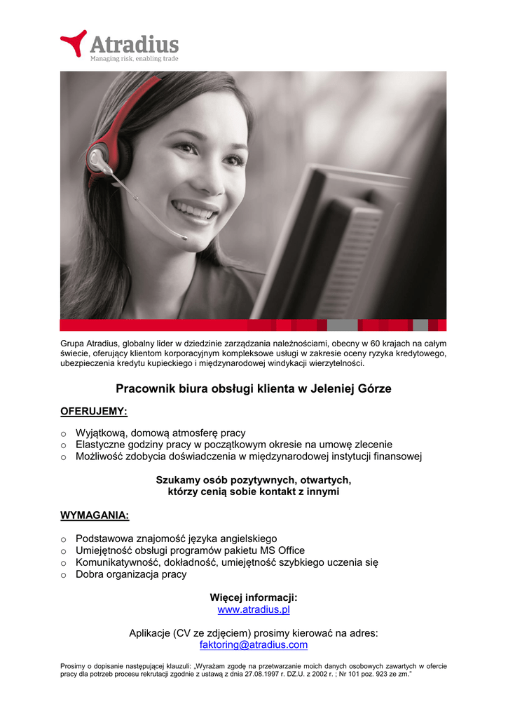 Grupa Atradius, globalny lider w dziedzinie zarządzania należnościami, obecny w 60 krajach na całym świecie, oferujący klientom korporacyjnym kompleksowe usługi w zakresie oceny ryzyka kredytowego, ubezpieczenia kredytu kupieckiego i międzynarodowej windykacji wierzytelności. Pracownik biura obsługi klienta w Jeleniej Górze OFERUJEMY: o Wyjątkową, domową atmosferę pracy o Elastyczne godziny pracy w początkowym okresie na umowę zlecenie o Możliwość zdobycia doświadczenia w międzynarodowej instytucji finansowej Szukamy osób pozytywnych, otwartych, którzy cenią sobie kontakt z innymi WYMAGANIA: o o o o Podstawowa znajomość języka angielskiego Umiejętność obsługi programów pakietu MS Office Komunikatywność, dokładność, umiejętność szybkiego uczenia się Dobra organizacja pracy Więcej informacji: www.atradius.pl Aplikacje (CV ze zdjęciem) prosimy kierować na adres: [email protected] Prosimy o dopisanie następującej klauzuli: „Wyrażam zgodę na przetwarzanie moich danych osobowych zawartych w ofercie pracy dla potrzeb procesu rekrutacji zgodnie z ustawą z dnia 27.08.1997 r. DZ.U. z 2002 r. ; Nr 101 poz. 923 ze zm.”