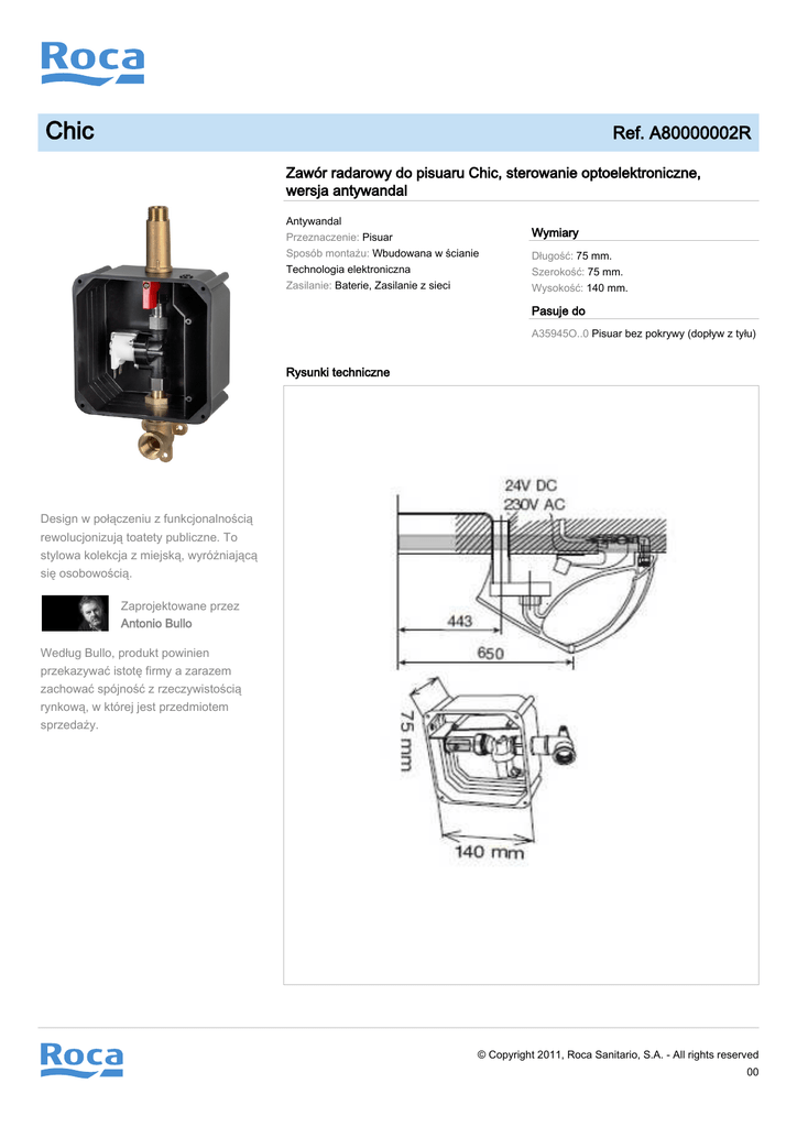 Chic Ref. A80000002R Zawór radarowy do pisuaru Chic, sterowanie optoelektroniczne, wersja antywandal Antywandal Przeznaczenie: Pisuar Sposób montażu: Wbudowana w ścianie Technologia elektroniczna Zasilanie: Baterie, Zasilanie z sieci Wymiary Długość: 75 mm. Szerokość: 75 mm. Wysokość: 140 mm. Pasuje do A35945O..0 Pisuar bez pokrywy (dopływ z tyłu) Rysunki techniczne Design w połączeniu z funkcjonalnością rewolucjonizują toatety publiczne. To stylowa kolekcja z miejską, wyróżniającą się osobowością. Zaprojektowane przez Antonio Bullo Według Bullo, produkt powinien przekazywać istotę firmy a zarazem zachować spójność z rzeczywistością rynkową, w której jest przedmiotem sprzedaży. © Copyright 2011, Roca Sanitario, S.A. - All rights reserved 00