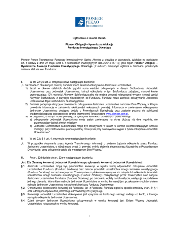 Ogłoszenie o zmianie statutu Pioneer Obligacji – Dynamiczna Alokacja Funduszu Inwestycyjnego Otwartego Pioneer Pekao Towarzystwo Funduszy Inwestycyjnych Spółka Akcyjna z siedzibą w Warszawie, działając na podstawie art. 4 ustawy z dnia 27 maja 2004 r. o funduszach inwestycyjnych (Dz.U.2014.157 t.j.) jako organ Pioneer Obligacji – Dynamiczna Alokacja Funduszu Inwestycyjnego Otwartego („Fundusz”) niniejszym ogłasza o dokonaniu poniższych zmian w statucie ww. Funduszu: I. W art. 22 § 6 ust. 3. otrzymuje nowe następujące brzmienie: „3. Na zasadach określonych poniżej, Fundusz może zawiesić odkupywanie Jednostek Uczestnictwa. 1) Jeżeli w okresie ostatnich dwóch tygodni suma wartości odkupionych w danym Subfunduszu Jednostek Uczestnictwa oraz Jednostek Uczestnictwa, których odkupienia w tym Subfunduszu zażądano, stanowi kwotę przekraczającą 10% wartości Aktywów Subfunduszu albo nie można dokonać wiarygodnej wyceny istotnej części Aktywów Subfunduszu z przyczyn niezależnych od Funduszu, Fundusz może zawiesić odkupywanie Jednostek Uczestnictwa tego Subfunduszu na dwa tygodnie. 2) Fundusz podejmuje decyzję o zawieszeniu odkupywania Jednostek Uczestnictwa na koniec Dnia Wyceny, w którym poweźmie informację o zaistnieniu okoliczności wskazanych powyżej. Informacja o zawieszeniu odkupywania Jednostek Uczestnictwa dostępna będzie u Prowadzących Dystrybucję oraz zostanie podana do publicznej wiadomości poprzez ogłoszenie na stronie internetowej Towarzystwa www.pioneer.com.pl. 3) W przypadku, o którym mowa powyżej, za zgodą i na warunkach określonych przez Komisję: a) odkupywanie Jednostek Uczestnictwa może zostać zawieszone na okres dłuższy niż dwa tygodnie, nie przekraczający jednak dwóch miesięcy; b) Jednostki Uczestnictwa Subfunduszu mogą być odkupywane w ratach w okresie nieprzekraczającym sześciu miesięcy, przy zastosowaniu proporcjonalnej redukcji lub przy dokonywaniu wypłat z tytułu odkupienia Jednostek Uczestnictwa.” II. „4. III. W art. 22c § 1 ust. 4. otrzymuje nowe następujące brzmienie: W przypadku otrzymania przez Agenta Transferowego informacji o złożeniu żądania odkupienia przez Fundusz Jednostek Uczestnictwa, o której mowa w ust. 3. powyżej, w dniu złożenia zlecenia przez Uczestnika u Prowadzącego Dystrybucję, cenę odkupienia ustala się w następnym Dniu Wyceny.” Po art. 22d dodaje się art. 22e w następującym brzmieniu: „Art. 22e [Terminy konwersji Jednostek Uczestnictwa po zgłoszeniu konwersji Jednostek Uczestnictwa] § 1. Jednostki Uczestnictwa mogą być przedmiotem konwersji, w wyniku której odpowiednio odkupienie Jednostek Uczestnictwa Funduszu (Fundusz Źródłowy) oraz nabycie jednostek uczestnictwa innego funduszu inwestycyjnego (Fundusz Docelowy) zarządzanego przez Towarzystwo, po dokonaniu wpłaty na ich nabycie lub odkupienie jednostek uczestnictwa innego funduszu inwestycyjnego (Fundusz Źródłowy) zarządzanego przez Towarzystwo oraz nabycie Jednostek Uczestnictwa Funduszu (Fundusz Docelowy), po dokonaniu wpłaty na ich nabycie, następuje na podstawie jednego zlecenia. Warunkiem nabycia Jednostek Uczestnictwa w wyniku konwersji jest przekazanie środków tytułem nabycia Jednostek Uczestnictwa na rachunek bankowy Funduszu Docelowego. § 2. O możliwości dokonywania konwersji do Funduszu, jak i z Funduszu, Fundusz ogłosi w sposób określony w art. 31 § 1 oraz udostępni odpowiednią informację u Prowadzących Dystrybucję. § 3. Konwersja Jednostek Uczestnictwa dokonywana jest wyłącznie na konto tego samego rodzaju co konto, z którego nastąpiło odkupienie Jednostek Uczestnictwa. § 4. Dzień Wyceny Jednostek Uczestnictwa odkupywanych w wyniku konwersji jest Dniem Wyceny Jednostek Uczestnictwa nabywanych w wyniku konwersji. 1 § 5. Z zastrzeżeniem zdania kolejnego, odkupienie Jednostek Uczestnictwa w wyniku konwersji dokonywane jest w Dniu Wyceny następującym po Dniu Wyceny, w którym Agent Transferowy otrzymał informację o złożeniu przez Uczestnika u Prowadzącego Dystrybucję stosownego zlecenia. W przypadku jeżeli nie jest możliwe przekazanie środków na rachunek bankowy Funduszu Docelowego, konwersja dokonywana jest w pierwszym Dniu Wyceny, w którym wykonanie zlecenia (przekazanie środków na rachunek bankowy Funduszu Docelowego) stanie się możliwe. Do ustalenia Dnia Wyceny Jednostek Uczestnictwa będących przedmiotem konwersji mają zastosowanie zasady ustalania Dnia Wyceny konwersji Jednostek Uczestnictwa obowiązujące w Funduszu Źródłowym. § 6. Okres pomiędzy złożeniem zlecenia konwersji Jednostek Uczestnictwa a Dniem Wyceny, w którym ustalana jest cena konwersji Jednostek Uczestnictwa, nie będzie dłuższy niż siedem dni. Warunkiem realizacji zlecenia konwersji Jednostek Uczestnictwa w powyższym terminie jest złożenie zlecenia zgodnie z zasadami wskazanymi w Statucie i Prospekcie Informacyjnym Funduszu. Termin, o którym mowa w zdaniu poprzednim, może ulec wydłużeniu w przypadku braku lub wadliwości informacji niezbędnej do realizacji konwersji, przedstawionej przez Uczestnika w zleceniu konwersji Jednostek Uczestnictwa. W takim przypadku realizacja zlecenia następuje w następnym Dniu Wyceny po dniu, w którym Agent Transferowy otrzyma wszystkie informacje niezbędne do realizacji konwersji. Jeżeli realizacja prawidłowo złożonego zlecenia konwersji nastąpi w terminie dłuższym niż siedem dni, wówczas Uczestnikowi przysługuje wypłata odszkodowania na zasadach opisanych w Prospekcie Informacyjnym Funduszu w Rozdziale III pkt. 12. § 7. Sześć razy w roku kalendarzowym konwersja Jednostek Uczestnictwa jest zwolniona z części lub całości opłaty manipulacyjnej na następujących zasadach: 1. w przypadku, gdy konwersja następuje do Funduszu Docelowego o wyższej stawce opłaty manipulacyjnej, stosowana jest wyrównująca stawka opłaty manipulacyjnej, będąca różnicą wysokości stawki opłaty manipulacy