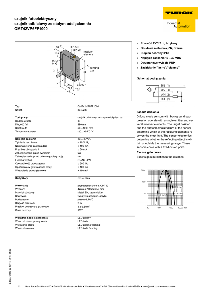 czujnik fotoelektryczny czujnik odbiciowy ze stałym odcięciem tła QMT42VP6FF1000 ■ Przewód PVC 2 m, 4-żyłowy ■ Obudowa metalowa, ZN, czarna ■ Stopień ochrony IP67 ■ Napięcie zasilania 10…30 VDC ■ Dwustanowe wyjście PNP ■ Zadziałanie "jasno"/"ciemno" Schemat podłączenia Typ Nr kat. QMT42VP6FF1000 3049233 Tryb pracy Rodzaj światła Długość fali Reichweite Temperatura pracy czujnik odbiciowy ze stałym odcięciem tła IR 880 nm 50…1000 mm -20…+55°C °C Napięcie zasilania Tętnienie resztkowe Nominalny prąd zasilania DC Prąd bez obciążenia I0 Zabezpieczenie przed zwarciem Zabezpieczenie przed odwrotną polaryzacją Funkcja wyjścia Częstotliwość przełączania Opóźnienie w gotowości do pracy Wyzwolenie przeciążeniowe 10… 30VDC < 10 % Uss ð 100 mA ð 50 mA tak tak NO/NZ , PNP ð 500 Hz ð 100 ms > 150 mA Certyfikaty CE, cURus Wykonanie Wymiary Materiał obudowy Soczewka Podłączenie Długość przewodu Przekrój poprzeczny przewodu: prostopadłościenna, QMT42 42mm x 18mm x 58 mm Metal, ZN, czarny lakier tworzywo sztuczne, acrylic przewód, PVC 2m Klasa ochrony 4 x 0.5mm IP67 Wskaźnik napięcia zasilania Wskaźnik stanu przełączenia Wskazanie błędu Wskaźnik alarmu LED zielony LED żółta LED zielona flashing LED żółta flashing Zasada działania Diffuse mode sensors with background suppression operate with a single emitter and several receiver elements. The target position and the photoelectric structure of the sensor determine which of the receiving elements receives the most light. The sensor electronics determine whether the reflecting object is within or outside the measuring range. These sensors come with a fixed cut-off point. Excess gain curve Excess gain in relation to the distance Edition • 2016-02-19T16:42:46+01:00 2 1/2 Hans Turck GmbH & Co.KG ñ D-45472 Mülheim an der Ruhr ñ Witzlebenstraße 7 ñ Tel. 0208 4952-0 ñ Fax 0208 4952-264 ñ [email protected] ñ www.turck.com czujnik fotoelektryczny czujnik odbiciowy ze stałym odcięciem tła QMT42VP6FF1000 Akcesoria montażowe Typ Nr kat. SMB30SK 3052523 Rysunek wymiarowy Uchwyt montażowy, czarne PBT, z płytą montażową, stal nierdzewna, dla obudów z gwintem 18 mm oraz serii QM42/ QMT42 SMB46S 3048748 Uchwyt montażowy, stal nierdzewna, dla serii QS18, QS30, MINI-BEAM, QM42/QMT42 SMB46L 3048747 Uchwyt montażowy, stal nierdzewna, dla serii QS18, QS30, Edition • 2016-02-19T16:42:46+01:00 MINI-BEAM, QM42/QMT42 2/2 Hans Turck GmbH & Co.KG ñ D-45472 Mülheim an der Ruhr ñ Witzlebenstraße 7 ñ Tel. 0208 4952-0 ñ Fax 0208 4952-264 ñ [email protected] ñ www.turck.com