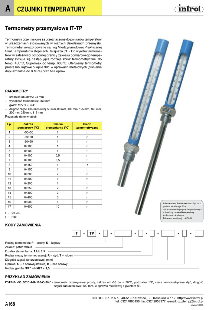 A CZUJNIKI TEMPERATURY Termometry przemysłowe IT-TP Termometry przemysłowe są przeznaczone do pomiarów temperatury w urządzeniach stosowanych w różnych dziedzinach przemysłu. Termometry wywzorcowane są wg Miedzynarodowej Praktycznej Skali Temperatur w stopniach Celsjusza (°C) .Do wyrobu termometrów w zależności od górnej granicy zakresu pomiarowego temperatury stosuje się następujące rodzaje szkła: termometryczne do temp. 400°C, Supermax do temp. 600°C. Oferujemy termometry proste lub kątowe o kącie 90° w oprawach metalowych (ciśnienie dopuszczalne do 8 MPa) oraz bez opraw. PARAMETRY – – – – średnica obudowy: 24 mm wysokość termometru: 260 mm gwint: M27 x 2, 3/4” długość części zanurzeniowej: 50 mm, 80 mm, 100 mm, 125 mm, 160 mm, 200 mm, 250 mm, 315 mm Pozostałe dane w tabeli: Lp. Zakres pomiarowy (°C) Działka elementarna (°C) Ciecz termometryczna 1 -50÷50 1 t 2 -30÷50 1 r 3 -20÷50 1 r 4 0÷100 1 r 5 0÷100 1 t 6 0÷100 0,5 r 7 0÷100 0,5 t 8 0÷150 1 r 9 0÷150 1 t 10 0÷200 2 r 11 0÷200 1 r 12 0÷200 1 t 13 0÷250 2 r 14 0÷300 2 r 15 0÷400 5 r 16 0÷500 5 r 17 0÷600 10 r t - toluen r - rtęć KODY ZAMÓWIENIA IT - TP - - - - - - - Rodzaj termometru: P – prosty, K – kątowy Zakres: patrz tabela Działka elementarna: 1 lub 0,5 Rodzaj cieczy termometrycznej: R – rtęć, T – toluen Długość części zanurzeniowej: (mm) Oprawa: O – z oprawą stalową, B – bez oprawy Rodzaj gwintu: 3/4” lub M27 x 1,5 PRZYKŁAD ZAMÓWIENIA IT-TP-P- -50..50°C-1-R-100-O-3/4” - termometr przemysłowy prosty, zakres od -50 do + 50°C, podziałka 1°C, ciecz termometryczna rtęć, długość części zanurzeniowej 100 mm, w oprawie metalowej z gwintem ¾”. A168 INTROL Sp. z o.o., 40-519 Katowice, ul. Ko ściusz ki 112, http://www.introl.pl tel. 032/ 7890150, fax 032/ 2053377, e-mail: [email protected] edycja 1/2005