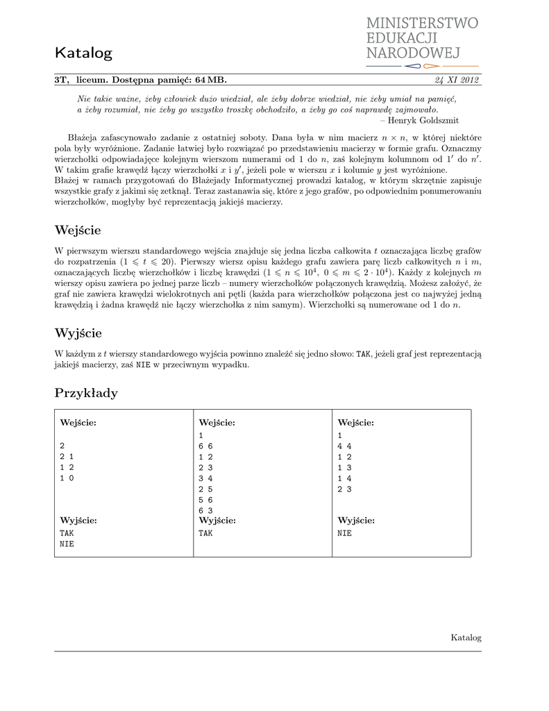 Katalog 3T, liceum. Dostępna pamięć: 64 MB. 24 XI 2012 Nie takie ważne, żeby człowiek dużo wiedział, ale żeby dobrze wiedział, nie żeby umiał na pamięć, a żeby rozumiał, nie żeby go wszystko troszkę obchodziło, a żeby go coś naprawdę zajmowało. – Henryk Goldszmit Błażeja zafascynowało zadanie z ostatniej soboty. Dana była w nim macierz n × n, w której niektóre pola były wyróżnione. Zadanie łatwiej było rozwiązać po przedstawieniu macierzy w formie grafu. Oznaczmy wierzchołki odpowiadajęce kolejnym wierszom numerami od 1 do n, zaś kolejnym kolumnom od 10 do n0 . W takim grafie krawędź łączy wierzchołki x i y 0 , jeżeli pole w wierszu x i kolumie y jest wyróżnione. Błażej w ramach przygotowań do Błażejady Informatycznej prowadzi katalog, w którym skrzętnie zapisuje wszystkie grafy z jakimi się zetknął. Teraz zastanawia się, które z jego grafów, po odpowiednim ponumerowaniu wierzchołków, mogłyby być reprezentacją jakiejś macierzy. Wejście W pierwszym wierszu standardowego wejścia znajduje się jedna liczba całkowita t oznaczająca liczbę grafów do rozpatrzenia (1 6 t 6 20). Pierwszy wiersz opisu każdego grafu zawiera parę liczb całkowitych n i m, oznaczających liczbę wierzchołków i liczbę krawędzi (1 6 n 6 104 , 0 6 m 6 2 · 104 ). Każdy z kolejnych m wierszy opisu zawiera po jednej parze liczb – numery wierzchołków połączonych krawędzią. Możesz założyć, że graf nie zawiera krawędzi wielokrotnych ani pętli (każda para wierzchołków połączona jest co najwyżej jedną krawędzią i żadna krawędź nie łączy wierzchołka z nim samym). Wierzchołki są numerowane od 1 do n. Wyjście W każdym z t wierszy standardowego wyjścia powinno znaleźć się jedno słowo: TAK, jeżeli graf jest reprezentacją jakiejś macierzy, zaś NIE w przeciwnym wypadku. Przykłady Wejście: 2 2 1 1 2 1 0 Wyjście: TAK NIE Wejście: 1 6 6 1 2 2 3 3 4 2 5 5 6 6 3 Wyjście: TAK Wejście: 1 4 4 1 2 1 3 1 4 2 3 Wyjście: NIE Katalog