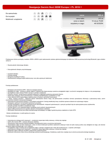 Nawigacja Garmin Nuvi 265W Europa + PL 2010.1 Do samochodu Do turystyki Mobilność urządzenia cena: 699 zł cena netto: 573 zł cena w ratach: 10 rat po 76,89 wysyłamy w ciągu: 48 GODZIN Podstawowa różnica pomiędzy modelem 255W a 265W to jest zastosowanie zestawu głośnomówiącego do telefonów GSM za pomocą technologii Bluetooth, jego unikalne cechy to: • Wysoka jakość zbieranego dźwięku • Duża głośność dźwięku przychodzącego • • • • Czystość dźwięku Prostota obsługi Mnogość przydatnych funkcji Rozbudowana obsługa książki telefonicznej i sms (dla wybranych telefonów) Funkcje podstawowe: • • • • • • Nawigacja samochodowa GPS - także do nawigacji pieszej. Nawigacja do zdjęć - wystarczy wybrać zdjęcie z zapisaną dla niego pozycją z poziomu przeglądarki zdjęć i uruchomić nawigację do miejsca z nim powiązanego. Szczegółowa mapa cyfrowa Polski i Europy w pamięci urządzenia. Poręczny rozmiar i wyrafinowana stylistyka połączona z legendarną jakością wykonania Garmin. Super jasny dotykowy ekran panoramiczny z warstwą antyrefleksyjną o przekatnej 4,3 cala. Czuły odbiornik GPS zapewniający stabilną pracę w trudnych warunkach terenowych. • Nowy, szybszy procesor - zapewnia lepsze odświeżanie ekranu mapy, ale jednocześnie umożliwia również sprawdzenie informacji o planowanej trasie, zanim uruchomiona zostanie rzeczywista nawigacja. • Automatyczne planowanie podróży z 10 punktami pośrednimi i funkcją rekalkulacji trasy umożliwia sprawne dotarcie do wybranego miejsca. • Nawigacja z głośnymi komunikatami głosowymi po polsku. • Funkcja ostrzegania o punktach niebezpiecznych (fotoradarach, miejscach patrolowanych, czarnych punktach itp) do wykorzystania przez użytkownika. • Gniazdo pamięci microSD na dodatkowe mapy. • Funkcja Garmin Lock zabezpieczająca nawigację przed osobami nieuprawnionymi. • Złącze USB przeznaczone do wymiany danych z komputerem osobistym. • Akumulator litowo-jonowy bez efektu pamięciowego pozwalający na ciągłą 4 godzinną pracę urządzenia w trybie GPS. Zestaw zainstalowany i w pełni gotowy do użycia. Funkcje dodatkowe: • Automatyczna obsługa stref czasowych - urzadzenie rozpoznaje strefę czasową, w której się znajduje. • HotFix dla modułu GPS - szybsza akwizycja satelitów. • Wbudowana mapa bazowa odzwierciedlająca ukształtowanie terenu za pomocą cieniowania. • Wyświetlanie zdjęć na liście Ulubionych - teraz na liście Ulubionych punktów użytkownik zobaczyć może nie tylko nazwę punktu oraz odległość do niego, ale również miniaturę zdjęcia powiązanego z tym miejscem. • Przeglądarka zdjęć (możliwe jest przeglądanie zdjęć z pamięci urządzenia jak i karty SD przełożonej np. z aparatu cyfrowego) • Automatyczna obsługa stref czasowych - urzadzenie rozpoznaje strefę czasową, w której się znajduje. • Możliwość zapisu własnych punktów użyteczności publicznej (POI). • Możliwość dokonania zmiany ikony aktualnego położenia podróżującego. Dodatkowy zasób ikon znajduje się na stronie producenta (dostęp bezpłatny). 29 - 07 - 2010 eNavigator.pl • Zaawansowany zestaw głośnomówiący do telefonów GSM. Cechy użytkowe: • Garmin Nuvi 265 WIDE to urządzenie, które zaskoczy Cię swoimi możliwościami zamkniętymi w tak niewielkiej, kompaktowej obudowie. Jest to model przeznaczony dla tych, którzy od nawigacji samochodowej oczekują prostoty, skuteczności oraz doskonałego wyświetlacza LCD w całości z bardzo przydatnym zestawem głośnomówiącym. • Odbiornik łatwo poprowadzi Cię tam, dokąd zechcesz. Aby znaleźć dowolny adres, restaurację, hotel, warsztat samochodowego, wystarczy dotknąć odpowiednią ikonkę na kolorowym wyświetlaczu Garmina. • Gdy już dotrzesz do wybranego miejsca, możesz łatwo zabrać go ze sobą. Po dotknięciu odpowiedniej ikony Nuvi zapamięta położenie samochodu, abyś później mógł do niego szybko wrócić. • Garmin Nuvi 265 WIDE nie tylko prowadzi Cię gdy jedziesz samochodem. Po przełączeniu w tryb pieszy ten GPS stanie się Twoim przewodnikiem w przechadzkach po obcym mieście. Wewnętrzne zasilanie pozwoli na ok. 4 godz. pracy w terenie. • Jeśli zdarzy Ci się zapomnieć w jaki sposób uruchomić jakąś funkcję w Twoim Nuvi 265 WIDE -nie martw się! Rozbudowany system pomocy w języku polskim, dostępny z każdego poziomu menu pomoże Ci szybko znaleźć właściwą funkcję. • Planując najlepszą trasę, możesz wskazać swoje preferencje (trasa przez określone miasto, omijanie dróg płatnych, zakaz zawracania, prowadzenie wyłącznie po drogach utwardzonych). • Ekran komputera podróży, będzie na bieżąco wyświetlał podstawowe parametry takie jak prędkość, odległość do celu, czas podróży, średnia prędkość etc. • Na pokładzie Nuvi 265 WIDE zainstalowano szczegółową mapę Polski i Europy z tysiącami planów miast. W razie potrzeby istnieje możliwość rozbudowania mapy o inne kraje. Do tego celu służy zamontowane w Nuvi gniazdo kart pamięci microSD. • Prosty i wygodny montaż w samochodzie zajmuje tylko krótką chwilę. Uchwyt Nuvi może być zamontowany na szybie dzięki specjalnej przyssawce. W zestawie jest również przejściówka do montażu na kokpicie bez konieczności wiercenia otworów montażowych. W samochodzie Garmin Nuvi 265 WIDE jest zasilany kablem podłączonym do gniazda zapalniczki. Zawartość zestawu: • • • • • nawigacja Garmin Nuvi 265 WIDE preinstalowana, cyfrowa mapa Garmin CityNavigator Europa + Polska 2010.1 uchwyt samochodowy z przyssawką podstawka uchwytu na kokpit kabel zasilający z gniazda zapalniczki Specyfikacja Kategoria Mobilne Obsługa map drogowych TAK Obsługa map turystycznych TAK Obsługa map morskich NIE Nawigacja Obsługa po polsku Planowanie trasy Unikanie TAK szybka, krótka, przełajowa dróg płatnych, autostrad, dróg gruntowych, zawrac