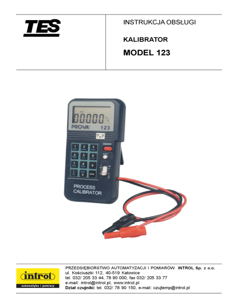 INSTRUKCJA OBS£UGI KALIBRATOR MODEL 123 PRZEDSIÊBIORSTWO AUTOMATYZACJI I POMIARÓW INTROL Sp. z o.o. ul. Koœciuszki 112, 40-519 Katowice tel. 032/ 205 33 44, 78 90 000, fax 032/ 205 33 77 e-mail: [email protected], www.introl.pl Dzia³ czujniki: tel. 032/ 78 90 150, e-mail: [email protected] INTROL Sp. z o.o., ul. Koœciuszki 112, 40-519 Katowice, tel. 032/ 78 90 150 fax 032/ 205 33 77, e-mail: [email protected], www.introl.pl W£AŒCIWOŒCI: 1. 4- 20 mA (obci¹¿enie 1 kΩ, zasilanie w pêtli 24 V) 2. 0- 100,00 mV, 0 - 1,000 V, 0 - 12 V 3. Termoelementy K, J, E, T (0C i 0F) 4. Czêstotliwoœæ 1 - 62500 Hz 5. Podstawowa dok³adnoœæ 0,025 % 6. Prosta obs³uga za pomoc¹ klawiatury 7. Funkcje "Easy Step" i "Auto Ramp" 8. Wybór 0 - 20 mA lub 0 - 24 mA 9. Wejœcie 0 - 100 % (mA, mV, V) 10. Sygnalizacja dŸwiêkowa, gdy wyjœcie jest otwarte (mA) lub zwarte (mV, V) 2 INTROL Sp. z o.o., ul. Koœciuszki 112, 40-519 Katowice, tel. 032/ 78 90 150 fax 032/ 205 33 77, e-mail: [email protected], www.introl.pl SPIS TREŒCI 1. Opis pulpitu ..................................................................................................... 4 2. Instrukcja obs³ugi ........................................................................................... 7 1.Wyjœcie mA ............................................................................................................................... 7 1a. Ogólna obs³uga 4 - 20 mA ................................................................................................. 7 1b. Wybór 0 - 20 mA lub 0 - 24 mA ........................................................................................ 8 1c. Wprowadzanie wartoœci mniejszych ni¿ 1 ......................................................................... 8 2. Wyjœcie mV, V .......................................................................................................................... 9 2a. Ogólna obs³uga 0 - 100 mV ............................................................................................... 9 2b. Wybór 0 - 1 V lub 0 - 12 V .............................................................................................. 10 2c. Wprowadzanie wartoœci mniejszych ni¿ 1 ....................................................................... 10 3. Wyjœcie czêstotliwoœci, Hz ..................................................................................................... 11 4. Kalibrowanie termoelementu w 0C, 0F ................................................................................... 11 4a. Ogólna obs³uga ................................................................................................................. 11 4b. Wybór 0C lub 0F ............................................................................................................... 13 4c. Wybór typu termoelementu K, J, E lub T ........................................................................ 14 4d. Wprowadzanie ujemnych temperatur .............................................................................. 14 5. "% Input" dla funkcji mA, mV i V ......................................................................................... 15 6. "Easy Step" dla funkcji mA, mV i V ...................................................................................... 16 7. "Auto Ramp" dla funkcji mA, mV i V ................................................................................... 16 8. Uzyskiwanie ujemnego wyjœcia ............................................................................................. 19 3. Charakterystyka elektryczna (230C±50C, 3 minuty po w³¹czeniu zasilania) ............................................ 20 4. Zastosowanie zasilacza AC ......................................................................... 24 5. Zastosowanie zewnêtrznego pojemnika na baterie .................................. 24 6. Wymiana baterii .......................................................................................... 25 3 INTROL Sp. z o.o., ul. Koœciuszki 112, 40-519 Katowice, tel. 032/ 78 90 150 fax 032/ 205 33 77, e-mail: [email protected], www.introl.pl 1. Opis pulpitu 1. wyœwietlacz lcd (ciek³okrystaliczny) 2. gniazdo termoelementu 3. przycisk on/off (w³¹czania / wy³¹czania) 4. przycisk "shift" (przesuwania) 5. prze³¹cznik wyboru funkcji 6. klawiatura numeryczna i funkcji 7. wspornik 8. gniazdo wejœcia zasilacza ac 9. wyprowadzenia wyjœcia 1. 2. 3. 4. 5. 6. 7. 8. 9. 10. mVAHz: 04-202mA: %: JKET: : Jednostki Zakres dla mA Procenty Typ termoelementu Równomierny wzrost lub spadek (Ramp) OPR: OL: STBY: SHIFT: 4 Dzia³anie, Wyjœcie, Normalne Przeci¹¿enie, Wyjœcie, Nienormalne Gotowoœæ, Trwa wew. kalibrowanie Wybór funkcji SHIFT S³aba bateria INTROL Sp. z o.o., ul. Koœciuszki 112, 40-519 Katowice, tel. 032/ 78 90 150 fax 032/ 205 33 77, e-mail: [email protected], www.introl.pl 1. Aby wybraæ ¿¹dany zakres w mA, nale¿y nacisn¹æ przycisk SHIFT, a nastêpnie jeden z przedstawionych na rysunku trzech przycisków. 2. Aby wybraæ ¿¹dany zakres w mV lub V, nale¿y nacisn¹æ przycisk SHIFT, a nastêpnie przycisk przedstawiony na rysunku. 3. Aby wybraæ 0C lub 0F, nale¿y nacisn¹æ przycisk SHIFT, a nastêpnie przycisk przedstawiony na rysunku. 5 INTROL Sp. z o.o., ul. Koœciuszki 112, 40-519 Katowice, tel. 032/ 78 90 150 fax 032/ 205 33 77, e-mail: [email protected], www.introl.pl 4. Aby wybraæ ¿¹dany typ termoelementu, nale¿y nacisn¹æ przycisk SHIFT, a nastêpnie przycisk przedstawiony na rysunku. 5. Aby realizowaæ funkcjê "Auto-ramp", nale¿y nacisn¹æ przycisk SHIFT, a nastêpnie przycisk przedstawiony na rysunku. Aby zatrzymaæ funkcjê "Auto-ramp", nale¿y powtórnie nacisn¹æ przycisk przedstawiony na rysunku. 6. Aby wprowadziæ ujemn¹ wartoœæ temperatury, nale¿y nacisn¹æ przycisk przedstawiony na rysunku. Albo nacisn¹æ przycisk SHIFT, a nastêpnie przycisk przedstawiony na rysunku przed wprowadzeniem