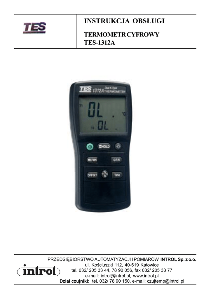 INSTRUKCJA OBSŁUGI TERMOMETR CYFROWY TES-1312A PRZEDSIĘBIORSTWO AUTOMATYZACJI I POMIARÓW INTROL Sp. z o.o. ul. Kościuszki 112, 40-519 Katowice tel. 032/ 205 33 44, 78 90 056, fax 032/ 205 33 77 e-mail: [email protected], www.introl.pl Dział czujniki: tel. 032/ 78 90 150, e-mail: [email protected] INTROL Sp. z o.o., ul. Kościuszki 112, 40-519 Katowice, tel.: 32/7890150, faks: 032/2053377, e-mail: [email protected], www.introl.pl SPIS TREŚCI 1. Wprowadzenie .................................................................................................. 3 2. Specyfikacja ...................................................................................................... 4 2.1. Parametry .................................................................................................................. 4 2.2. Specyfikacja ogólna .................................................................................................. 5 3. Nazwy elementów i ich położenie .................................................................. 6 4. Zasady użytkowania ......................................................................................... 7 5. Sygnalizacja otwartego obwodu termopary (błędne wskazanie) ............... 7 6. Procedura ponownego wzorcowania (kalibracji) ......................................... 8 7. Konserwacja/ utrzymanie ............................................................................... 8 7.1. Czyszczenie: .............................................................................................................. 8 7.2. Wymiana baterii ........................................................................................................ 8 8. Dodatkowe akcesoria ..................................................................................... 8 2 INTROL Sp. z o.o., ul. Kościuszki 112, 40-519 Katowice, tel.: 32/7890150, faks: 032/2053377, e-mail: [email protected], www.introl.pl 1. Wprowadzenie TES-1312A jest termometrem cyfrowym współpracującym z każdą termoparą typu-K jako czujnikiem temperatury. Wskazania temperatury zgodne są ze standardem ITS-90. • Przeczytać uważnie poniższe informacje dotyczące bezpieczeństwa przed rozpoczęciem użytkowania lub naprawy urządzenia; • Używać urządzenie jedynie w sposób opisany w instrukcji; w przeciwnym wypadku urządzenie może nie być w pełni bezpieczne. Warunki środowiskowe 1. Wysokość nad poziomem morza do 2000 m; 2. Wilgotność względna do 80%; 3. Temperatura użytkowania od 0 ~ 50 °C (32 °F ~ 122 °F). Podczas naprawy używać tylko oryginalnych części zamiennych. znak bezpieczeństwa 3 INTROL Sp. z o.o., ul. Kościuszki 112, 40-519 Katowice, tel.: 32/7890150, faks: 032/2053377, e-mail: [email protected], www.introl.pl 2. Specyfikacja 2.1. Parametry Zakres temperatury: -200 do 1360 °C -200 do 1999 °F Rozdzielczość: 0,1 °C, 0,1 °F przy temperaturach od 0 do ± 200 1 °C, 1 °F przy temperaturach od + 200 ~ 2000 4 INTROL Sp. z o.o., ul. Kościuszki 112, 40-519 Katowice, tel.: 32/7890150, faks: 032/2053377, e-mail: [email protected], www.introl.pl Dokładność podstawowa (Kalibracja dla 23 ± 5 °C) Funkcja °C °C °C °F °F Zakres Dokładność -200°C do -93°C -93°C do 1000°C 1000°C do 1360°C -200°F do 1832°F 1832° do 1999°F 0.3% ± 5°C 0.3% ± 1°C 0.5% ± 1°C 0.3% ± 2°C 0.5% ± 2°C UWAGA Powyższe parametry dokładności urządzenia nie biorą pod uwagę błędów dotyczących czujnika temperatury. W celu uzyskanie dodatkowych informacji sprawdzić specyfikację dokładności czujnika temperatury. Współczynniki temperaturowe: 0,1 x wymagana dokładność / °C 0°C ~ 18° & 28°C ~ 50°C (32°F ~ 64.4°F & 50.4°F ~ 122°F) 2.2. Specyfikacja ogólna Zasilanie: Żywotność baterii: Automatyczne wyłączenie: Wskaźnik wyczerpania baterii: Częstotliwość pomiarów: Waga: Wymiary: Temperatura pracy: Temperatura przechowywania: Wilgotność względna: Akcesoria: 6 x baterie (AAA) ok. 200 godzin (bateria węglowo – cynkowa) po upływie 30 min. (gdy nie jest używany żaden klawisz) symbol (BT) wyświetla się w momencie gdy napięcie baterii spada poniżej poziomu zapewniającego poprawne działanie jeden raz na sekundę 235 gm 150 x 72 x 35 mm (długość/szerokość/wysokość) 0 do 50 °C (32 do 122 °F) przy wilgotności względnej: poniżej 80% -10 do 60 °C, 14 do 140 °F poniżej 70% 6 baterii, instrukcja obsługi 5 INTROL Sp. z o.o., ul. Kościuszki 112, 40-519 Katowice, tel.: 32/7890150, faks: 032/2053377, e-mail: [email protected], www.introl.pl 3. Nazwy elementów i ich położenie 10 11 1 2 3 6 4 7 5 8 9 Opis do rysunku: 1.Wyświetlacz LCD: Główny wyświetlacz: odczyt T1, T2 lub T1-T2 Drugi wyświetlacz: odczyt T1 lub T2 i odczyt MAX- temperatura maksymalna, MIN- temperatura minimalna, AVG temperatura średnia Trzeci wyświetlacz: Zegar (24 – godzinny), pokazuje czas gdy osiągana była temperatura MAX, MIN oraz AVG po naciśnięciu przycisku zegara. 2. Przycisk blokady odczytu (HOLD): wcisnąć przycisk HOLD aby wstrzymać odczyt (pojawi się oznaczenie H). Ponowne wciśnięcie przycisku zwolni blokadę. 3. Przycisk ON/OFF: nacisnąć przycisk, aby włączyć lub wyłączyć urządzenie. 4. Przycisk MX/MN: wcisnąć przycisk MX/MN aby przejść między funkcjami MIN, MAX, AVG- rzeczywista (pomiar średniej rzeczywistej z 9,7 godziny) i funkcją blokady automatycznego wyłączenia. Główny wyświetlacz wyświetla aktualny odczyt. Czas który upłynął od rozpoczęcia odczytu, lub czasy w których osiągnięta została temperatura MAX, MIN oraz AVG również pojawia się na wyświetlaczu. Wciśnięcie i przytrzymanie przez jedna sekundę przycisku MX/MN spowoduje wyjście z trybu MX/MN. 5. Przycisk OFFSET: wcisnąć przycisk OFFSET aby wyzerować aktualne wskazanie urządzenia.. Ponowne wciśnięcie wyłączy tryb OFFSET. 6. Przycisk *: Wciśnięcie przycisku powoduje włączenie/ wyłączenie podświetlenia. Podświetlen