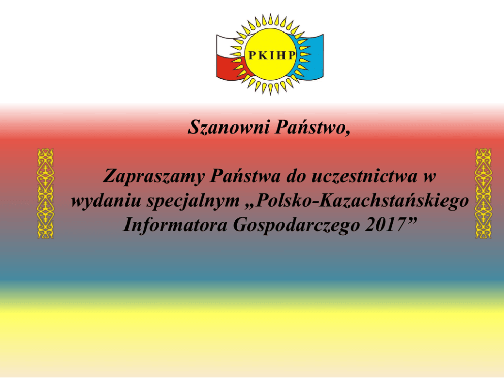 Szanowni Państwo, Zapraszamy Państwa do uczestnictwa w wydaniu specjalnym „Polsko-Kazachstańskiego Informatora Gospodarczego 2017” Jaki jest cel wydania Informatora? Prezentacja firmy na Światowej Wystawie EXPO w Astanie; Promocja produktów i usług polskich przedsiębiorstw na rynku kazachstańskim; Pozyskanie nowych kontaktów handlowych z kazachstańskimi firmami zainteresowanymi rozszerzeniem polsko-kazachskiej współpracy handlowej; Pozyskanie nowych klientów, zainteresowanych działalnością, usługami oraz produkcją polskich firm; Znalezienie nisz rynkowych; Zwiększenie świadomości polskich firm w aspekcie potrzeby udziału w przedsięwzięciach informacyjno-promocyjno-wydawniczych, których celem jest prezentacja oferty eksportowej firm przy wchodzeniu na zagraniczne rynki zbytu; Tworzenie pozytywnego wizerunku polskich produktów, przede wszystkim z punktu widzenia ich wysokiej, jakości; Umocnienie wizerunku Polski i polskich przedsiębiorców w Kazachstanie; Polsko-Kazachstańska Izba Handlowo-Przemysłowa ul. Trębacka 4, 00-074 Warszawa Gdzie będzie rozpowszechniany Informator? Podczas Światowej Wystawy EXPO 2017 Podczas imprez targowo-wystawienniczych w 2017 roku Wydarzeń promujących współpracę Polsko-Kazachstańską W placówkach dyplomatycznych oraz organizacjach zrzeszających przedsiębiorców kazachstańskich: - Ambasada Republiki Kazachstanu w Polsce, - Ambasada Rzeczypospolitej Polskiej w Kazachstanie, - Wydział Promocji Handlu i Inwestycji Ambasady Rzeczypospolitej Polskiej w Astanie, z siedzibą w Ałmaty, - Przedstawicielstwo PKIHP w Astanie, Szymkencie, Pawłodarze, - Oddziały Niezależnej Asocjacji Przedsiębiorców Kazachstanu, - Narodowa Izba Kazachstanu w Astanie, - Narodowa Agencja Kazachstanu ds. Eksportu i Inwestycji Kaznex Invest Polsko-Kazachstańska Izba Handlowo-Przemysłowa ul. Trębacka 4, 00-074 Warszawa Dane techniczne Format A4 Nakład 10 000 egz. Druk Arkuszowy, offset, CMYK Oprawa Klejona Papier Kreda mat 125g/m2, okładka: papier kredowy Uszlachetnienie druku Zewnętrzna część okładki (I i IV strona) lakierowana Materiały CD – zgodne ze specyfikacją Data publikacji maj 2017r. l Polsko-Kazachstańska Izba Handlowo-Przemysłowa ul. Trębacka 4, 00-074 Warszawa Cennik powierzchni reklamowych ¼ strony A4 1 000,00 zł (netto) Połowa strony A4 1 600,00 zł (netto) Pełna strona A4 2 500,00 zł (netto) Rozkładówka na dwóch stronach A4 3 700,00 zł (netto) Tył okładki 5 000,00 zł(netto) Polsko-Kazachstańska Izba Handlowo-Przemysłowa ul. Trębacka 4, 00-074 Warszawa Warunki techniczne dla dostarczanych reklam: - preferowane formaty plików: pdf, tif, jpg (dobrej, jakości); - wymiary fizyczne reklamy winne być adekwatne do wybranej powierzchni druku; - rozdzielczość grafiki bitmapowej 300 dpi.; - kolor CMYK; - w przypadku gotowych reklam tekst winien być scalony z tłem lub zapisany, jako krzywe. Polsko-Kazachstańska Izba Handlowo-Przemysłowa ul. Trębacka 4, 00-074 Warszawa Rozszerzenie oferty W przypadku, gdy nie dysponują Państwo gotowym materiałem reklamowym, oferujemy bezpłatne wykonanie reklamy. Do tego celu wymagane jest przysłanie przez Państwa treści tekstowej, jaką chcą Państwo zamieścić w reklamie (opis produktów / usług, dane teleadresowa), a także przesłanie logotypu firmy oraz fotografii towarów / głównej grafiki. Oferujemy również bezpłatne tłumaczenie tekstu na język kazachski. Polsko-Kazachstańska Izba Handlowo-Przemysłowa ul. Trębacka 4, 00-074 Warszawa KONTAKT: Polsko-Kazachstańska Izba Handlowo-Przemysłowa ul. Trębacka 4, 00-074 Warszawa tel/fax: + 48 22 630 97 82; tel: + 48 22 630 96 53; e-mail: [email protected], www.pkihp.pl Jan Wyrozumski [email protected] tel. 504 370 451