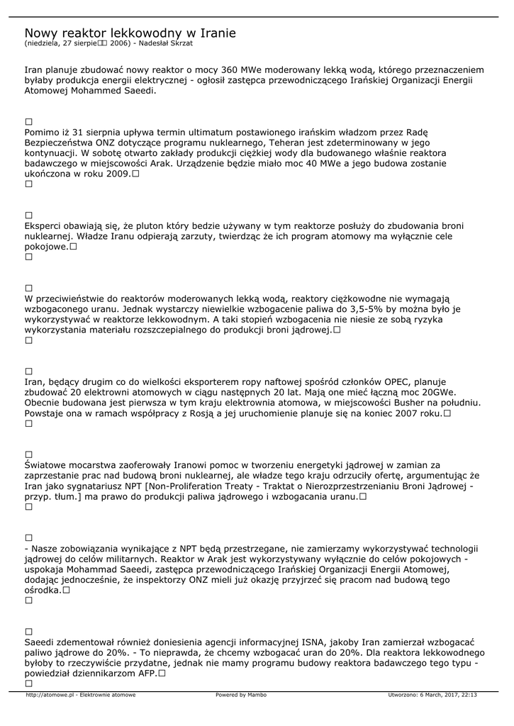 Nowy reaktor lekkowodny w Iranie (niedziela, 27 sierpieÅ„ 2006) - Nadesłał Skrzat Iran planuje zbudować nowy reaktor o mocy 360 MWe moderowany lekką wodą, którego przeznaczeniem byłaby produkcja energii elektrycznej - ogłosił zastępca przewodniczącego Irańskiej Organizacji Energii Atomowej Mohammed Saeedi. Pomimo iż 31 sierpnia upływa termin ultimatum postawionego irańskim władzom przez Radę Bezpieczeństwa ONZ dotyczące programu nuklearnego, Teheran jest zdeterminowany w jego kontynuacji. W sobotę otwarto zakłady produkcji ciężkiej wody dla budowanego właśnie reaktora badawczego w miejscowości Arak. Urządzenie będzie miało moc 40 MWe a jego budowa zostanie ukończona w roku 2009. Eksperci obawiają się, że pluton który bedzie używany w tym reaktorze posłuży do zbudowania broni nuklearnej. Władze Iranu odpierają zarzuty, twierdząc że ich program atomowy ma wyłącznie cele pokojowe. W przeciwieństwie do reaktorów moderowanych lekką wodą, reaktory ciężkowodne nie wymagają wzbogaconego uranu. Jednak wystarczy niewielkie wzbogacenie paliwa do 3,5-5% by można było je wykorzystywać w reaktorze lekkowodnym. A taki stopień wzbogacenia nie niesie ze sobą ryzyka wykorzystania materiału rozszczepialnego do produkcji broni jądrowej. Iran, będący drugim co do wielkości eksporterem ropy naftowej spośród członków OPEC, planuje zbudować 20 elektrowni atomowych w ciągu następnych 20 lat. Mają one mieć łączną moc 20GWe. Obecnie budowana jest pierwsza w tym kraju elektrownia atomowa, w miejscowości Busher na południu. Powstaje ona w ramach współpracy z Rosją a jej uruchomienie planuje się na koniec 2007 roku. Światowe mocarstwa zaoferowały Iranowi pomoc w tworzeniu energetyki jądrowej w zamian za zaprzestanie prac nad budową broni nuklearnej, ale władze tego kraju odrzuciły ofertę, argumentując że Iran jako sygnatariusz NPT [Non-Proliferation Treaty - Traktat o Nierozprzestrzenianiu Broni Jądrowej przyp. tłum.] ma prawo do produkcji paliwa jądrowego i wzbogacania uranu. - Nasze zobowiązania wynikające z NPT będą przestrzegane, nie zamierzamy wykorzystywać technologii jądrowej do celów militarnych. Reaktor w Arak jest wykorzystywany wyłącznie do celów pokojowych uspokaja Mohammad Saeedi, zastępca przewodniczącego Irańskiej Organizacji Energii Atomowej, dodając jednocześnie, że inspektorzy ONZ mieli już okazję przyjrzeć się pracom nad budową tego ośrodka. Saeedi zdementował również doniesienia agencji informacyjnej ISNA, jakoby Iran zamierzał wzbogacać paliwo jądrowe do 20%. - To nieprawda, że chcemy wzbogacać uran do 20%. Dla reaktora lekkowodnego byłoby to rzeczywiście przydatne, jednak nie mamy programu budowy reaktora badawczego tego typu powiedział dziennikarzom AFP. http://atomowe.pl - Elektrownie atomowe Powered by Mambo Utworzono: 6 March, 2017, 22:13 Do badań nad wykorzystaniem wysokowzbogaconego paliwa dla celów energetyki wystarczy w reaktorze badawczym na lekką wodę paliwo wzbogacone do 3,5-5%. AFP http://atomowe.pl - Elektrownie atomowe Powered by Mambo Utworzono: 6 March, 2017, 22:13
