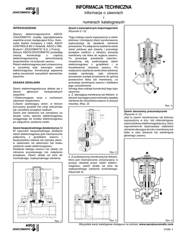 INFORMACJA TECHNICZNA informacja o zaworach i numerach katalogowych WPROWADZENIE Zawór z wewnętrznym wspomaganiem (Rysunki 2 i 3) Zawory elektromagnetyczne ASCO/ JOUCOMATIC zostały zaprojektowane wspólnie przez następujące firmy: Auto− matic Switch Company z USA, ASCO CONTROLS BV z Holandii, ASCO z Wlk. Brytanii i JOUCOMATIC S.A. z Francji. Zawory ASCO/JOUCOMATIC posiadają zwartą konstrukcję z częścią elektromagnetyczną zamontowaną bezpośrednio na korpusie zaworu. Rdzeń elektromagnesu jest umieszczony w szczelnej tulei wewnątrz cewki elektromagnesu. Konstrukcja zapewnia pełną szczelność wszystkich elementów zaworów. ZASADA DZIAŁANIA Zawór elektromagnetyczny składa się z dwóch głównych funkcjonalnych zespołów: 1.Elektromagnes wraz z ruchomym rdzeniem (trzpieniem). 2.Zawór zawierający otwór, w którym poruszany grzybek lub czop zatrzymuje lub umożliwia przepływ medium. Zawór jest otwierany lub zamykany na skutek ruchu rdzenia elektromagnesu wciąganego do środka elektromagnesu po załączeniu zasilania cewki. Zawór bezpośredniego działania (rys.1) W zaworach bezpośredniego działania rdzeń elektromagnesu jest mechanicznie połączony z grzybkiem zaworu i bezpośrednio otwiera lub zamyka otwór, w zależności od obecności lub braku zasilania cewki elektromagnesu. Działanie takiego zaworu nie zależy od ciśnienia procesowego lub natężenia przepływu. Zawór działa od zera do nominalnego, maksymalnego ciśnienia. Tego rodzaju zawór wyposażony w otwór pilotowy i (mniejszy) otwór wyrównawczy wykorzystuje do działania ciśnienie procesowe. Po załączeniu zasilania cewki otwór pilotowy jest otwarty i powoduje przepływ medium z obszaru powyżej membrany lub tłoka do wyjścia zaworu. To powoduje powstanie niezrów− noważonej siły podnoszącej rdzeń elektromagnesu z grzybkiem i w konsekwencji otwarcie zaworu. Po wyłączeniu zasilania cewki otwór pilotowy zostaje zamknięty, całe ciśnienie procesowe zostaje przyłożone do górnej powierzchni tłoka lub membrany, co powoduje zamknięcie zaworu i dokładne jego uszczelnienie. Istnieją dwa rodzaje konstrukcji tego typu zaworów: a. Z pływającą membraną lub tłokiem, w których wymagany jest minimalny spadek ciśnienia do utrzymania zaworu w pozycji otwartej. (Rys. 2) 1 2 Rys. 4 Zawór sterowany pneumatycznie (Rysunki 4 i 5) Jest to zawór membranowy lub tłokowy wyposażony w trój− lub czterodrogowy zawór pilotowy elektromagnetyczny, który naprzemiennie doprowadza oddzielne ciśnienie sterujące do lub z membrany lub tłoka w celu otwarcia lub zamknięcia głównego zaworu. Rys. 2 b. Z podwieszoną membraną lub tłokiem, który jest mechanicznie utrzymywany w pozycji otwartej przez rdzeń elektro− magnesu; zawór działa od zera do maksymalnego ciśnienia nominalnego. (Rysunek 3) ,,, ,,,,,,, ,,,,,, ,,, ,,,,,,, ,,,,,, ,,,,, ,,,,,,, ,,,,,, ,,,, ,,,, ,,,,, ,,,, ,,,, ,,,,, ,,,, ,,, ,,, ,,, ,,, ,,,,,, ,,, ,,,, ,,, ,,,,,, ,, ,,,, ,,,, ,,,, ,,, ,,,, ,,, ,,, ,,,, ,,, ,,,, ,,,, ,,,, 1 2 ,,,, ,,,, ,,, ,,,, ,,, ,,, ,,, ,,, ,,,,,, ,,,,,, ,,, ,,, ,,,,,, ,,, ,,,,,, ,, ,,, ,,,, ,, ,, ,,, ,,,, ,, ,,, ,,,, ,,,, ,, ,, ,,,, ,, ,, ,, ,, ,, ,,, ,,,,,, ,,, ,,,,,, Rys. 1 Rys. 3 Rys. 5 Wszystkie karty katalogowe dostępne na stronie: www.ascojoucomatic.com V105−1