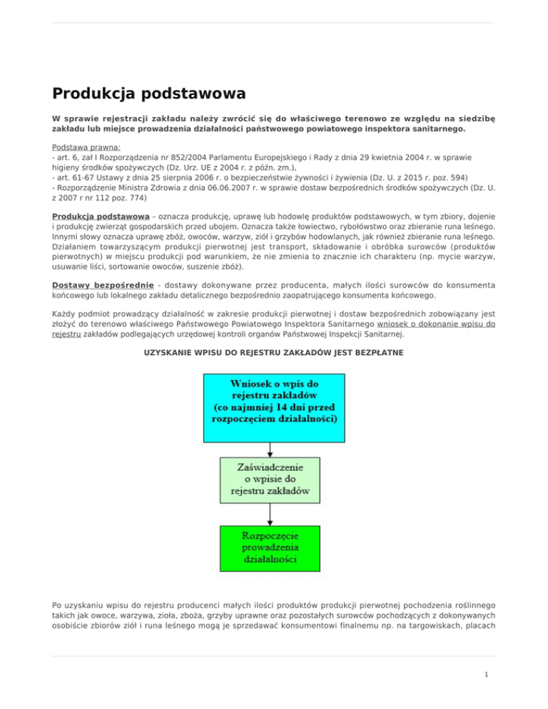 Produkcja podstawowa W sprawie rejestracji zakładu należy zwrócić się do właściwego terenowo ze względu na siedzibę zakładu lub miejsce prowadzenia działalności państwowego powiatowego inspektora sanitarnego. Podstawa prawna: - art. 6, zał I Rozporządzenia nr 852/2004 Parlamentu Europejskiego i Rady z dnia 29 kwietnia 2004 r. w sprawie higieny środków spożywczych (Dz. Urz. UE z 2004 r. z późn. zm.), - art. 61-67 Ustawy z dnia 25 sierpnia 2006 r. o bezpieczeństwie żywności i żywienia (Dz. U. z 2015 r. poz. 594) - Rozporządzenie Ministra Zdrowia z dnia 06.06.2007 r. w sprawie dostaw bezpośrednich środków spożywczych (Dz. U. z 2007 r nr 112 poz. 774) Produkcja podstawowa – oznacza produkcję, uprawę lub hodowlę produktów podstawowych, w tym zbiory, dojenie i produkcję zwierząt gospodarskich przed ubojem. Oznacza także łowiectwo, rybołówstwo oraz zbieranie runa leśnego. Innymi słowy oznacza uprawę zbóż, owoców, warzyw, ziół i grzybów hodowlanych, jak również zbieranie runa leśnego. Działaniem towarzyszącym produkcji pierwotnej jest transport, składowanie i obróbka surowców (produktów pierwotnych) w miejscu produkcji pod warunkiem, że nie zmienia to znacznie ich charakteru (np. mycie warzyw, usuwanie liści, sortowanie owoców, suszenie zbóż). Dostawy bezpośrednie - dostawy dokonywane przez producenta, małych ilości surowców do konsumenta końcowego lub lokalnego zakładu detalicznego bezpośrednio zaopatrującego konsumenta końcowego. Każdy podmiot prowadzący działalność w zakresie produkcji pierwotnej i dostaw bezpośrednich zobowiązany jest złożyć do terenowo właściwego Państwowego Powiatowego Inspektora Sanitarnego wniosek o dokonanie wpisu do rejestru zakładów podlegających urzędowej kontroli organów Państwowej Inspekcji Sanitarnej. UZYSKANIE WPISU DO REJESTRU ZAKŁADÓW JEST BEZPŁATNE Po uzyskaniu wpisu do rejestru producenci małych ilości produktów produkcji pierwotnej pochodzenia roślinnego takich jak owoce, warzywa, zioła, zboża, grzyby uprawne oraz pozostałych surowców pochodzących z dokonywanych osobiście zbiorów ziół i runa leśnego mogą je sprzedawać konsumentowi finalnemu np. na targowiskach, placach 1 targowych, w bramach własnych gospodarstw rolnych, jak również sklepom i zakładom gastronomicznym. Niedopełnienie ustawowego obowiązku zagrożone jest sankcją w postaci kary pieniężnej nakładanej w trybie postępowania administracyjnego przez Państwowego Wojewódzkiego Inspektora Sanitarnego (art. 103 ust 1 pkt 4 wyżej cytowanej ustawy) CZĘŚĆ A: OGÓLNE PRZEPISY HIGIENY DLA PRODUKCJI PODSTAWOWEJ I POWIĄZANYCH DZIAŁAŃ I ZAKRES 1. Niniejsze przepisy mają zastosowanie do produkcji podstawowej oraz następujących działań powiązanych: 2. a) transport, składowanie, przetwarzanie surowców w miejscu produkcji, pod warunkiem że nie zmienia to znacznie ich charakteru; 3. b) transport żywych zwierząt, gdzie jest to niezbędne do osiągnięcia celów niniejszego rozporządzenia; oraz 4. c) w przypadku produktów pochodzenia roślinnego, produktów rybołówstwa i zwierząt łownych, działania transportowe w celu dostawy surowców, których charakter nie został znacznie zmieniony, z miejsca produkcji do zakładu. 5. PRZEPISY HIGIENY 6. W jak najszerszym zakresie, przedsiębiorstwa sektora spożywczego zapewniają, że surowce są chronione przed zanieczyszczeniem, uwzględniając każde przetwarzanie, które te surowce będą kolejno przechodzić. 7. Nie naruszając ogólnego obowiązku ustanowionego w ust. 2, przedsiębiorstwa sektora spożywczego muszą przestrzegać właściwych wspólnotowych i krajowych przepisów prawnych odnoszących się do kontroli zagrożeń w produkcji podstawowej i powiązanych działań, w tym: 8. a) środków kontroli zanieczyszczeń z powietrza, ziemi, wody, paszy, nawozów, weterynaryjnych produktów leczniczych, środków ochrony roślin oraz biocydów oraz składowania, przetwarzania i unieszkodiliwania odpadów; oraz 9. b) środków odnoszących się do zdrowia zwierząt i ich dobrostanu oraz zdrowia roślin, które mają wpływ na zdrowie ludzkie, w tym programy nadzoru i kontroli czynników odzwierzęcych. 10. Przedsiębiorstwa sektora spożywczego hodujący, zbierający lub polujący na zwierzęta albo produkujący produkty pochodzenia zwierzęcego podejmują odpowiednie działania, według potrzeb: 11. a) w celu utrzymania obiektów używanych w powiązaniu z produkcją podstawową i działaniami powiązanymi, w tym obiektów używanych do składowania i przetwarzania pasz, w czystości oraz, w miarę potrzeby po wyczyszczeniu, dezynfekowania ich we właściwy sposób; 12. b) w celu utrzymania czystości oraz, w miarę potrzeby po wyczyszczeniu, dezynfekowania we właściwy sposób, wyposażenia, pojemników, skrzyń, pojazdów oraz statków; 13. c) w zakresie w jakim to możliwe w celu zapewnienia czystości zwierząt przeznaczonych do uboju oraz, w miarę potrzeby, zwierząt produkcyjnych; 14. d) w celu używania wody pitnej, lub czystej wody, w każdym przypadku gdy jest to niezbędne do zapobieżenia zanieczyszczeniu; 15. e) w celu zapewnienia, że personel przetwarzający środki spożywcze jest dobrego zdrowia i przechodzi szkolenie na temat ryzyka zdrowotnego; 16. f) w zakresie w jakim to możliwe w celu zapobieżenia, aby zwierzęta lub szkodniki spowodowały zanieczyszczenie; 17. g) w celu składowania i przetwarzania odpadów i substancji niebezpiecznych w taki sposób, aby zapobiegać zanieczyszczeniu; 18. h) w celu zapobieżenia zapoczątkowaniu i rozszerzeniu chorób zakaźnych mogących przenieść się na ludzie za pośrednictwem żywności, w tym poprzez podejmowanie środków ostrożności przy przyjmowaniu nowych zwierząt i zgłaszanie podejrzenia wybuchu takich epidemii właściwym organom; 19. i) w celu uwzględnienia wyników wszelkich właściwych analiz przeprowadzonych na próbkach pobranych od zwierz