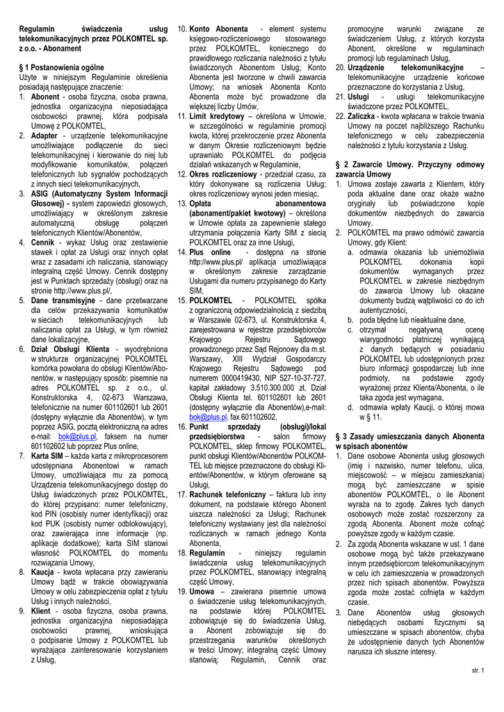 Regulamin świadczenia usług telekomunikacyjnych przez POLKOMTEL sp. z o.o. - Abonament § 1 Postanowienia ogólne Użyte w niniejszym Regulaminie określenia posiadają następujące znaczenie: 1. Abonent - osoba fizyczna, osoba prawna, jednostka organizacyjna nieposiadająca osobowości prawnej, która podpisała Umowę z POLKOMTEL, 2. Adapter - urządzenie telekomunikacyjne umożliwiające podłączenie do sieci telekomunikacyjnej i kierowanie do niej lub modyfikowanie komunikatów, połączeń telefonicznych lub sygnałów pochodzących z innych sieci telekomunikacyjnych, 3. ASIG (Automatyczny System Informacji Głosowej) - system zapowiedzi głosowych, umożliwiający w określonym zakresie automatyczną obsługę połączeń telefonicznych Klientów/Abonentów, 4. Cennik - wykaz Usług oraz zestawienie stawek i opłat za Usługi oraz innych opłat wraz z zasadami ich naliczania, stanowiący integralną część Umowy. Cennik dostępny jest w Punktach sprzedaży (obsługi) oraz na stronie http://www.plus.pl/, 5. Dane transmisyjne - dane przetwarzane dla celów przekazywania komunikatów w sieciach telekomunikacyjnych lub naliczania opłat za Usługi, w tym również dane lokalizacyjne, 6. Dział Obsługi Klienta - wyodrębniona w strukturze organizacyjnej POLKOMTEL komórka powołana do obsługi Klientów/Abonentów, w następujący sposób: pisemnie na adres POLKOMTEL sp. z o.o., ul. Konstruktorska 4, 02-673 Warszawa, telefonicznie na numer 601102601 lub 2601 (dostępny wyłącznie dla Abonentów), w tym poprzez ASIG, pocztą elektroniczną na adres e-mail: [email protected], faksem na numer 601102602 lub poprzez Plus online, 7. Karta SIM – każda karta z mikroprocesorem udostępniana Abonentowi w ramach Umowy, umożliwiająca mu za pomocą Urządzenia telekomunikacyjnego dostęp do Usług świadczonych przez POLKOMTEL, do której przypisano: numer telefoniczny, kod PIN (osobisty numer identyfikacji) oraz kod PUK (osobisty numer odblokowujący), oraz zawierająca inne informacje (np. aplikacje dodatkowe); karta SIM stanowi własność POLKOMTEL do momentu rozwiązania Umowy, 8. Kaucja - kwota wpłacana przy zawieraniu Umowy bądź w trakcie obowiązywania Umowy w celu zabezpieczenia opłat z tytułu Usług i innych należności, 9. Klient - osoba fizyczna, osoba prawna, jednostka organizacyjna nieposiadająca osobowości prawnej, wnioskująca o podpisanie Umowy z POLKOMTEL lub wyrażająca zainteresowanie korzystaniem z Usług, 10. Konto Abonenta - element systemu księgowo-rozliczeniowego stosowanego przez POLKOMTEL, koniecznego do prawidłowego rozliczania należności z tytułu świadczonych Abonentom Usług; Konto Abonenta jest tworzone w chwili zawarcia Umowy; na wniosek Abonenta Konto Abonenta może być prowadzone dla większej liczby Umów, 11. Limit kredytowy – określona w Umowie, w szczególności w regulaminie promocji kwota, której przekroczenie przez Abonenta w danym Okresie rozliczeniowym będzie uprawniało POLKOMTEL do podjęcia działań wskazanych w Regulaminie, 12. Okres rozliczeniowy - przedział czasu, za który dokonywane są rozliczenia Usług; okres rozliczeniowy wynosi jeden miesiąc, 13. Opłata abonamentowa (abonament/pakiet kwotowy) – określona w Umowie opłata za zapewnienie stałego utrzymania połączenia Karty SIM z siecią POLKOMTEL oraz za inne Usługi, 14. Plus online - dostępna na stronie http://www.plus.pl/ aplikacja umożliwiająca w określonym zakresie zarządzanie Usługami dla numeru przypisanego do Karty SIM, 15. POLKOMTEL - POLKOMTEL spółka z ograniczoną odpowiedzialnością z siedzibą w Warszawie 02-673, ul. Konstruktorska 4, zarejestrowana w rejestrze przedsiębiorców Krajowego Rejestru Sądowego prowadzonego przez Sąd Rejonowy dla m.st. Warszawy, XIII Wydział Gospodarczy Krajowego Rejestru Sądowego pod numerem 0000419430, NIP 527-10-37-727, kapitał zakładowy 3.510.300.000 zł, Dział Obsługi Klienta tel. 601102601 lub 2601 (dostępny wyłącznie dla Abonentów),e-mail: [email protected], fax 601102602, 16. Punkt sprzedaży (obsługi)/lokal przedsiębiorstwa salon firmowy POLKOMTEL, sklep firmowy POLKOMTEL, punkt obsługi Klientów/Abonentów POLKOMTEL lub miejsce przeznaczone do obsługi Klientów/Abonentów, w którym oferowane są Usługi, 17. Rachunek telefoniczny – faktura lub inny dokument, na podstawie którego Abonent uiszcza należności za Usługi; Rachunek telefoniczny wystawiany jest dla należności rozliczanych w ramach jednego Konta Abonenta, 18. Regulamin niniejszy regulamin świadczenia usług telekomunikacyjnych przez POLKOMTEL, stanowiący integralną część Umowy, 19. Umowa – zawierana pisemnie umowa o świadczenie usług telekomunikacyjnych, na podstawie której POLKOMTEL zobowiązuje się do świadczenia Usług, a Abonent zobowiązuje się do przestrzegania warunków określonych w treści Umowy; integralną część Umowy stanowią: Regulamin, Cennik oraz promocyjne warunki związane ze świadczeniem Usług, z których korzysta Abonent, określone w regulaminach promocji lub regulaminach Usług, 20. Urządzenie telekomunikacyjne – telekomunikacyjne urządzenie końcowe przeznaczone do korzystania z Usług, 21. Usługi usługi telekomunikacyjne świadczone przez POLKOMTEL, 22. Zaliczka - kwota wpłacana w trakcie trwania Umowy na poczet najbliższego Rachunku telefonicznego w celu zabezpieczenia należności z tytułu korzystania z Usług. § 2 Zawarcie Umowy. Przyczyny odmowy zawarcia Umowy 1. Umowa zostaje zawarta z Klientem, który poda aktualne dane oraz okaże ważne oryginały lub poświadczone kopie dokumentów niezbędnych do zawarcia Umowy. 2. POLKOMTEL ma prawo odmówić zawarcia Umowy, gdy Klient: a. odmawia okazania lub uniemożliwia POLKOMTEL dokonania kopii dokumentów wymaganych przez POLKOMTEL w zakresie niezbędnym do zawarcia Umowy lub okazane dokumenty budzą wątpliwości co do ich autentyczności, b. poda błędne lub nieaktualne dane, c. otrzymał negatywną ocen