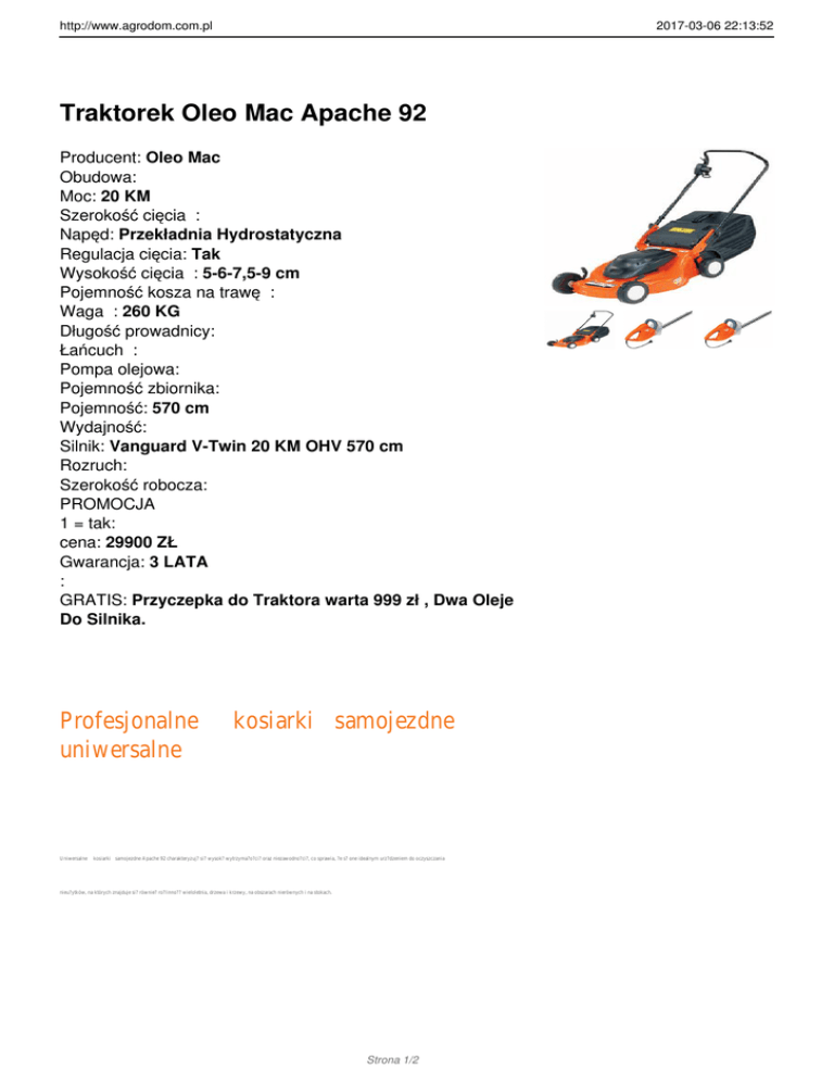 http://www.agrodom.com.pl 2017-03-06 22:13:52 Traktorek Oleo Mac Apache 92 Producent: Oleo Mac Obudowa: Moc: 20 KM Szerokość cięcia : Napęd: Przekładnia Hydrostatyczna Regulacja cięcia: Tak Wysokość cięcia : 5-6-7,5-9 cm Pojemność kosza na trawę : Waga : 260 KG Długość prowadnicy: Łańcuch : Pompa olejowa: Pojemność zbiornika: Pojemność: 570 cm Wydajność: Silnik: Vanguard V-Twin 20 KM OHV 570 cm Rozruch: Szerokość robocza: PROMOCJA 1 = tak: cena: 29900 ZŁ Gwarancja: 3 LATA : GRATIS: Przyczepka do Traktora warta 999 zł , Dwa Oleje Do Silnika. Profesjonalne uniwersalne Uniwersalne kosiarki samojezdne kosiarki samojezdne Apache 92 charakteryzuj? si? wysok? wytrzyma?o?ci? oraz niezawodno?ci?, co sprawia, ?e s? one idealnym urz?dzeniem do oczyszczania nieu?ytków, na których znajduje si? równie? ro?linno?? wieloletnia, drzewa i krzewy, na obszarach nierównych i na stokach. Strona 1/2 http://www.agrodom.com.pl 2017-03-06 22:13:52 Wyposa?one s? one w mocne narz?dzia tn?ce o jednym ostrzu z ruchomymi ko?cówkami. Szerokie bie?niki oraz niski ?rodek ci??ko?ci pozwalaj? na zachowanie maksymalnej stabilno?ci maszyny równie? na nierównym terenie oraz na brzegach i w pobli?u rowów. Wyposa?one w liczne narz?dzia u?atwiaj?ce prac? operatora, np. sprz?g?o elektromagnetyczne, hydrostatyczn? przek?adni?, mechanizm ró?nicowy z mo?liwo?ci? blokady, który pozwala na prac? w prawie ka?dych warunkach terenowych oraz w centraln? regulacj? wysoko?ci ci?cia.. Maksymalne zabezpieczenie operatora dzi?ki pa??kowi zabezpieczaj?cemu, zabezpieczeniom bocznym oraz pasom bezpiecze?stwa. Dost?pne równie? modele z nap?dem zintegrowanym 4x4: idealne do wyj?tkowo nierównych terenów lub terenów o du?ym nachyleniu. Pojemno?? silnika Silnik marka/model B&S Vanguard Szeroko?? koszenia 92 cm Nap?d hydrostatyczny Promie? skr?tu 145 cm Wysoko?? ci?cia 50 - 60 - 75 - 90 mm Wymiary 219x96x108,5 cm Ci??ar 260 Kg Strona 2/2