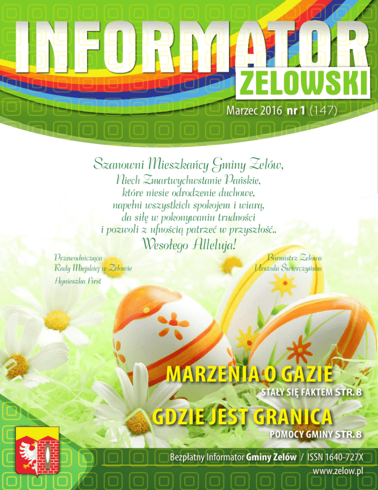 Marzec 2016 nr 1 (147) Szanowni Mieszkańcy Gminy Zelów, Niech Zmartwychwstanie Pańskie, które niesie odrodzenie duchowe, napełni wszystkich spokojem i wiarą, da siłę w pokonywaniu trudności i pozwoli z ufnością patrzeć w przyszłość.. Wesołego Alleluja! Przewodnicząca Rady Miejskiej w Zelowie Burmistrz Zelowa Urszula Świerczyńska Agnieszka First marzenia o gazie stały się faktem str. 8 gdzie jest granica pomocy gminy str. 8 Bezpłatny Informator Gminy Zelów / ISSN 1640-727X www.zelow.pl WYDARZENIA Zachęcamy do głosowania na Agnieszkę First AGNIESZKA FIRST – Przewodnicząca Rady Miejskiej w Zelowie bierze udział w Plebiscycie KOBIETA PRZEDSIĘBIORCZA WOJEWÓDZTWA LÓDZKIEGO 2015 w kategorii działalność społeczno-kulturalno-naukowa. Poza pracą zawodową na stanowisku wiceprezesa Łódzkiej Agencji Rozwoju Regionalnego w Łodzi, aktywnie działa na rzecz rozwoju i promocji Gminy Zelów. Jest także członkiem Zarządu OSP w Bujnach Szlachec- Nowe USG w SPZOZ w Zelowie Pacjenci Samodzielnego Publicznego Zakładu Opieki Zdro- wotnej w Zelowie mogą korzystać z nowego aparatu do badań ultrasonograficznych. Jest to wysokiej jakości urządzenie, które pozwoli na wykonywanie badań w zakresie: jamy brzusznej, tarczycy, węzłów chłonnych, ciąży, badania ginekologicznego, stawów biodrowych u dzieci i noworodków, naczyń krwionośnych, piersi. Badania są wykonywane przez doświadczonych lekarzy posiadających specjalizację z radiodiagnostyki oraz certyfikat do wykonywania badań USG. Powyższe badania dostępne są bezpłatnie dla pacjentów zdeklarowanych do SPZOZ w Zelowie w ramach zawartych umów z NFZ na podstawie skierowania od lekarza ubezpieczenia zdrowotnego oraz dla pozostałych pacjentów za odpłatnością. Koszt zakupu nowego USG wyniósł 99 000 zł, z czego 70 000 zł przekazano z budżetu Gminy Zelów. kich i inicjatorką wielu wydarzeń o charakterze kulturalnym, rozrywkowym i sportowym w sołectwie Bujny Szlacheckie. Jeżeli uważasz, że to Agnieszka First powinna znaleźć się w gronie zwycięzców plebiscytu, to nie zwlekaj i zagłosuj na jej kandydaturę! Głosować można trzema metodami: za pomocą strony www. dzienniklodzki.pl, za pomocą aplikacji Facebook oraz za pomocą SMS Premium na nr 72355 w treści wpisując KK.12. http://w w w.dziennik lodzki.pl/plebiscyt/karta/agnieszka-first,33041,1533883,t,id,kid. html Głosowanie potrwa do 31 marca. Organizatorami plebiscytu są redakcje: „Dziennika Łódzkiego”, „Expressu Ilustrowanego” „Naszego miasta”. Z okazji 80 urodzin Janina Młynarczyk mieszkanka Pawłowej obchodziła 11 marca swoje 80 urodziny. Z okazji tak zacnego jubileuszu, życzenia Jubilatce złożyły: Burmistrz Urszula Świerczyńska, radna Rady Miejskiej w Zelowie Barbara Walczak i sołtys Pawłowej Emilia Bednarek. Jubilatka nie kryła zaskoczenia i wzruszenia. Życzymy Pani Janinie jeszcze raz dużo zdrowia, wszelkiej pomyślności, samych radosnych dni i kolejnych wspaniałych lat! Bezpłatne owoce i warzywa dla Mieszkańców Gminy Zelów 10 ton jabłek i 12 ton marchwi wydano w lutym bezpłatnie Mieszkańcom Gminy Zelów korzystającym ze świadczeń Miej- sko-Gminnego Ośrodka Pomocy Społecznej. Warzywa i owoce pozyskano od Agencji Rynku Rolnego. W akcję wydawania żywności włączyli się uczniowie ze Szkolnego Klubu Wolontariatu działającego przy Zespole Szkół Ogólnokształcących w Ze- lowie. Jak zapowiada kierownik MGOPS Janina Kędziak, kolejne podobne dostawy żywności są przed nami. Telefon alarmowy 112 Pogotowie Ratunkowe 999 Straż Pożarna 998 Policja 997 Pogotowie Gazowe 992 Pogotowie Energetyczne 991 Pomoc Drogowa 981 Biuro numerów 118-913 • Urząd Miejski w Zelowie • Zakład Usług Komunalnych • Przychodnia SPZOZ w Zelowie 2 WYDARZENIA 44 634 10 00 • Powiatowy Urząd Pracy Filia w Zelowie 44 634 10 66 • Miejsko-Gminny Ośrodek Pomocy Społecznej w Zelowie 44 634 10 28 • Przedsiębiorstwo Wodociągów i Kanalizacji w Zelowie 44 634 13 06 44 634-22-58 • Dom Kultury w Zelowie 44 634 10 98 • Biblioteka Publiczna Miasta i Gminy w Zelowie 44 634 11 48 • Szpital Wojewódzki w Bełchatowie Pogotowie Ratunkowe 44 635 84 80 44 634 12 65 • NZOZ „MEDYK” 44 634 12 18 • Wiejski Ośrodek Zdrowia w Wygiełzowie 44 634 14 22 • OSP w Zelowie 44 634 29 98 • OSP w Łobudzicach 44 634 15 88 • Fundacja Rozwoju Gminy Zelów 44 634 10 06 i 44 634 10 14 tel. 44 635-15-35 / fax. 44 634-13-41 Koncerty z Domem Kultury Ponad pięćset osób przybyło do Domu Kultury na tegoroczny Koncert Noworoczny... A kto nie był, niech żałuje, bo było to wydarzenie wyjątkowe. Dla mieszkańców naszej gminy wystąpili miejscowi artyści i jak się okazało, pomysł koncertu ph. „Zelowianie dla zelowian i przyjaciół” okazał się przysłowiowym „strzałem w dziesiątkę”. W koncercie wystąpili: Agniesz- ne głosy spowodowały, że na sali Zarząd Fundacji Rozwoju Gminy rów Maryli Rodowicz, Krzysztofa ka Dobroszek, Izabella Kaliska, Kin- wytworzyła się wspaniała atmos- Zelów i pracownicy Domu Kultu- Krawczyka i zespołu Golec Orkiega Kubik, Weronika Wodzińska, fera. Na koniec koncertu wszyscy ry w Zelowie. stra; światowe przeboje Glena MilJulia Urbaniak, zespół LAUDATE wykonawcy zaśpiewali tradycyjOrkiestra Dęta OSP w Zelowie lera, Erica Claptona, Franka Sinatry DOMINUM, schola dziecięca PRO- ne kolędy. Czar dźwięków i ener- przyzwyczaiła nas do koncertów czy Boney M. Licznie zgromadzoWADŹ NAS, schola ANIMA MEA, gia płynąca z tegorocznego kolę- na wysokim poziomie. Taki też był na publiczność gorąco oklaskiwachór parafialny parafii M.B. Często- dowania udzieliła się wszystkim ostatni koncert orkiestry, który wy- ła artystów, a na koniec uczestnicy chowskiej w Zelowie oraz Andrzej widzom, a wyrazów wdzięczności brzmiał w niedzielne popołudnie wspólnie zaśpiewali 100 lat obecDębkowski i kierownik artystyczny i uznania nie szczędziła a
