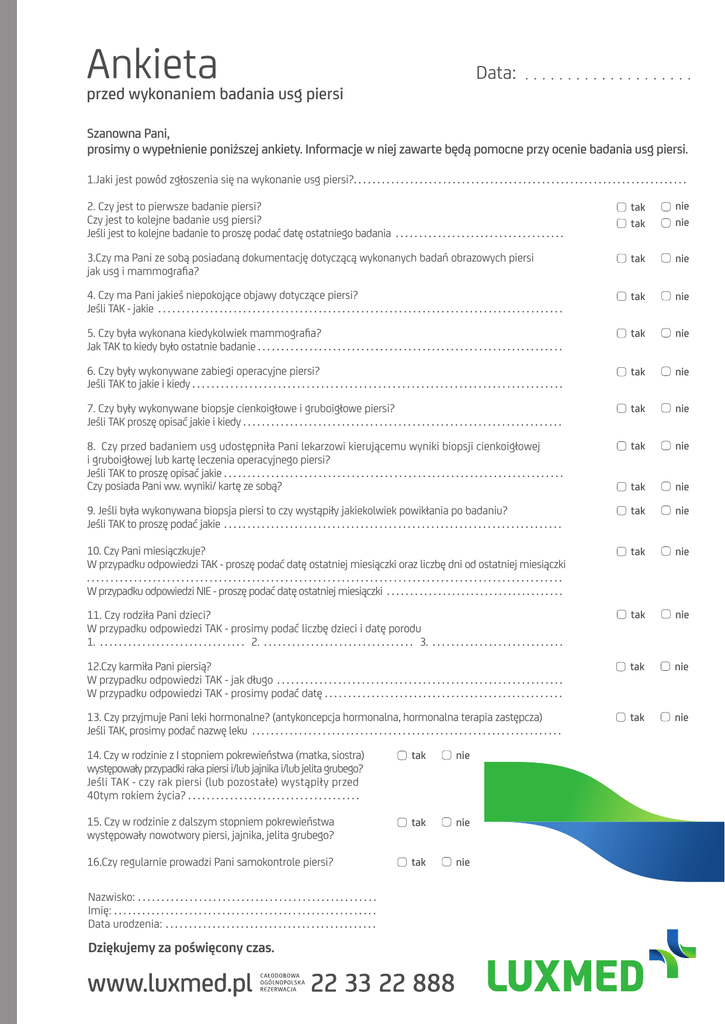 Ankieta Data: przed wykonaniem badania usg piersi Szanowna Pani, prosimy o wypełnienie poniższej ankiety. Informacje w niej zawarte będą pomocne przy ocenie badania usg piersi. 1.Jaki jest powód zgłoszenia się na wykonanie usg piersi?. . . . . . . . . . . . . . . . . . . . . . . . . . . . . . . . . . . . . . . . . . . . . . . . . . . . . . . . . . . . . . . . . . . . . . . 2. Czy jest to pierwsze badanie piersi? Czy jest to kolejne badanie usg piersi? Jeśli jest to kolejne badanie to proszę podać datę ostatniego badania . . . . . . . . . . . . . . . . . . . . . . . . . . . . . . . . . . . . tak tak nie nie 3.Czy ma Pani ze sobą posiadaną dokumentację dotyczącą wykonanych badań obrazowych piersi jak usg i mammografia? tak nie 4. Czy ma Pani jakieś niepokojące objawy dotyczące piersi? Jeśli TAK - jakie . . . . . . . . . . . . . . . . . . . . . . . . . . . . . . . . . . . . . . . . . . . . . . . . . . . . . . . . . . . . . . . . . . . . . . . . . . . . . . . . . . . . . . tak nie 5. Czy była wykonana kiedykolwiek mammografia? Jak TAK to kiedy było ostatnie badanie . . . . . . . . . . . . . . . . . . . . . . . . . . . . . . . . . . . . . . . . . . . . . . . . . . . . . . . . . . . . . . . . . tak nie 6. Czy były wykonywane zabiegi operacyjne piersi? Jeśli TAK to jakie i kiedy . . . . . . . . . . . . . . . . . . . . . . . . . . . . . . . . . . . . . . . . . . . . . . . . . . . . . . . . . . . . . . . . . . . . . . . . . . . . . . tak nie 7. Czy były wykonywane biopsje cienkoigłowe i gruboigłowe piersi? Jeśli TAK proszę opisać jakie i kiedy . . . . . . . . . . . . . . . . . . . . . . . . . . . . . . . . . . . . . . . . . . . . . . . . . . . . . . . . . . . . . . . . . . . . tak nie 8. Czy przed badaniem usg udostępniła Pani lekarzowi kierującemu wyniki biopsji cienkoigłowej i gruboigłowej lub kartę leczenia operacyjnego piersi? Jeśli TAK to proszę opisać jakie . . . . . . . . . . . . . . . . . . . . . . . . . . . . . . . . . . . . . . . . . . . . . . . . . . . . . . . . . . . . . . . . . . . . . . . . Czy posiada Pani ww. wyniki/ kartę ze sobą? tak nie tak nie 9. Jeśli była wykonywana biopsja piersi to czy wystąpiły jakiekolwiek powikłania po badaniu? Jeśli TAK to proszę podać jakie . . . . . . . . . . . . . . . . . . . . . . . . . . . . . . . . . . . . . . . . . . . . . . . . . . . . . . . . . . . . . . . . . . . . . . . . tak nie 10. Czy Pani miesiączkuje? W przypadku odpowiedzi TAK - proszę podać datę ostatniej miesiączki oraz liczbę dni od ostatniej miesiączki ..................................................................................................... W przypadku odpowiedzi NIE - proszę podać datę ostatniej miesiączki . . . . . . . . . . . . . . . . . . . . . . . . . . . . . . . . . . . . . . tak nie 11. Czy rodziła Pani dzieci? W przypadku odpowiedzi TAK - prosimy podać liczbę dzieci i datę porodu 1. . . . . . . . . . . . . . . . . . . . . . . . . . . . . . . . 2. . . . . . . . . . . . . . . . . . . . . . . . . . . . . . . . . 3. . . . . . . . . . . . . . . . . . . . . . . . . . . . . tak nie 12.Czy karmiła Pani piersią? W przypadku odpowiedzi TAK - jak długo . . . . . . . . . . . . . . . . . . . . . . . . . . . . . . . . . . . . . . . . . . . . . . . . . . . . . . . . . . . . . W przypadku odpowiedzi TAK - prosimy podać datę . . . . . . . . . . . . . . . . . . . . . . . . . . . . . . . . . . . . . . . . . . . . . . . . . . . tak nie 13. Czy przyjmuje Pani leki hormonalne? (antykoncepcja hormonalna, hormonalna terapia zastępcza) Jeśli TAK, prosimy podać nazwę leku . . . . . . . . . . . . . . . . . . . . . . . . . . . . . . . . . . . . . . . . . . . . . . . . . . . . . . . . . . . . . . . . . . tak nie 14. Czy w rodzinie z I stopniem pokrewieństwa (matka, siostra) występowały przypadki raka piersi i/lub jajnika i/lub jelita grubego? Jeśli TAK - czy rak piersi (lub pozostałe) wystąpiły przed 40tym rokiem życia? . . . . . . . . . . . . . . . . . . . . . . . . . . . . . . . . . . . . . tak nie 15. Czy w rodzinie z dalszym stopniem pokrewieństwa występowały nowotwory piersi, jajnika, jelita grubego? tak nie 16.Czy regularnie prowadzi Pani samokontrole piersi? tak nie Nazwisko: . . . . . . . . . . . . . . . . . . . . . . . . . . . . . . . . . . . . . . . . . . . . . . . . . . . Imię: . . . . . . . . . . . . . . . . . . . . . . . . . . . . . . . . . . . . . . . . . . . . . . . . . . . . . . . . Data urodzenia: . . . . . . . . . . . . . . . . . . . . . . . . . . . . . . . . . . . . . . . . . . . . . Dziękujemy za poświęcony czas.