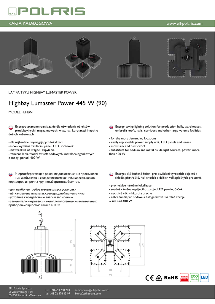 KARTA KATALOGOWA www.efl-polaris.com LAMPA TYPU HIGHBAY LUMASTER POWER Highbay Lumaster Power 445 W (90) MODEL PEHBN Energooszczędne rozwiązanie dla oświetlania obiektów produkcyjnych i magazynowych, wiat, hal, korytarzyi innych o dużych kubaturach. Energy-saving lighting solution for production halls, warehouses, umbrella roofs, halls, corridors and other large-volume facilities. - for the most demanding locations - easily replaceable power supply unit, LED panels and lenses - moisture- and dust-proof - substitute for sodium and metal halide light sources, power: more Athan 400 W - dla najbardziej wymagających lokalizacji - łatwa wymiana zasilacza, paneli LED, soczewek - niewrażliwa na wilgoć i zapylenie - zamiennik dla źródeł światła sodowychi metalohalogenkowych o mocy ponad 400 W Energetický šetřené řešení pro osvětleni výrobních objektů a skladů, přístřešků, hal, chodeb a dalších velkoplošných prostorů. 275 Энергосберегающее решение для освещения промышленных и объектов и складских помещений, навесов, цехов, коридоров и прочих крупногабаритныхобъектов. 652 - pro nejvíce náročné lokalizace - snadná výměna napájecího zdroje, LED panelu, čoček - necitlivé vůči vlhkosti a prachu - náhradní díl pro sodové a halogenidové světelné zdroje o sile nad 400 W 150 - для наиболее требовательных мест установки - лёгкая замена питателя, светодиодной панели, линз - устойчив к воздействию влаги и запылению - заменитель натриевых и металлогалогенных осветительных приборов мощностью свыше 400 Вт A A 150 120 652 652 280 280 472 472 275 275 PRZEKRÓJ A-A 472 472 A PRZEKRÓJ A-A [email protected] [email protected] 0 2 tel. +48 663 788 203 tel. _48 22 574 43 99 Arkusz 1 rysunek 407.003-03 PO skala 280 280 EFL Polaris Sp. z o.o. ul. Żeromskiego 12A 05-250 Słupno k. Warszawy nazwa arkusza konstr. sprawdził Made in Poland ECO zatw. friendly 1:8 materiał . LED ul. Żeromskiego 12A, 05-250 S KARTA KATALOGOWA www.efl-polaris.com dane techniczne: / technical data: / технические условия: / specifikace: Specyfikacja Lampa Highbay Lumaster Power 445 W (90°) PEHBN - 44590 zimna 5500-6000 K ≥ 80 176-264 V AC 1686mA-2528mA AC 50/60 Hz > 0,95 < 0,5 s 42 000 lm 445 W 94,38 lm/W A 90° > 50 000 h -20°C do 50°C -30°C do 70°C 65 Tereny zewnętrzne Tak 652 x 472 x 472 Materiały Cree, XT-E 192 Aluminium/PMMA czarna Masa 19,09 kg 21,13 kg Produkt Kod Barwa światła Temperatura barwowa Wskaźnik oddawania barw Zasilanie Natężenie prądu Częstotliwość Współczynnik mocy Czas zapłonu Strumień świetlny Moc Efektywność Klasa energetyczna Kąt świecenia Żywotność Temperatura pracy Temperatura przechowywania Wskaźnik IP Zalecane miejsce zastosowania RoHS Wymiary LED Ilość LED Materiał Kolor obudowy Masa bez opakowania Masa z opakowaniem Obiekt Instalacja Numer projektu Data : : : : 06.12.2013 1 Dane oprawy 1.1 EFL POLARIS, PEHBC-120-Z () 1.1.1 Krzywa światł. LDC rozkład światła / light distribution / распределение света / distribuce světla 150° 180° 150° 120° 120° 90° 90° 200 400 60° 60° 0° 5° 10° 15° 20° 25° 30° 35° 40° 45° 50° 55° 60° 65° 70° 75° 80° 85° 90° C0 C90 C180 756 756 756 752 753 752 743 744 743 728 729 728 708 707 708 680 678 680 641 639 641 580 575 580 297 296 297 51 48 51 14 14 14 9 8 9 6 6 6 1 1 1 0 0 0 0 0 0 0 0 0 0 0 0 1 1 1 cd / 1000 lm 600 30° 0° C0 / C180 30° C90 / C270 cd / 1000 lm Producent Kod zamów. Nazwa oprawy Wyposażenie Wymiary Nazwa pliku : EFL POLARIS Sprawność : 100.01% : Skuteczność świetlna : 87.74 lm/W (A60) : PEHBC-120-Z Rozsył oświetlenia : sym. do C0-C180 / C90-C270 : 1 x 0 / 9650 lm Kąt wiązki św. : 77.7° C0-C180 : D 400 mm x H 390 mm 77.7° C90-C270 : Lampa_Przemyslowa_Lumaster_Basic_PEHBC-120-Z_EFL-Polaris.ldt EFL Polaris Sp. z o.o. ul. Żeromskiego 12A 05-250 Słupno k. Warszawy Relux4 tel. +48 663 788 203 tel. _48 22 574 43 99 -please put your own address here- [email protected] [email protected] Strona 1/3 Made in Poland ECO friendly LED