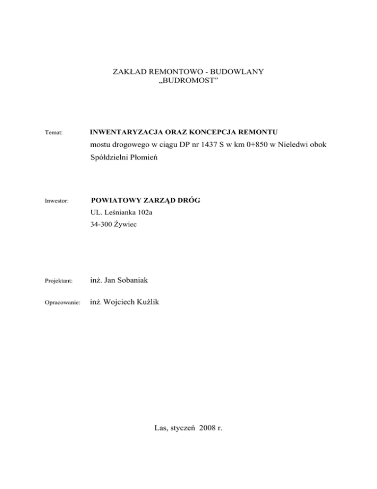 ZAKŁAD REMONTOWO - BUDOWLANY „BUDROMOST” Temat: INWENTARYZACJA ORAZ KONCEPCJA REMONTU mostu drogowego w ciągu DP nr 1437 S w km 0+850 w Nieledwi obok Spółdzielni Płomień Inwestor: POWIATOWY ZARZĄD DRÓG UL. Leśnianka 102a 34-300 Żywiec Projektant: inż. Jan Sobaniak Opracowanie: inż. Wojciech Kuźlik Las, styczeń 2008 r. INWENTARYZACJA ORAZ KONCEPCJA REMONTU mostu drogowego w ciągu DP nr 1437 S w km 0+850 w Nieledwi ZAWARTOŚĆ OPRACOWANIA I. CZĘŚĆ OPISOWA 1. Podstawy opracowania 1.1 Podstawy formalne 1.2 Podstawy prawne 2. Cel i zakres opracowania 3. Opis techniczny istniejącego obiektu mostowego 3.1. Dane ogólne 3.2. Konstrukcja nośna 3.3. Podpory 3.4. Pomost 4. Inwentaryzacja uszkodzeń i ocena stanu technicznego 4.1 Balustrady 4.2 Pomost drewniany 4.3 Konstrukcja nośna 4.4 Podpory 5. Wnioski 6. Koncepcja remontu 7. Zalecenia, technologia i kolejność robót 8. Zastosowane materiały konstrukcyjne II. CZĘŚĆ RYSUNKOWA A. Inwentaryzacja 1. Widok z góry 2. Ruszt stalowy 3. Przekrój A-A, B-B B. Koncepcja remontu 4. Widok z góry 5. Przekrój A-A 6. Przekrój B-B 7. Zbrojenie płyty ustroju nośnego: przekrój A-A, B-B ZR-B “BUDROMOST” - LAS 2 INWENTARYZACJA ORAZ KONCEPCJA REMONTU mostu drogowego w ciągu DP nr 1437 S w km 0+850 w Nieledwi I. CZĘŚĆ OPISOWA 1. Podstawy opracowania 1.1. Podstawy formalne Niniejsze opracowanie zostało sporządzone zgodnie ze zleceniem PZD/9/5543/3670/07 Powiatowego Zarządu Dróg w Żywcu ul. Leśnianka 102a, dla Zakładu Remontowo – Budowlanego „Budromost” Las 225. 1.2 Podstawy techniczne [1] Wizja lokalna na obiekcie z dnia 16 styczeń, oraz pomiary inwentaryzacyjne [2] PN-85/S-10030 Obiekty mostowe. Obciążenia. [3] PN-91/S-10042 Obiekty mostowe. Konstrukcje betonowe, żelbetowe i sprężone. Projektowanie. [4] PN-82/S-10052 Obiekty mostowe. Konstrukcje stalowe. Projektowanie. [5] Literatura techniczna 2. Cel i zakres opracowania Przedmiotowe opracowanie zostało sporządzone w celu określenia sposobu oraz zakresu remontu uszkodzonego mostu usytuowanego w ciągu drogi powiatowej nr 1437 S w km 0+850 w Nieledwi obok Spółdzielni Płomień. Zgodnie z zawartą umową niniejsza praca obejmuje: ZR-B “BUDROMOST” - LAS - inwentaryzację geometryczną, - inwentaryzację uszkodzeń, - ocenę stanu technicznego, - koncepcję remontu, - wnioski i zalecenia. 3 INWENTARYZACJA ORAZ KONCEPCJA REMONTU mostu drogowego w ciągu DP nr 1437 S w km 0+850 w Nieledwi 3. Opis techniczny istniejącego obiektu mostowego: 3.1. Dane ogólne: Przedmiotowy most usytuowany jest w ciągu drogi powiatowej nr 1437 S w km 0+850 w Nieledwi obok Spółdzielni Płomień. Jest to obiekt jednoprzęsłowy usytuowany pod kątem 60º do koryta potoku. Podstawowe dane geometryczne: - liczba przęseł 1 przęsło swobodnie podparte, 3.2. - rozpiętość teoretyczna 8,40m - długość całkowita 14,20m - szerokość użytkowa 5,85m - szerokość całkowita 7,85m - liczba belek głównych 5 - rozstaw belek głównych 1,30m - posadowienie podpór bezpośrednie Konstrukcja nośna: Konstrukcję nośną mostu stanowią dźwigary stalowe: IP 400( szt. 1) i IP 330 (szt. 4) ustawione na podporach betonowych. Rozstaw osiowy belek wynosi ok. 1,30m. Na długości mostu belki zostały usztywnione stężeniami poprzecznymi w obrębie podpór wykonanymi z kątowników L 150 (tylko miedzy pierwszą a drugą belką). 3.3. Podpory: Podpory skrajne stanowią przyczółki betonowe posadowione na płask. 3.4. Pomost: Na dźwigarach nośnych ułożono pomost drewniany, który składa się z: - belki 24x24 cm - podkład 10x25 cm - dylina 10 cm Poprzecznice są ułożone na belkach głównych „na styk”. Słupki balustrady zostały zamocowane na wysuniętych elementach dyliny. Po obydwu stronach pomostu wykonano klasyczne balustrady drewniane. Słupki 10x10cm, zostały zamocowane w elementach dyliny przy pomocy zastrzałów i zwieńczone górną belką 10x10cm. Pomiędzy belką a pomostem poprowadzono dwie poprzecznice. ZR-B “BUDROMOST” - LAS 4 INWENTARYZACJA ORAZ KONCEPCJA REMONTU mostu drogowego w ciągu DP nr 1437 S w km 0+850 w Nieledwi 4. Inwentaryzacja uszkodzeń i ocena stanu technicznego: Inwentaryzacja uszkodzeń została przeprowadzona w dniu 16.01.2007r. Ogólny stan techniczny mostu jest zły. Zasadnicze uszkodzenia dotyczą drewnianej konstrukcji pomostu oraz dźwigarów stalowych. Dźwigary główne w chwili obecnej nie są wstanie przenieś obciążeń wynikających z klasy i przeznaczenia drogi. Pomost, który z uwagi na swój tymczasowy charakter musi być okresowo wymieniany znajduje się w bardzo złym stanie. Ponieważ zakres uszkodzeń pomostu i balustrad wymaga wymiany wszystkich jego elementów składowych zrezygnowano ze szczegółowej inwentaryzacji uszkodzeń. Zakres uszkodzeń zostanie podany równocześnie z oceną stanu technicznego i uzupełniony dokumentacją fotograficzną. 4.1. Balustrady: Balustrady znajdują się w złym stanie, nie spełniają warunków bezpieczeństwa. Ponieważ przewiduje się wymianę całego pomostu (na pomost żelbetowy) oraz wymianę poręczy (na bariero-poręcz energochłonną) nie ma znaczenie stan techniczny balustrad. 4.2. Pomost drewniany: Pomost składa się z poprzecznic oraz z dwóch warstw dyliny. Z przeprowadzonych oględzin wynika, że poprzecznice są w złym stanie. Nastąpiła biologiczna korozja i zbutwienie wszystkich elementów drewnianych pomostu co doprowadziło do obniżenia nośności i miejscowego uszkodzenia dyliny . Aby zapewnić bezpieczne użytkowanie mostu, konieczna jest natychmiastowa wymiana pomostu na całej szerokości obiektu. 4.3. Konstrukcja nośna: Konstrukcja nośna mostu złożona z jednego dźwigara stalowego IP400 i czterech dźwigarów stalowych IP330. Dźwigary te w chwili obecnej nie są wstanie przenieś obciążeń wynikających z klasy i przeznaczenia drogi ze względu na ich zbyt małe nośności. W wyniku długotrwałego użytkowania nastąpiły trwałe odkształ