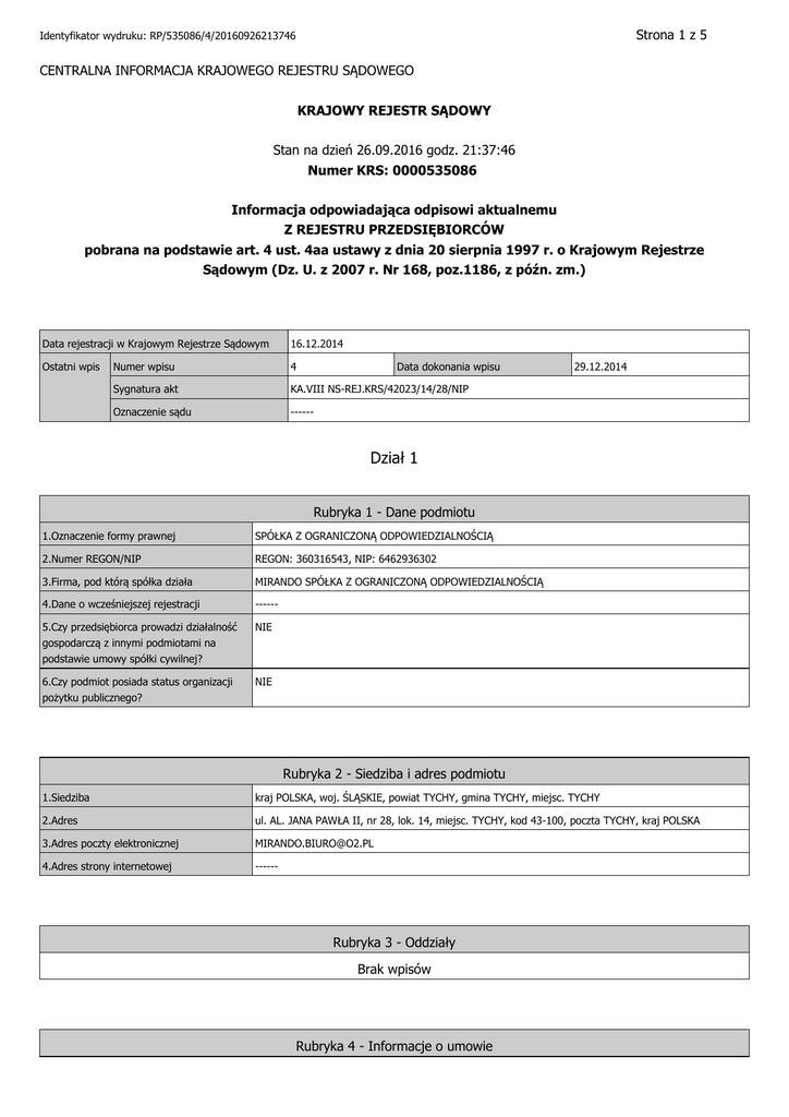 Strona 1 z 5 Identyfikator wydruku: RP/535086/4/20160926213746 CENTRALNA INFORMACJA KRAJOWEGO REJESTRU SĄDOWEGO KRAJOWY REJESTR SĄDOWY Stan na dzień 26.09.2016 godz. 21:37:46 Numer KRS: 0000535086 Informacja odpowiadająca odpisowi aktualnemu Z REJESTRU PRZEDSIĘBIORCÓW pobrana na podstawie art. 4 ust. 4aa ustawy z dnia 20 sierpnia 1997 r. o Krajowym Rejestrze Sądowym (Dz. U. z 2007 r. Nr 168, poz.1186, z późn. zm.) Data rejestracji w Krajowym Rejestrze Sądowym 16.12.2014 Ostatni wpis Numer wpisu 4 Sygnatura akt KA.VIII NS-REJ.KRS/42023/14/28/NIP Oznaczenie sądu ------ Data dokonania wpisu 29.12.2014 Dział 1 Rubryka 1 - Dane podmiotu 1.Oznaczenie formy prawnej SPÓŁKA Z OGRANICZONĄ ODPOWIEDZIALNOŚCIĄ 2.Numer REGON/NIP REGON: 360316543, NIP: 6462936302 3.Firma, pod którą spółka działa MIRANDO SPÓŁKA Z OGRANICZONĄ ODPOWIEDZIALNOŚCIĄ 4.Dane o wcześniejszej rejestracji ------ 5.Czy przedsiębiorca prowadzi działalność gospodarczą z innymi podmiotami na podstawie umowy spółki cywilnej? NIE 6.Czy podmiot posiada status organizacji pożytku publicznego? NIE Rubryka 2 - Siedziba i adres podmiotu 1.Siedziba kraj POLSKA, woj. ŚLĄSKIE, powiat TYCHY, gmina TYCHY, miejsc. TYCHY 2.Adres ul. AL. JANA PAWŁA II, nr 28, lok. 14, miejsc. TYCHY, kod 43-100, poczta TYCHY, kraj POLSKA 3.Adres poczty elektronicznej [email protected] 4.Adres strony internetowej ------ Rubryka 3 - Oddziały Brak wpisów Rubryka 4 - Informacje o umowie Strona 2 z 5 Identyfikator wydruku: RP/535086/4/20160926213746 1.Informacja o zawarciu lub zmianach umowy spółki 1 12.12.2014 R. Rubryka 5 1.Czas, na jaki została utworzona spółka NIEOZNACZONY 2.Oznaczenie pisma innego niż Monitor Sądowy i Gospodarczy, przeznaczonego do ogłoszeń spółki ------ 3.Wspólnik może mieć: WIĘKSZĄ LICZBĘ UDZIAŁÓW 4.Czy statut przyznaje uprawnienia osobiste określonym akcjonariuszom lub tytuły uczestnictwa w dochodach lub majątku spółki nie wynikających z akcji? ***** 5.Czy obligatoriusze mają prawo do udziałów w zysku? ***** Rubryka 6 - Sposób powstania spółki Brak wpisów Rubryka 7 - Dane wspólników 1 1.Nazwisko / Nazwa lub firma BUŁKA 2.Imiona MARIUSZ GRZEGORZ 3.Numer PESEL/REGON 74050916077 4.Numer KRS ***** 5.Posiadane przez wspólnika udziały 98 UDZIAŁÓW O ŁĄCZNEJ WYSOKOŚCI 9.800,00 ZŁ 6.Czy wspólnik posiada całość udziałów spółki? NIE Rubryka 8 - Kapitał spółki 1.Wysokość kapitału zakładowego 10 000,00 ZŁ Podrubryka 1 Informacja o wniesieniu aportu Brak wpisów Rubryka 9 - Nie dotyczy Brak wpisów Rubryka 10 - Nie dotyczy Strona 3 z 5 Identyfikator wydruku: RP/535086/4/20160926213746 Brak wpisów Dział 2 Rubryka 1 - Organ uprawniony do reprezentacji podmiotu 1.Nazwa organu uprawnionego do reprezentowania podmiotu ZARZĄD 2.Sposób reprezentacji podmiotu DO SKŁADANIA OŚWIADCZEŃ W IMIENIU SPÓŁKI JEST UPOWAŻNIONY KAŻDY Z CZŁONKÓW ZARZĄDU SAMODZIELNIE. Podrubryka 1 Dane osób wchodzących w skład organu 1 1.Nazwisko / Nazwa lub Firma BUŁKA 2.Imiona MARIUSZ GRZEGORZ 3.Numer PESEL/REGON 74050916077 4.Numer KRS **** 5.Funkcja w organie reprezentującym PREZES ZARZĄDU 6.Czy osoba wchodząca w skład zarządu została zawieszona w czynnościach? NIE 7.Data do jakiej została zawieszona ------ Rubryka 2 - Organ nadzoru Brak wpisów Rubryka 3 - Prokurenci Brak wpisów Dział 3 Rubryka 1 - Przedmiot działalności 1.Przedmiot przeważającej działalności przedsiębiorcy 1 46, 76, Z, SPRZEDAŻ HURTOWA POZOSTAŁYCH PÓŁPRODUKTÓW 2.Przedmiot pozostałej działalności przedsiębiorcy 1 17, , , PRODUKCJA PAPIERU I WYROBÓW Z PAPIERU 2 18, , , POLIGRAFIA I REPRODUKCJA ZAPISANYCH NOŚNIKÓW INFORMACJI 3 33, , , NAPRAWA, KONSERWACJA I INSTALOWANIE MASZYN I URZĄDZEŃ 4 39, 00, Z, DZIAŁALNOŚĆ ZWIĄZANA Z REKULTYWACJĄ I POZOSTAŁA DZIAŁALNOŚĆ USŁUGOWA ZWIĄZANA Z GOSPODARKĄ ODPADAMI 5 42, , , ROBOTY ZWIĄZANE Z BUDOWĄ OBIEKTÓW INŻYNIERII LĄDOWEJ I WODNEJ 6 43, , , ROBOTY BUDOWLANE SPECJALISTYCZNE 7 41, , , ROBOTY BUDOWLANE ZWIĄZANE ZE WZNOSZENIEM BUDYNKÓW 8 96, 09, Z, POZOSTAŁA DZIAŁALNOŚĆ USŁUGOWA, GDZIE INDZIEJ NIESKLASYFIKOWANA 9 38, , , DZIAŁALNOŚĆ ZWIĄZANA ZE ZBIERANIEM, PRZETWARZANIEM I UNIESZKODLIWIANIEM Strona 4 z 5 Identyfikator wydruku: RP/535086/4/20160926213746 ODPADÓW; ODZYSK SUROWCÓW Rubryka 2 - Wzmianki o złożonych dokumentach Brak wpisów Rubryka 3 - Sprawozdania grupy kapitałowej Brak wpisów Rubryka 4 - Przedmiot działalności statutowej organizacji pożytku publicznego Brak wpisów Rubryka 5 - Informacja o dniu kończącym rok obrotowy Brak wpisów Dział 4 Rubryka 1 - Zaległości Brak wpisów Rubryka 2 - Wierzytelności Brak wpisów Rubryka 3 - Informacje o oddaleniu wniosku o ogłoszenie upadłości na podstawie art. 13 ustawy z 28 lutego 2003 r. Prawo upadłościowe albo o zabezpieczeniu majątku dłużnika w postępowaniu w przedmiocie ogłoszenia upadłości albo w postępowaniu restrukturyzacyjnym albo po prawomocnym umorzeniu postępowania restrukturyzacyjnego Brak wpisów Rubryka 4 - Umorzenie prowadzonej przeciwko podmiotowi egzekucji z uwagi na fakt, że z egzekucji nie uzyska się sumy wyższej od kosztów egzekucyjnych Brak wpisów Dział 5 Strona 5 z 5 Identyfikator wydruku: RP/535086/4/20160926213746 Rubryka 1 - Kurator Brak wpisów Dział 6 Rubryka 1 - Likwidacja Brak wpisów Rubryka 2 - Informacje o rozwiązaniu lub unieważnieniu spółki Brak wpisów Rubryka 3 - Nie dotyczy Brak wpisów Rubryka 4 - Informacja o połączeniu, podziale lub przekształceniu Brak wpisów Rubryka 5 - Informacja o postępowaniu upadłościowym Brak wpisów Rubryka 6 - Informacja o postępowaniu układowym Brak wpisów Rubryka 7 - Informacje o postępowaniach restrukturyzacyjnych lub o postępowaniu naprawczym Brak wpisów Rubryka 8 - Informacja o zawieszeniu działalności gospodarczej Brak wpisów data sporządzenia wydruku 26.09.2016 adres strony internetowej, na której są dostępne informacje z rejestru: https://ems