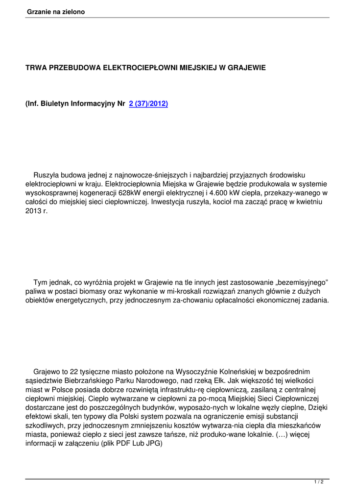 Grzanie na zielono TRWA PRZEBUDOWA ELEKTROCIEPŁOWNI MIEJSKIEJ W GRAJEWIE (Inf. Biuletyn Informacyjny Nr 2 (37)/2012) Ruszyła budowa jednej z najnowocześniejszych i najbardziej przyjaznych środowisku elektrociepłowni w kraju. Elektrociepłownia Miejska w Grajewie będzie produkowała w systemie wysokosprawnej kogeneracji 628kW energii elektrycznej i 4.600 kW ciepła, przekazywanego w całości do miejskiej sieci ciepłowniczej. Inwestycja ruszyła, kocioł ma zacząć pracę w kwietniu 2013 r. Tym jednak, co wyróżnia projekt w Grajewie na tle innych jest zastosowanie „bezemisyjnego” paliwa w postaci biomasy oraz wykonanie w mikroskali rozwiązań znanych głównie z dużych obiektów energetycznych, przy jednoczesnym zachowaniu opłacalności ekonomicznej zadania. Grajewo to 22 tysięczne miasto położone na Wysoczyźnie Kolneńskiej w bezpośrednim sąsiedztwie Biebrzańskiego Parku Narodowego, nad rzeką Ełk. Jak większość tej wielkości miast w Polsce posiada dobrze rozwiniętą infrastrukturę ciepłowniczą, zasilaną z centralnej ciepłowni miejskiej. Ciepło wytwarzane w ciepłowni za pomocą Miejskiej Sieci Ciepłowniczej dostarczane jest do poszczególnych budynków, wyposażonych w lokalne węzły cieplne, Dzięki efektowi skali, ten typowy dla Polski system pozwala na ograniczenie emisji substancji szkodliwych, przy jednoczesnym zmniejszeniu kosztów wytwarzania ciepła dla mieszkańców miasta, ponieważ ciepło z sieci jest zawsze tańsze, niż produkowane lokalnie. (…) więcej informacji w załączeniu (plik PDF Lub JPG) 1/2 Grzanie na zielono załączniki 2/2