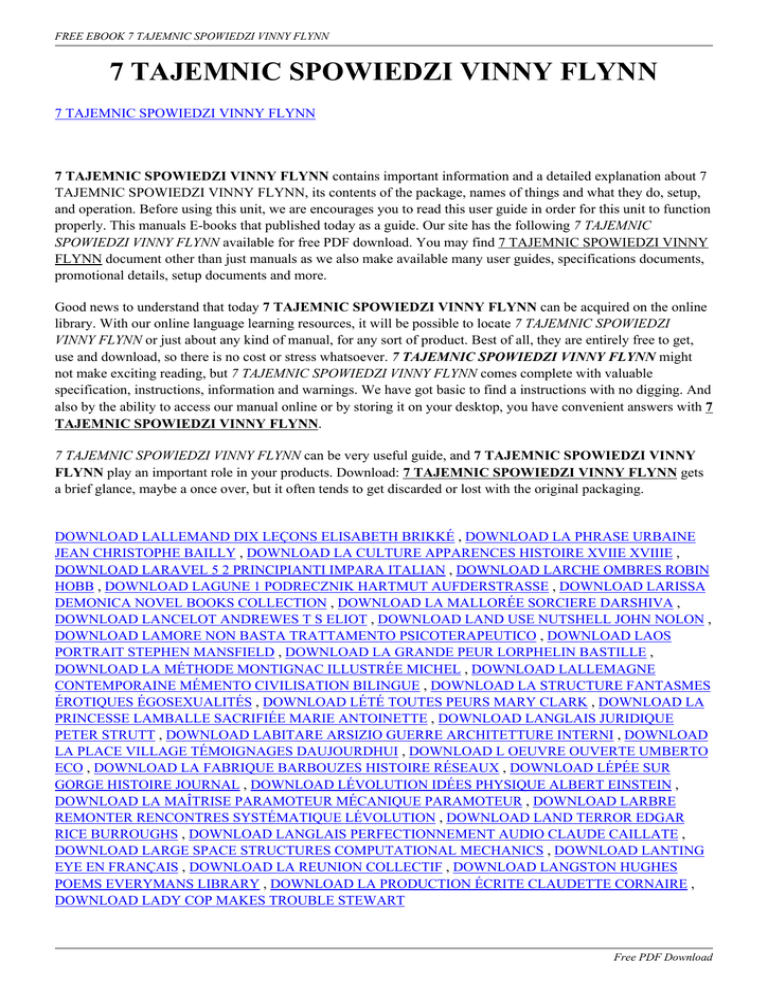 FREE EBOOK 7 TAJEMNIC SPOWIEDZI VINNY FLYNN 7 TAJEMNIC SPOWIEDZI VINNY FLYNN 7 TAJEMNIC SPOWIEDZI VINNY FLYNN 7 TAJEMNIC SPOWIEDZI VINNY FLYNN contains important information and a detailed explanation about 7 TAJEMNIC SPOWIEDZI VINNY FLYNN, its contents of the package, names of things and what they do, setup, and operation. Before using this unit, we are encourages you to read this user guide in order for this unit to function properly. This manuals E-books that published today as a guide. Our site has the following 7 TAJEMNIC SPOWIEDZI VINNY FLYNN available for free PDF download. You may find 7 TAJEMNIC SPOWIEDZI VINNY FLYNN document other than just manuals as we also make available many user guides, specifications documents, promotional details, setup documents and more. Good news to understand that today 7 TAJEMNIC SPOWIEDZI VINNY FLYNN can be acquired on the online library. With our online language learning resources, it will be possible to locate 7 TAJEMNIC SPOWIEDZI VINNY FLYNN or just about any kind of manual, for any sort of product. Best of all, they are entirely free to get, use and download, so there is no cost or stress whatsoever. 7 TAJEMNIC SPOWIEDZI VINNY FLYNN might not make exciting reading, but 7 TAJEMNIC SPOWIEDZI VINNY FLYNN comes complete with valuable specification, instructions, information and warnings. We have got basic to find a instructions with no digging. And also by the ability to access our manual online or by storing it on your desktop, you have convenient answers with 7 TAJEMNIC SPOWIEDZI VINNY FLYNN. 7 TAJEMNIC SPOWIEDZI VINNY FLYNN can be very useful guide, and 7 TAJEMNIC SPOWIEDZI VINNY FLYNN play an important role in your products. Download: 7 TAJEMNIC SPOWIEDZI VINNY FLYNN gets a brief glance, maybe a once over, but it often tends to get discarded or lost with the original packaging. DOWNLOAD LALLEMAND DIX LEÇONS ELISABETH BRIKKÉ , DOWNLOAD LA PHRASE URBAINE JEAN CHRISTOPHE BAILLY , DOWNLOAD LA CULTURE APPARENCES HISTOIRE XVIIE XVIIIE , DOWNLOAD LARAVEL 5 2 PRINCIPIANTI IMPARA ITALIAN , DOWNLOAD LARCHE OMBRES ROBIN HOBB , DOWNLOAD LAGUNE 1 PODRECZNIK HARTMUT AUFDERSTRASSE , DOWNLOAD LARISSA DEMONICA NOVEL BOOKS COLLECTION , DOWNLOAD LA MALLORÉE SORCIERE DARSHIVA , DOWNLOAD LANCELOT ANDREWES T S ELIOT , DOWNLOAD LAND USE NUTSHELL JOHN NOLON , DOWNLOAD LAMORE NON BASTA TRATTAMENTO PSICOTERAPEUTICO , DOWNLOAD LAOS PORTRAIT STEPHEN MANSFIELD , DOWNLOAD LA GRANDE PEUR LORPHELIN BASTILLE , DOWNLOAD LA MÉTHODE MONTIGNAC ILLUSTRÉE MICHEL , DOWNLOAD LALLEMAGNE CONTEMPORAINE MÉMENTO CIVILISATION BILINGUE , DOWNLOAD LA STRUCTURE FANTASMES ÉROTIQUES ÉGOSEXUALITÉS , DOWNLOAD LÉTÉ TOUTES PEURS MARY CLARK , DOWNLOAD LA PRINCESSE LAMBALLE SACRIFIÉE MARIE ANTOINETTE , DOWNLOAD LANGLAIS JURIDIQUE PETER STRUTT , DOWNLOAD LABITARE ARSIZIO GUERRE ARCHITETTURE INTERNI , DOWNLOAD LA PLACE VILLAGE TÉMOIGNAGES DAUJOURDHUI , DOWNLOAD L OEUVRE OUVERTE UMBERTO ECO , DOWNLOAD LA FABRIQUE BARBOUZES HISTOIRE RÉSEAUX , DOWNLOAD LÉPÉE SUR GORGE HISTOIRE JOURNAL , DOWNLOAD LÉVOLUTION IDÉES PHYSIQUE ALBERT EINSTEIN , DOWNLOAD LA MAÎTRISE PARAMOTEUR MÉCANIQUE PARAMOTEUR , DOWNLOAD LARBRE REMONTER RENCONTRES SYSTÉMATIQUE LÉVOLUTION , DOWNLOAD LAND TERROR EDGAR RICE BURROUGHS , DOWNLOAD LANGLAIS PERFECTIONNEMENT AUDIO CLAUDE CAILLATE , DOWNLOAD LARGE SPACE STRUCTURES COMPUTATIONAL MECHANICS , DOWNLOAD LANTING EYE EN FRANÇAIS , DOWNLOAD LA REUNION COLLECTIF , DOWNLOAD LANGSTON HUGHES POEMS EVERYMANS LIBRARY , DOWNLOAD LA PRODUCTION ÉCRITE CLAUDETTE CORNAIRE , DOWNLOAD LADY COP MAKES TROUBLE STEWART Free PDF Download