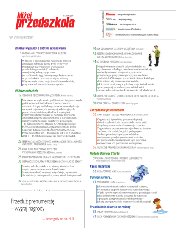 w numerze: Krótkie wykłady o dobrym wychowaniu 6 O rozwijaniu zdolności do uczenia się dzieci Edyta Gruszczyk-Kolczyńska Bliżej przedszkola 12 Pozwólcie dzieciom rozwinąć skrzydła Marta Stasińska │Macarena w wykonaniu publiczności i zaproszonych │gości, opowieści o Indianach Amazońskich, │zabawa z Lippy and Messy, emocjonujące dyskusje │na temat najnowszych koncepcji edukacyjnych, │ponad dwadzieścia wykładów i wystąpień │praktycznych,trzymające w napięciu losowanie │dziesiątek nagród oraz spotkanie z największymi │autorytetami polskiej i światowej pedagogiki │– to tylko niektóre z atrakcji 6. Ogólnopolskiego │FORUM Edukacyjnego, zorganizowanego przez │Centrum Edukacyjne BLIŻEJ PRZEDSZKOLA. │Przez wszystkie dni – trwającego od 6 do 8 kwietnia │2011 r. – FORUM przewijał się motyw skrzydeł. 22 Obserwacja zajęć i czynności wynikających z działalności statutowej przedszkola Barbara Szeląg 24 Nowe regulacje prawne dotyczące wychowania przedszkolnego Ewa Zielińska 28 Odpowiedź Ministra Edukacji Narodowej na list otwarty 33 Zostawić sześciolatka w przedszkolu czy posłać do szkoły? │Szkoła, szkoła, szkoła – to słowo, które bardzo │często pojawia się na ustach rodziców. │Szkoła to radość, znajomi, satysfakcja, wyzwanie, │ale niekiedy także porażka, stres, strach i niepewność. 37 Rola nauczyciela Montessori – rola każdego nauczyciela Joanna Maghen E K L A M A Przed³u¿ prenumeratê – wygraj nagrody bliżej przedszkola 5.116 maj 2011 Miesięcznik Bliżej Przedszkola Sklep BliżejEdukacji.pl Portal blizejprzedszkola.pl Strony internetowe dlaPrzedszkoli.eu Niepubliczna Placówka Doskonalenia Nauczycieli Akademia Edukacji 40 Rok Odkrywania Talentów wciąż trwa Anita Mróz 42 Bezstresowe wychowanie a funkcjonowanie dziecka w przedszkolu Alicja Dorozińska │W trosce o przywrócenie należnego miejsca │dziecięcej zabawie trzeba było w nowych │Podstawach programowych wychowania │przedszkolnego umieścić zalecenie: │co najmniej jedną piątą czasu │(w rozliczeniu tygodniowym) pobytu dziecka │w przedszkolu przeznacza się na zabawę. │W tym czasie dzieci mają bawić się swobodnie, │przy niewielkim udziale nauczyciela. R Centrum Edukacyjne BLIŻEJ PRZEDSZKOLA nr 5.116 maj 2011 szczegó³y na str. 4-5 44 Od swobody do ugody Agnieszka Olczak │Niejednokrotnie dorośli odpowiedzialni za │wychowanie młodego pokolenia zastanawiali się │nad optymalnymi drogami wywierania │pożądanego, pozytywnego wpływu na dzieci │i młodzież. Z licznymi rozterkami niemal każdego │dnia mierzą się zarówno nauczyciele, │jak i rodzice – ci wszyscy, którzy mają świadomość │spoczywającej na nich odpowiedzialności │za przyszłe życiowe funkcjonowanie młodych ludzi. 48 Kiedy czujesz złość, spróbuj dotrzeć do pierwotnego uczucia Violetta Kruczkowska 50 Nowa oferta – dobre efekty Wanda Papugowa Zarządzanie przedszkolem 52 Start małego i dużego przedszkolaka Agnieszka Czeglik │Organizacja i przebieg procesu adaptacji │dzieci trzyletnich do przedszkola może mieć │decydujące znaczenie dla rozwoju dziecka. │Zagadnienie przystosowania jest bardzo istotne │zarówno dla rodziców, jak i pedagogów. │Te dwa podmioty są odpowiedzialne │za charakter przebiegu adaptacji dziecka │do przedszkola. Świadomość tego powinna │zaowocować ich partnerską współpracą. 56 Skuteczne prowadzenie narad i zebrań Monika Urbańska-Bulas Metoda Dobrego Startu 59 wzory literopodobne i piosenki lub wierszyki Marta Bogdanowicz, Aneta Wojnarowska Kącik muzyczny 62 Nie zapomnij o mnie Maria Tomaszewska U progu kariery... 64 Zakończenie stażu Kinga Kurczek │Jakie warunki musi spełnić nauczyciel stażysta, │by otrzymać stopień nauczyciela kontraktowego? │W jaki sposób napisać sprawozdanie z przebiegu stażu? │Jakie dokumenty należy dołączyć do wniosku │o podjęcie postępowania kwalifikacyjnego? │Jak się przygotować do rozmowy kwalifikacyjnej? Przedszkole otwarte na zmiany 68 Zabawy poranne Barbara Bednarczyk 73 Kilka pomysłów na ciekawe przedszkole Natalia Petrynka-Szymańska Edukacja przyrodnicza 77 Poznajemy środowisko Beata Bielska Jak się pokazać? 84 Czas na dobre wiadomości Kinga Szczerba 86 Edycja treści podstron oraz zmiana nazwy Kinga Szczerba 88 LOGO PRZEDSZKOLA Wojciech Wolak Felieton 91 Kto jest kurą? Iwona Majewska-Opiełka │Jedna z bajek Ezopa opowiada o gęsi, która znosiła │swojemu właścicielowi złote jaja – jedno dziennie. │Niestety, rolnik był niecierpliwy, a może raczej chciwy. │Chciał natychmiast dostać wszystkie jajka, │zabił więc gęś i wyjął z niej zalążki złotych jaj │na całe jej gęsie życie. Jednorazowo rzeczywiście │miał więcej tego cennego kruszcu, ale czy możemy │go uznać za człowieka działającego skutecznie? │Raczej nie, zabił wszak gęś, czyli zlikwidował producenta, │a przy tym zyskał znacznie mniej, niż gdyby przez │następne dni codziennie sprzedawał jedno duże jajo. Wasi sojusznicy 94 Liczby nabierają życia 95 system iprzedszkole dla twojej placówki 96 Mother Goose Time Curriculum: czyli co Mama Gąska wie o immersji językowej Magda Sadowska Przygotowanie do nauki czytania 97 zabawy z wyrazami Edyta Kaczanowska 100 Jak pomóc dzieciom zagrożonym dysleksją? Jagoda Cieszyńska-Rożeka Pokochać życie 106 Odkryć świętowanie ks. Mieczysław Maliński Nauczycielka 108 Nauczycielka Michalina Tomaszewska Coraz bliżej 110 Chwalcie łąki umajone... Jerzy Binkowski szukaj gotowych narzędzi na błękitnych stronach magazyn o wychowaniu i edukacji dzieci ADRES REDAKCJI: ul. J. Kostrzewskiego 17, 30-437 Kraków [email protected] 12 631 04 10, 12 262 50 34 ZESPÓŁ REDAKCYJNY: Robert Halik – redaktor naczelny ([email protected]) Marta Stasińska – sekretarz redakcji ([email protected]) Maria Broda-Bajak ([email protected]) Kinga Kurczek 
