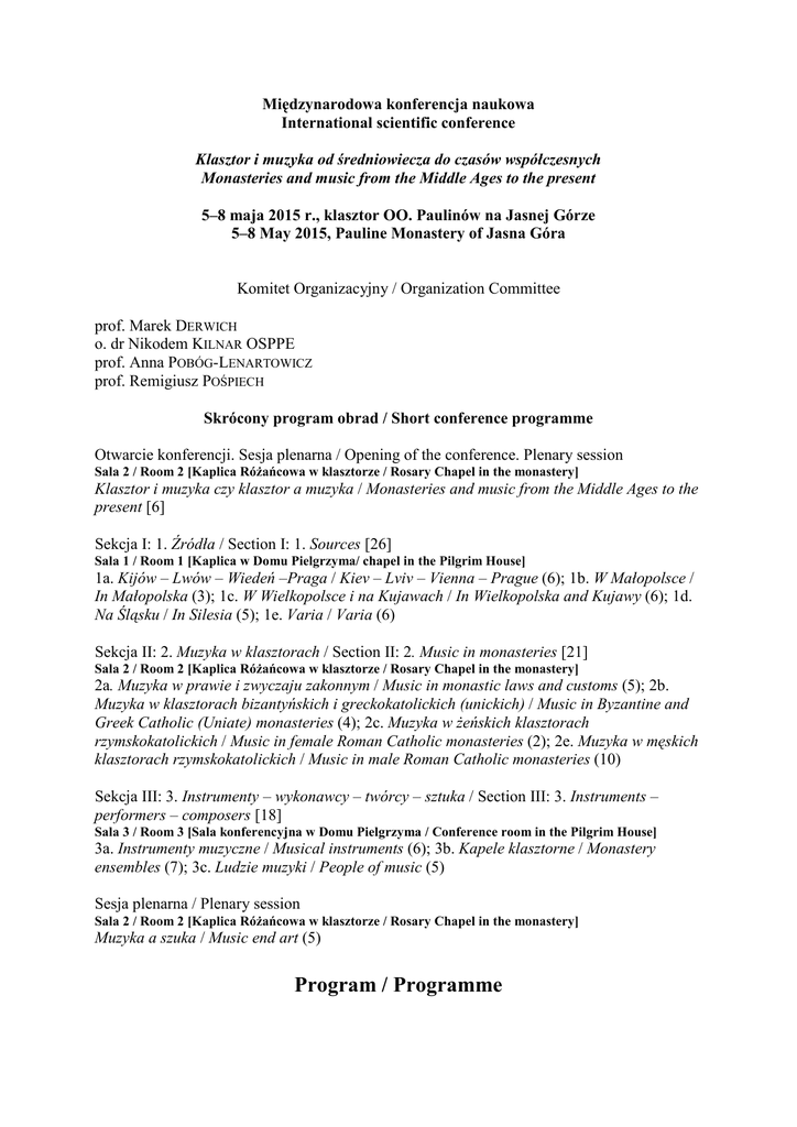 Międzynarodowa konferencja naukowa International scientific conference Klasztor i muzyka od średniowiecza do czasów współczesnych Monasteries and music from the Middle Ages to the present 5–8 maja 2015 r., klasztor OO. Paulinów na Jasnej Górze 5–8 May 2015, Pauline Monastery of Jasna Góra Komitet Organizacyjny / Organization Committee prof. Marek DERWICH o. dr Nikodem KILNAR OSPPE prof. Anna POBÓG-LENARTOWICZ prof. Remigiusz POŚPIECH Skrócony program obrad / Short conference programme Otwarcie konferencji. Sesja plenarna / Opening of the conference. Plenary session Sala 2 / Room 2 [Kaplica Różańcowa w klasztorze / Rosary Chapel in the monastery] Klasztor i muzyka czy klasztor a muzyka / Monasteries and music from the Middle Ages to the present [6] Sekcja I: 1. Źródła / Section I: 1. Sources [26] Sala 1 / Room 1 [Kaplica w Domu Pielgrzyma/ chapel in the Pilgrim House] 1a. Kijów – Lwów – Wiedeń –Praga / Kiev – Lviv – Vienna – Prague (6); 1b. W Małopolsce / In Małopolska (3); 1c. W Wielkopolsce i na Kujawach / In Wielkopolska and Kujawy (6); 1d. Na Śląsku / In Silesia (5); 1e. Varia / Varia (6) Sekcja II: 2. Muzyka w klasztorach / Section II: 2. Music in monasteries [21] Sala 2 / Room 2 [Kaplica Różańcowa w klasztorze / Rosary Chapel in the monastery] 2a. Muzyka w prawie i zwyczaju zakonnym / Music in monastic laws and customs (5); 2b. Muzyka w klasztorach bizantyńskich i greckokatolickich (unickich) / Music in Byzantine and Greek Catholic (Uniate) monasteries (4); 2c. Muzyka w żeńskich klasztorach rzymskokatolickich / Music in female Roman Catholic monasteries (2); 2e. Muzyka w męskich klasztorach rzymskokatolickich / Music in male Roman Catholic monasteries (10) Sekcja III: 3. Instrumenty – wykonawcy – twórcy – sztuka / Section III: 3. Instruments – performers – composers [18] Sala 3 / Room 3 [Sala konferencyjna w Domu Pielgrzyma / Conference room in the Pilgrim House] 3a. Instrumenty muzyczne / Musical instruments (6); 3b. Kapele klasztorne / Monastery ensembles (7); 3c. Ludzie muzyki / People of music (5) Sesja plenarna / Plenary session Sala 2 / Room 2 [Kaplica Różańcowa w klasztorze / Rosary Chapel in the monastery] Muzyka a szuka / Music end art (5) Program / Programme Poniedziałek / Monday, 4.05.2015 Popołudnie i wieczór – przyjazdy uczestników / Afternoon and evening – arrival of participants 1800 Koncert / Concert [Bazylika Jasnogórska / Basilica of Jasna Góra] 2000 Kolacja / Dinner [Restauracja w Domu Pielgrzyma / The restaurant in the Pilgrim House] Codziennie rano zapraszamy chętnych do udziału w mszach porannych w Kaplicy Matki Bożej / All participants are welcome to attend morning masses celebrated every day at Our Lady Chapel: 600, 700, 730 Msze święte konwentualne / Conventual Masses [Kościół / Church 800–840 Msza święta łacińska śpiewana z udziałem Jasnogórskiego Kwartetu Wokalnego „Cantus” / Sung Latin Mass featuring the “Cantus” Jasna Góra Vocal Quartet [Kościół / Church] 700–900 śniadanie / breakfast [Restauracja w Domu Pielgrzyma / The restaurant in the Pilgrim House] Wtorek / Tuesday, 5.05.2015 Pierwszy dzień konferencji / First day of the conference 800–900 Rejestracja uczestników / Registration of participants [Hol wejściowy w Domu Pielgrzyma / The entrance hall in the Pilgrim House] Sesja plenarna / Plenary session Sala 2 / Room 2 [Kaplica Różańcowa w klasztorze / Rosary Chapel in the monastery] Klasztor i muzyka czy klasztor a muzyka / Monasteries and music or monasteries vs. music 900–920 Otwarcie obrad / Opening ceremony 920–940 o. Dominik JURCZAK OP (Rzym), Klasztor dla muzyki czy muzyka dla klasztoru? / Monasteries for music or music for monasteries? 940–1000 o. Roland PREJS OFMCap (Lublin), Od odrzucenia do akceptacji. Ewolucja stosunku do muzyki kościelnej u reformatów i kapucynów w XIX i XX w. / From rejection to acceptance. The evolution of the attitude to music among the Reformati and the Capuchins in the 19th and 20th centuries 1000–1020 ks. Janusz KRÓLIKOWSKI (Tarnów), „Ut mens concordet voci” – reperkusje w wypowiedziach zakonników polskich na temat ducha śpiewu w liturgii / “Ut mens concordet voci” – repercussions in opinions by Polish monastics on the spirit of singing in liturgy 1020–1050 Dyskusja / Discussion 1050–1120 Przerwa na kawę / Coffee break [Holl Kaplicy Różańcowej w klasztorze / The hall of the Rosary Chapel in the monastery] 1120–1140 Czesław GRAJEWSKI (Warszawa), Psalmodia universalis – psalmodia particularis. Kadencja psalmowa jako wyznacznik muzycznej tradycji zakonnej / Psalmodia universalis – psalmodia particularis. The psalmodic cadence as a characteristic of a musical monastic tradition 1140–1200 Krzysztof BRACHA (Warszawa), Zakaz jarmarku na Zielone Świątki pod murami opactwa benedyktynów na Świętym Krzyżu w świetle przywileju z 1468 r. „Musica sacra” a „musica profana” w środowisku klasztornym / The ban on the Whitsun Fair by the walls of the Holy Cross Benedictine Abby in the light of the 1468 privilege. Musica sacra and musica profana in monastic circles 1200–1220 Vaclav KAPSA (Praga), Monasteries as a “target group” for the Prague music printing business in the first third of the 18th century? / Klasztory jako „grupa docelowa” dla oficyn wydających muzykę w pierwszym 30. XVIII w.? 1220–1250 Dyskusja / Discussion 1300–1400 Obiad / Lunch [Restauracja w Domu Pielgrzyma / The restaurant in the Pilgrim House] Sesja popołudniowa (w 3 sekcjach) / Afternoon session (in 3 sections) Sekcja / Section Sekcja / Section I 1. Źródła 1. Sources Sala 1 / Room 1 [Kaplica w Domu Pielgrzyma/ chapel in the Pilgrim House] Sekcja / Section II 2. Muzyka w klasztorach 2. Music in monasteries Sala 2 / Room 2 [Kaplica Różańcowa w klasztorze / Rosary Chapel in the monastery] Sekcja / Section III 3. Instrumenty – wykonawcy – twórcy – sztuka 3. Instruments 
