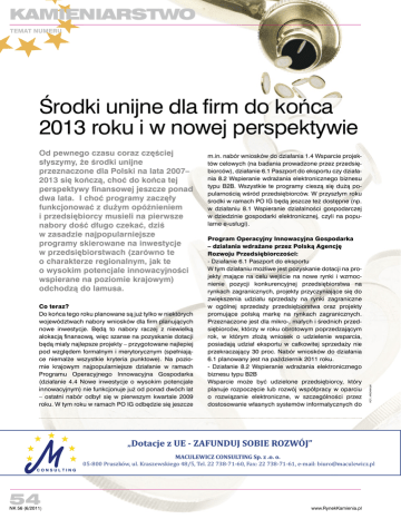 KAMIENIARSTWO TEMAT NUMERU Środki unijne dla firm do końca 2013 roku i w nowej perspektywie Co teraz? Do końca tego roku planowane są już tylko w niektórych województwach nabory wniosków dla firm planujących nowe inwestycje. Będą to nabory raczej z niewielką alokacją finansową, więc szanse na pozyskanie dotacji będą miały najlepsze projekty – przygotowane najlepiej pod względem formalnym i merytorycznym (spełniające niemalże wszystkie kryteria punktowe). Na poziomie krajowym najpopularniejsze działanie w ramach Programu Operacyjnego Innowacyjna Gospodarka (działanie 4.4 Nowe inwestycje o wysokim potencjale innowacyjnym) nie funkcjonuje już od ponad dwóch lat – ostatni nabór odbył się w pierwszym kwartale 2009 roku. W tym roku w ramach PO IG odbędzie się jeszcze m.in. nabór wniosków do działania 1.4 Wsparcie projektów celowych (na badania prowadzone przez przedsiębiorców), działanie 6.1 Paszport do eksportu czy działania 8.2 Wspieranie wdrażania elektronicznego biznesu typu B2B. Wszystkie te programy cieszą się dużą popularnością wśród przedsiębiorców. W przyszłym roku środki w ramach PO IG będą jeszcze też dostępne (np. w działaniu 8.1 Wspieranie działalności gospodarczej w dziedzinie gospodarki elektronicznej, czyli na popularne e-usługi). Program Operacyjny Innowacyjna Gospodarka – działania wdrażane przez Polską Agencję Rozwoju Przedsiębiorczości: - Działanie 6.1 Paszport do eksportu W tym działaniu możliwe jest pozyskanie dotacji na projekty mające na celu wejście na nowe rynki i wzmocnienie pozycji konkurencyjnej przedsiębiorstwa na rynkach zagranicznych, projekty przyczyniające się do zwiększenia udziału sprzedaży na rynki zagraniczne w ogólnej sprzedaży przedsiębiorstwa oraz projekty promujące polską markę na rynkach zagranicznych. Przeznaczone jest dla mikro-, małych i średnich przedsiębiorców, którzy w roku obrotowym poprzedzającym rok, w którym złożą wniosek o udzielenie wsparcia, posiadają udział eksportu w całkowitej sprzedaży nie przekraczający 30 proc. Nabór wniosków do działania 6.1 planowany jest na październik 2011 roku. - Działanie 8.2 Wspieranie wdrażania elektronicznego biznesu typu B2B Wsparcie może być udzielone przedsiębiorcy, który planuje rozpoczęcie lub rozwój współpracy w oparciu o rozwiązanie elektroniczne, w szczególności przez dostosowanie własnych systemów informatycznych do FOT. ARCHIWUM Od pewnego czasu coraz częściej słyszymy, że środki unijne przeznaczone dla Polski na lata 2007– 2013 się kończą, choć do końca tej perspektywy finansowej jeszcze ponad dwa lata. I choć programy zaczęły funkcjonować z dużym opóźnieniem i przedsiębiorcy musieli na pierwsze nabory dość długo czekać, dziś w zasadzie najpopularniejsze programy skierowane na inwestycje w przedsiębiorstwach (zarówno te o charakterze regionalnym, jak te o wysokim potencjale innowacyjności wspierane na poziomie krajowym) odchodzą do lamusa. „Dotacje z UE - ZAFUNDUJ SOBIE ROZWÓJ” MACULEWICZ CONSULTING Sp. z .o. o. 05-800 Pruszków, ul. Kraszewskiego 48/5, Tel. 22 738-71-60, Fax: 22 738-71-61, e-mail: [email protected] 54 NK 56 (6/2011) www.RynekKamienia.pl KAMIENIARSTWO TEMAT NUMERU Lp. 1. 2. 3. 4. województwo / RPO Działanie / Poddziałanie Planowana data naboru Poddziałanie 5.2.1 Wsparcie inwestycji mikroprzedsiębiorstw Ogłoszenie: VIII 2011 r. Działanie 1.1 Dotacje dla nowopowstałych mikroprzedsiębiorstw (prowadzących działalność gospodarczą nie dłużej niż 2 lata) Ogłoszenie: III 2012 r. Działanie 1.2 Dotacje inwestycyjne dla mikroprzedsiębiorstw (prowadzących działalność gospodarczą co najmniej 2 lata) Ogłoszenie: XII 2011 r. Działanie 1.3 Dotacje inwestycyjne dla małych i średnich przedsiębiorstw Ogłoszenie: XII 2012 r. Działanie 1.4 Dotacje inwestycyjne w zakresie dostosowania przedsiębiorstw do wymogów ochrony środowiska oraz w zakresie odnawialnych źródeł energii – schemat A Ogłoszenie: IX 2011 r., IX 2012 r. Działania 1.6 Badania i nowoczesne technologie w strategicznych dla regonu dziedzinach Ogłoszenie: VI 2012 r. Działania 1.7 Wzrost konkurencyjności przedsiębiorstw przez doradztwo Ogłoszenie: XII 2012 r. Działanie 3.2 Podnoszenie innowacyjności i konkurencyjności przedsiębiorstw 16.08. – 21.09.2011 r.: promocja „marek” i produktów regionalnych Działanie 2.1. Rozwój i podniesienie konkurencyjności przedsiębiorstw: Schemat A - Bezpośrednie wsparcie inwestycji w MŚP Ogłoszenie: X 2011 r. -mikroprzedsiębiorstwa Działanie 1.5 Rozwój przedsiębiorczości Ogłoszenie: IX - X 2011 r. (brak w harmonogramie) Działanie 1.2 Rozwiązania innowacyjne w MŚP Ogłoszenie: XII 2011 r. Poddziałanie 1.2.4. Mikro, małe i średnie przedsiębiorstwa 7.09. 2011r. – 7.12.2011 r. Poddziałanie 1.2.3 Innowacje w Mikro- i MŚP 7.01.2012 r. – 7.03.2012 r. woj. kujawsko – pomorskie / RPO WK-P woj. lubelskie / RPO WL woj. łódzkie / RPO WŁ woj. małopolskie / MRPO 5. woj. mazowieckie / RPO WM 6. woj. pomorskie / RPO WP 7. woj. śląskie / RPO WSL Tab. Planowane nabory w ramach RPO www.RynekKamienia.pl systemów informatycznych swoich partnerów w celu umożliwienia automatyzacji wymiany informacji. Dofinansowaniu podlegają projekty o charakterze technicznym, informatycznym i organizacyjnym, które prowadzą do realizacji procesów biznesowych w formie elektronicznej na podstawie umów zawartych z co najmniej dwoma innymi przedsiębiorcami. Nabór wniosków do działania 8.2 planowany jest na październik 2011 roku. Stan realizacji programów O ile na początku okresu programowania, gdy wszyscy oczekujący na pierwsze nabory, widząc wciąż zmieniające się procedury i przesuwane w czasie terminy wejścia w życie nowych regulacji prawnych, obawiali się, czy zdążymy wykorzystać wszystkie przyznane Polsce fundusze, o tyle teraz możemy się pochwalić całkiem niezłą skuteczno