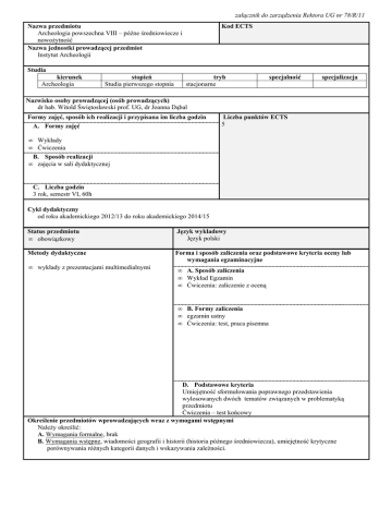 załącznik do zarządzenia Rektora UG nr 78/R/11 Nazwa przedmiotu Archeologia powszechna VIII – późne średniowiecze i nowożytność Nazwa jednostki prowadzącej przedmiot Instytut Archeologii Kod ECTS Studia kierunek Archeologia stopień Studia pierwszego stopnia tryb stacjonarne specjalność specjalizacja Nazwisko osoby prowadzącej (osób prowadzących) dr hab. Witold Świętosławski prof. UG, dr Joanna Dąbal Formy zajęć, sposób ich realizacji i przypisana im liczba godzin A. Formy zajęć Liczba punktów ECTS 5 • Wykłady • Ćwiczenia B. Sposób realizacji • zajęcia w sali dydaktycznej C. Liczba godzin 3 rok, semestr VI, 60h Cykl dydaktyczny od roku akademickiego 2012/13 do roku akademickiego 2014/15 Status przedmiotu • obowiązkowy Język wykładowy Język polski Metody dydaktyczne Forma i sposób zaliczenia oraz podstawowe kryteria oceny lub wymagania egzaminacyjne • wykłady z prezentacjami multimedialnymi • A. Sposób zaliczenia • Wykład Egzamin • Ćwiczenia: zaliczenie z oceną • B. Formy zaliczenia • egzamin ustny • Ćwiczenia: test, praca pisemna D. Podstawowe kryteria Umiejętność sformułowania poprawnego przedstawienia wylosowanych dwóch tematów związanych w problematyką przedmiotu Ćwiczenia – test końcowy Określenie przedmiotów wprowadzających wraz z wymogami wstępnymi Należy określić: A. Wymagania formalne, brak B. Wymagania wstępne, wiadomości geografii i historii (historia późnego średniowiecza), umiejętność krytyczne porównywania różnych kategorii danych i wskazywania zależności. Cele przedmiotu Zapoznanie studenta z podstawowymi problemami archeologii późnego średniowiecza i nowożytności ogólnoeuropejskiego i polskiego. Treści programowe W tym polu umieszcza się jasną i zwięzłą prezentację treści realizowanych podczas zajęć, przy czym uwzględnia się podział na poszczególne formy zajęć, na przykład: A. Problematyka wykładu Przedstawienie podstawowych zagadnień dotyczących możliwości poznawczych archeologii w badaniach nad kulturą materialną późnośredniowiecznej i nowożytnej Polski: 1. Specyfika i zakres zainteresowań archeologów późnym średniowieczem i czasami nowożytnymi. 2. Przełom wczesnego i późnego średniowiecza – przemiany cywilizacyjne. 3. Podstawy bytu: pozyskiwanie surowców organicznych. 4. Podstawy bytu: przetwórstwo surowców organicznych. 5. Podstawy bytu: pozyskiwanie surowców mineralnych. 6. Podstawy bytu: przetwórstwo surowców mineralnych. 7. Osadnictwo wiejskie. Wieś i folwark. 8. Osadnictwo wiejskie. Budownictwo mieszkalne, gospodarcze i przemysłowe. 9. Miasto: początki miast na ziemiach polskich - ośrodki wczesnomiejskie i miasta lokacyjne. 10. Miasto: struktura, budownictwo miejskie, socjotopografia. 11. Budownictwo obronne: grody, gródki stożkowate, dwory obronne. 12. Budownictwo obronne: zamki, fortyfikacje. 13. Archeologia zespołów sakralnych. 14. Archeologia przemysłowa. 15. Archeologia prawna. 16. Archeologia dokumentująca martyrologię narodu polskiego w XX w. B. Problematyka ćwiczeń 1. Rozwój osadnictwa wiejskiego i obszarów miejskich w okresie od późnego średniowiecza do czasów nowożytnych. 2. Fortyfikacje miejskie od średniowiecza do czasów nowożytnych. 3. Budynki użyteczności publicznej, kościoły, budownictwo mieszkalne ogrody w okresie od późnego średniowiecza do czasów nowożytnych. 4-5. Budownictwo w okresie od późnego średniowiecza do czasów nowożytnych. Detale architektoniczne. 6. Kafle, płytki posadzkowe oraz flizy 7. Transport w okresie od późnego średniowiecza do czasów nowożytnych. 8. Organizacja rzemiosła. Kultura materialna (teoria i przykłady) 9. Naczynia ceramiczne (1) 10. Naczynia ceramiczne (2) 11. Wyroby szklane. 12-13. Narzędzia i osprzęt 14. Ozdoby i przedmioty toaletowe. 15. Wyroby fajczarskie. Wykaz literatury A. Literatura wymagana do ostatecznego zaliczenia zajęć (zdania egzaminu): Braudel F., Kultura materialna, gospodarka, kapitalizm XV-XVIII wiek, Warszawa 1992. Historia kultury materialnej Polski w zarysie, red. W. Hensel, J. Pazdur, t. II-IV, Wrocław-Warszawa-Kraków-Gdańsk 1978. Kajzer L., Wstęp do badań archeologiczno-architektonicznych, Łódź 1984. Kajzer L., Zamki i społeczeństwo. Przemiany architektury i budownictwa obronnego w Polsce X-XVIII wieku, Łódź 1993. Kowalski M. K., Artefakty jako źródła poznania, Gdańsk 1996. Maisel W., Archeologia prawna Polski, Warszawa-Poznań 1982. Maisel W. Archeologia prawna Europy, Warszawa-Poznań 1989. Rębkowski M., Pierwsze lokacje miast w księstwie zachodniopomorskim. Przemiany przestrzenne i kulturowe, Kołobrzeg 2001. Tabaczyński S., Archeologia średniowieczna. Problemy. Źródła. Metody. Cele badawcze, Wrocław 1987. Ćwiczenia: Archeologia Gdańska t III, red. H. Paner, Gdańsk 2007(wybrane zagadnienia). Archeologia Gdańska t IV, red. H. Paner, Gdańsk 2010 (wybrane zagadnienia). Gdańsk jego dzieje i kultura, red. A. Czeszunist, Gdańsk 1969 (wybrane zagadnienia) Historia kultury materialnej Polski w zarysie, red. W. Hensel, J. Pazdur, t. II-IV, Wrocław-Warszawa-Kraków-Gdańsk 1978. Historia Płocka w ziemi zapisana. Podsumowanie wyników badań archeologicznych, red. A. Gołembnik, Płock 2000 (wybrane zagadnienia). Kajzer L., Wstęp do badań archeologiczno-architektonicznych, Łódź 1984. Koch W., Style w architekturze, Warszawa 1996 (wybrane zagadnienia) Tabaczyński S., Archeologia średniowieczna. Problemy. Źródła. Metody. Cele badawcze, Wrocław 1987. Wratislavia Antiqua t.6, Wrocław na przełomie średniowiecza i nowożytności, red. K. Wachowski, Wrocław 2004 (wybrane zagadnienia). B. Literatura uzupełniająca Kiersnowski R., Wstęp do numizmatyki polskiej wieków średnich, Warszawa 1964. Jakimowicz T., Dwór murowany w Polsce w XVI wieku, Warszawa-Poznań 1969. Kajzer L., Dwory w Polsce, Warszawa 2010. Mikołajczyk A., Geneza i rozwój nowożytnej monety polskiej, 