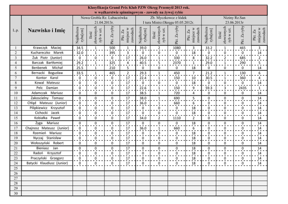 Klasyfikacja Grand Prix Klub PZW Okręg Przemyśl 2013 rok. w wędkarstwie spinningowym - zawody na żywej rybie Nowa Grobla Rz. Lubaczówka Zb. Myczkowce z łódek 21.04.2013r. I tura Mistrz.Okręgu 05.05.2012r. L.p. Nazwisko i Imię Najdłuższa ryba[cm] Ilość złowionych ryb w szt. Pkt. Za ryby Pkt. Za miejsce w zawodach Najdłuższa ryba[cm] Ilość złowionych ryb w szt. Pkt. Za ryby Pkt. Za miejsce w zawodach Najdłuższa ryba[cm] Ilość złowionych ryb w szt. Pkt. Za ryby Pkt. Za miejsce w zawodach Niziny Rz.San 23.06.2013r 1 2 3 4 5 6 7 8 9 10 11 12 13 14 15 16 17 18 19 20 21 22 23 24 25 26 27 28 29 30 Krawczyk Maciej Kuchareczko Marek Żuk Piotr (Junior) Barczak Bartłomiej Benbenek Michał Bernacki Bogusław Kontor Karol Kowal Mateusz Pelc Damian Adamczak Mariusz Zakoscielny Tomasz Chłąd Mateusz (Junior) Pilipkiewicz Krzysztof Cichocki Jacek Kobiałka Paweł Żyga Mariusz Chajnosz Mateusz (Junior) Rzemień Mariusz Nyczaj Stanisław Wołoszyński Robert Bieniasz Jan Radoń Krzysztof Praczyński Grzegorz Batycki Klaudiusz (Junior) 34.5 32.0 0 29.2 25.5 33.5 0 0 0 0 0 0 0 0 0 0 0 0 0 0 0 0 0 0 1 1 0 1 1 1 0 0 0 0 0 0 0 0 0 0 0 0 0 0 0 0 0 0 500 395 0 325 210 465 0 0 0 0 0 0 0 0 0 0 0 0 0 0 0 0 0 0 1 3 17 4 5 2 17 17 17 17 17 17 17 17 17 17 17 17 17 17 17 17 17 17 39.0 0 26.0 40.5 0 29.3 22.4 0 22.6 38.5 38.0 36.0 0 0 34.0 0 36.0 0 0 0 0 0 0 0 2 0 1 5 0 1 1 0 1 1 1 1 0 0 2 0 1 0 0 0 0 0 0 0 1080 0 330 2370 0 450 150 0 150 720 690 660 0 0 1110 0 660 0 0 0 0 0 0 0 3 18 8 1 18 7 10 18 9 4 5 6 18 18 2 18 6 18 18 18 18 18 18 18 33.2 0 32.2 29.0 0 21.2 30.5 0 59.3 0 0 0 0 0 0 0 0 0 0 0 0 0 0 0 1 0 2 1 0 1 1 0 3 0 0 0 0 0 0 0 0 0 0 0 0 0 0 0 465 0 685 290 0 130 360 0 2435 0 0 0 0 0 0 0 0 0 0 0 0 0 0 0 3 14 2 5 14 6 4 14 1 14 14 14 14 14 14 14 14 14 14 14 14 14 14 14 Ilość złowionych ryb w szt. Pkt. Za ryby Pkt. Za miejsce w zawodach Najdłuższa ryba[cm] Ilość złowionych ryb w szt. Pkt. Za ryby Pkt. Za miejsce w zawodach Najdłuższa ryba[cm] Ilość złowionych ryb w szt. Pkt. Za ryby Pkt. Za miejsce w zawodach Najdłuższa ryba[cm] Ilość złowionych ryb w szt. Pkt. Za ryby Pkt. Za miejsce w zawodach Iskań rz.San 22.09.2013r Najdłuższa ryba[cm] Michałówka rz.San i rz. Wisznia 14.07.2013r Klasyfikacja Grand Prix Klub PZW Okręg Przemyśl 2013 rok. w wędkarstwie spinningowym - zawody na żywej rybie Krasiczyn rz. San Zb. Myczkowce z łódek II tura mistrz. Okręgu 04.08.2013r. 11.08.2013r. 54.4 37.4 19.0 34.3 25.7 0 28.4 23.6 26.8 63.2 55.0 0 0 22.0 0 0 0 0 0 0 0 0 0 0 2 3 1 1 1 0 2 2 3 3 3 0 0 1 0 0 0 0 0 0 0 0 0 0 1290 1360 70 500 135 0 545 280 590 2030 1720 0 0 70 0 0 0 0 0 0 0 0 0 0 4 3 11 7 9 16 6 8 5 1 2 16 16 10 16 16 16 16 16 16 16 16 16 16 0 39.6 56.7 0 32.2 0 26.1 25.2 0 0 0 28.5 0 0 26.5 0 0 0 0 0 0 0 0 0 0 1 1 0 1 0 2 1 0 0 0 1 0 0 1 0 0 0 0 0 0 0 0 0 0 675 1250 0 430 0 405 185 0 0 0 290 0 0 220 0 0 0 0 0 0 0 0 0 16 2 1 16 3 16 4 7 16 16 16 5 16 16 6 16 16 16 16 16 16 16 16 16 63.0 21.6 20.7 23.6 24.2 20.5 0 19.1 0 19.1 0 23.5 27.5 22.1 0 32.0 0 19.6 0 0 0 0 0 0 7 2 1 5 11 3 0 5 0 1 0 2 1 4 0 1 0 1 0 0 0 0 0 0 4190 260 110 590 1150 250 0 390 0 90 0 220 450 360 0 650 0 90 0 0 0 0 0 0 1 8 11 4 2 9 17 6 17 13 17 10 5 7 17 3 17 12 17 17 17 17 17 17 0 32.7 56.7 0 0 0 0 0 0 0 0 0 0 0 0 0 0 0 0 0 0 0 0 0 0 2 1 0 0 0 0 0 0 0 0 0 0 0 0 0 0 0 0 0 0 0 0 0 0 650 1250 0 0 0 0 0 0 0 0 0 0 0 0 0 0 0 0 0 0 0 0 0 10 2 1 10 10 10 10 10 10 10 10 10 10 10 10 10 10 10 10 10 10 10 10 10 Najdłuższa ryba[cm] Ilość złowionych ryb w szt. Pkt. Za ryby Pkt. Za miejsce w zawodach Zbiornik Stary Lubliniec 27.10.2013r. Suma pkt. Zawod nika 50.5 50.7 51.0 18.2 50.5 54.0 24.8 50.5 0 0 20.0 0 58.8 29.6 0 0 0 0 0 0 0 0 0 0 4 9 1 2 3 2 2 2 0 0 3 0 5 6 0 0 0 0 0 0 0 0 0 0 1730 1750 800 140 920 1850 360 890 0 0 240 0 3250 1020 0 0 0 0 0 0 0 0 0 0 4 3 8 11 6 2 9 7 15 15 10 15 1 5 15 15 15 15 0 0 0 0 0 0 16 21 31 31 35 36 43 52 56 57 57 60 62 62 63 74 77 83 NK NK NK NK NK NK