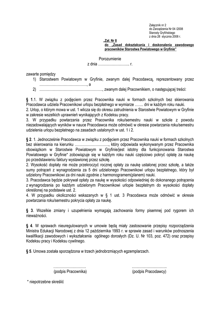 Załącznik nr 2 do Zarządzenia Nr 04 /2008 Starosty Gryfińskiego z dnia 28 stycznia 2008 r. „Zał. Nr 8 do „Zasad dokształcania i doskonalenia zawodowego pracowników Starostwa Powiatowego w Gryfinie” Porozumienie z dnia …………………….. r. zawarte pomiędzy 1) Starostwem Powiatowym w Gryfinie, zwanym dalej Pracodawcą, reprezentowany przez …………………………………, a 2) ……………………………………………., zwanym dalej Pracownikiem, o następującej treści: § 1.1. W związku z podjęciem przez Pracownika nauki w formach szkolnych bez skierowania Pracodawca udziela Pracownikowi urlopu bezpłatnego w wymiarze ……. dni w każdym roku nauki. 2. Urlop, o którym mowa w ust. 1 wlicza się do okresu zatrudnienia w Starostwie Powiatowym w Gryfinie w zakresie wszelkich uprawnień wynikających z Kodeksu pracy. 3. W przypadku powtarzania przez Pracownika roku/semestru nauki w szkole z powodu niezadowalających wyników w nauce Pracodawca może odmówić w okresie powtarzania roku/semestru udzielenia urlopu bezpłatnego na zasadach ustalonych w ust. 1 i 2. § 2. 1. Jednocześnie Pracodawca w związku z podjęciem przez Pracownika nauki w formach szkolnych bez skierowania na kierunku ………………………., który odpowiada wykonywanym przez Pracownika obowiązkom w Starostwie Powiatowym w Gryfinie/jest istotny dla funkcjonowania Starostwa Powiatowego w Gryfinie* zobowiązuje się w każdym roku nauki częściowo pokryć opłatę za naukę po przedstawieniu faktury wystawionej przez szkołę. 2. Wysokość dopłaty nie może przekroczyć rocznej opłaty za naukę ustalonej przez szkołę, a także sumy potrąceń z wynagrodzenia za 5 dni udzielonego Pracownikowi urlopu bezpłatnego, który był udzielony Pracownikowi za dni nauki zgodnie z harmonogramem(planem) nauki. 3. Pracodawca będzie pokrywał opłaty za naukę w wysokości odpowiedniej do dokonanego potrącenia z wynagrodzenia po każdym udzielonym Pracownikowi urlopie bezpłatnym do wysokości dopłaty określonej na podstawie ust. 2. 4. W przypadku okoliczności wskazanych w § 1 ust. 3 Pracodawca może odmówić w okresie powtarzania roku/semestru pokrycia opłaty za naukę. § 3. Wszelkie zmiany i uzupełnienia wymagają zachowania formy pisemnej pod rygorem ich nieważności. § 4. W sprawach nieuregulowanych w umowie będą miały zastosowanie przepisy rozporządzenia Ministra Edukacji Narodowej z dnia 12 października 1993 r. w sprawie zasad i warunków podnoszenia kwalifikacji zawodowych i wykształcenia ogólnego dorosłych (Dz. U. Nr 103, poz. 472) oraz przepisy Kodeksu pracy i Kodeksu cywilnego. § 5. Umowa została sporządzona w trzech jednobrzmiących egzemplarzach. ……………………… (podpis Pracownika) * niepotrzebne skreślić ……………………….. (podpis Pracodawcy)