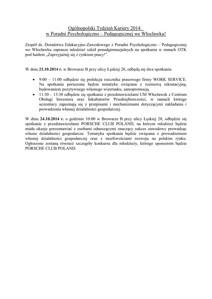 Ogólnopolski Tydzień Kariery 2014 w Poradni Psychologiczno – Pedagogicznej we Włocławku! Zespół ds. Doradztwa Edukacyjno-Zawodowego z Poradni Psychologiczno – Pedagogicznej we Włocławku zaprasza młodzież szkół ponadgimnazjalnych na spotkania w ramach OTK pod hasłem „Zaprzyjaźnij się z rynkiem pracy!”. W dniu 23.10.2014 r. w Browarze B przy ulicy Łęskiej 28, odbędą się dwa spotkania: 9:00 – 11:00 odbędzie się prelekcja rzecznika prasowego firmy WORK SERVICE. Na spotkaniu poruszona będzie tematyka związana z rozmową rekrutacyjną, budowaniem pozytywnego własnego wizerunku, samopromocją. 11:30 – 13:30 odbędzie się spotkanie z przedstawicielami UM Włocławek z Centrum Obsługi Inwestora oraz Inkubatorów Przedsiębiorczości, w ramach którego uczestnicy zapoznają się z przepisami i mechanizmami dotyczącymi zakładania i prowadzenia własnej działalności gospodarczej. W dniu 24.10.2014 r. o godzinie 10:00 w Browarze B przy ulicy Łęskiej 28, odbędzie się spotkanie z przedstawicielami PORSCHE CLUB POLAND, na którym młodzież będzie miała okazje porozmawiać z osobami odnoszącymi znaczący sukces zawodowy prowadząc własne działalności gospodarcze. Tematyka spotkania będzie związana z prowadzeniem własnej działalności gospodarczej oraz z możliwościami rozwoju na polskim rynku. Ogłoszone zostaną również szczegóły konkursu dla młodzieży, którego sponsorem będzie PORSCHE CLUB POLAND.
