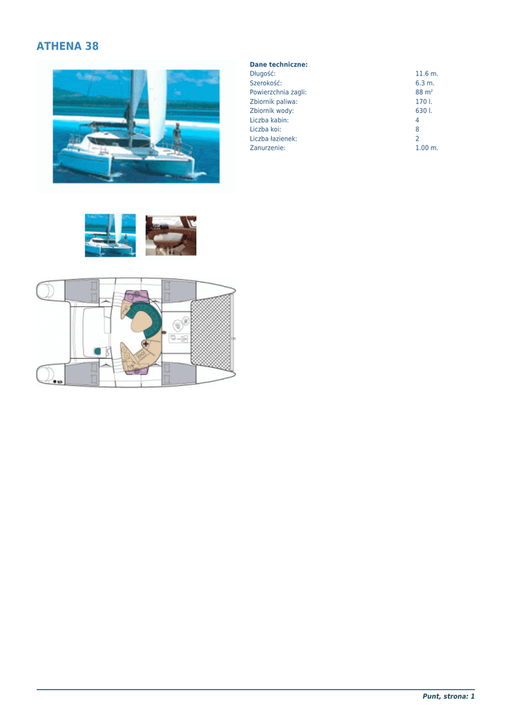 ATHENA 38 Dane techniczne: Długość: Szerokość: Powierzchnia żagli: Zbiornik paliwa: Zbiornik wody: Liczba kabin: Liczba koi: Liczba łazienek: Zanurzenie: 11.6 m. 6.3 m. 88 m2 170 l. 630 l. 4 8 2 1.00 m. Punt, strona: 1