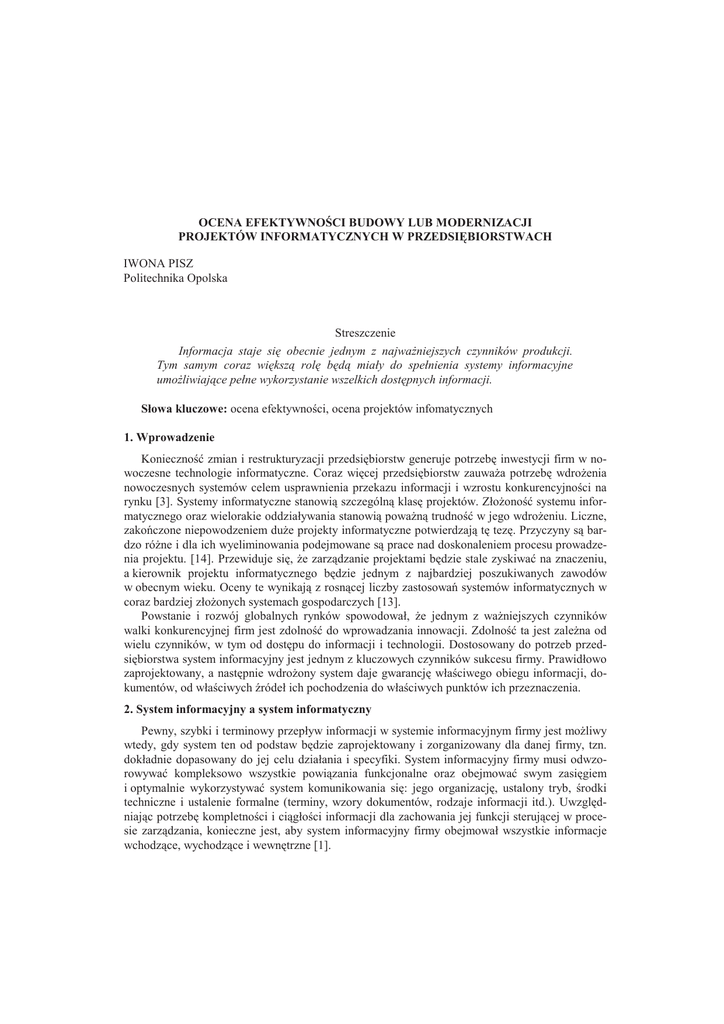 Budowa nowego systemu informatycznego lub modernizacja danego systemu w przedsibiorstwach wymaga przeprowadzenia procesu oceny efektywnoci danego projektu, w tym przypadku